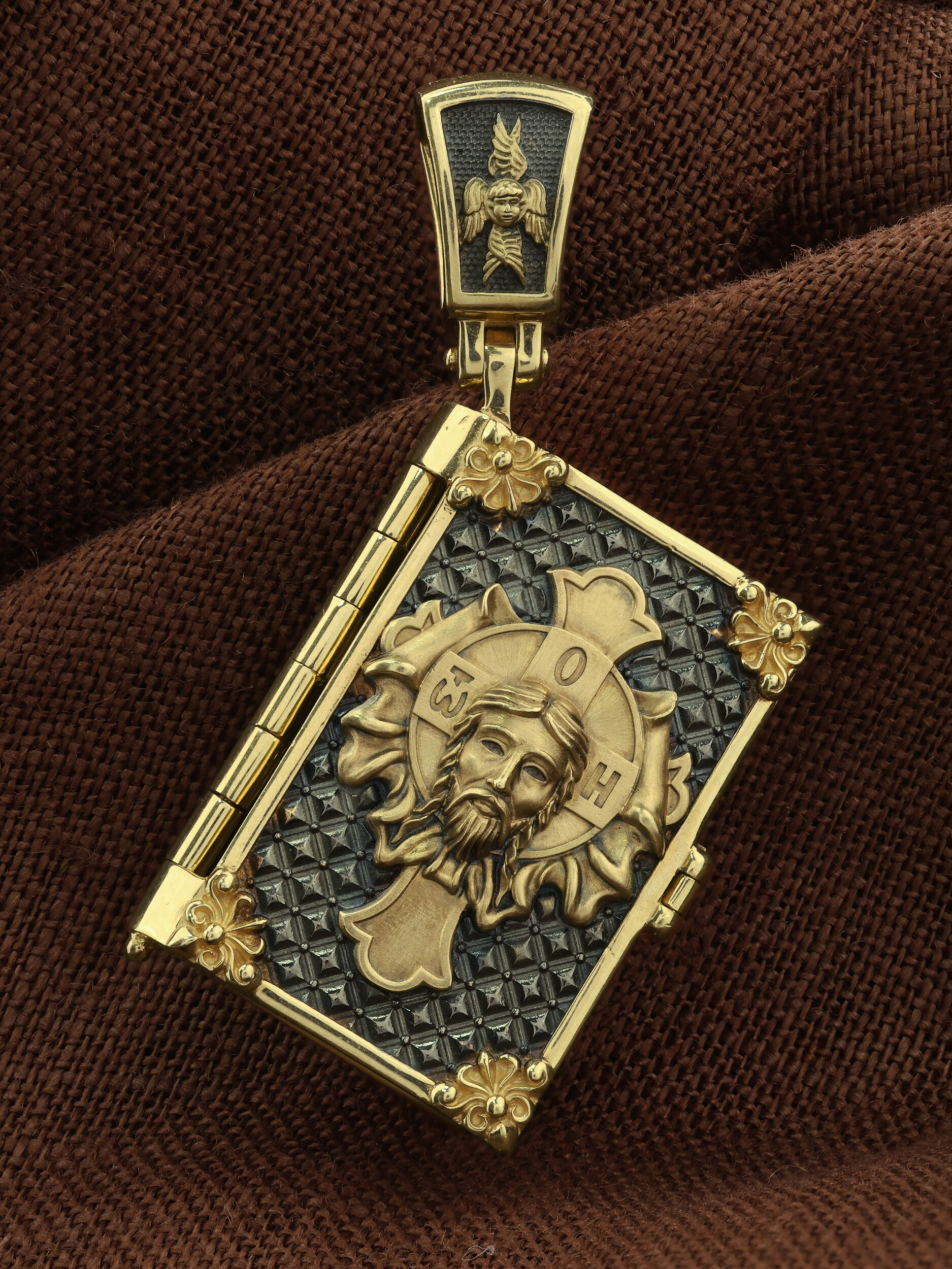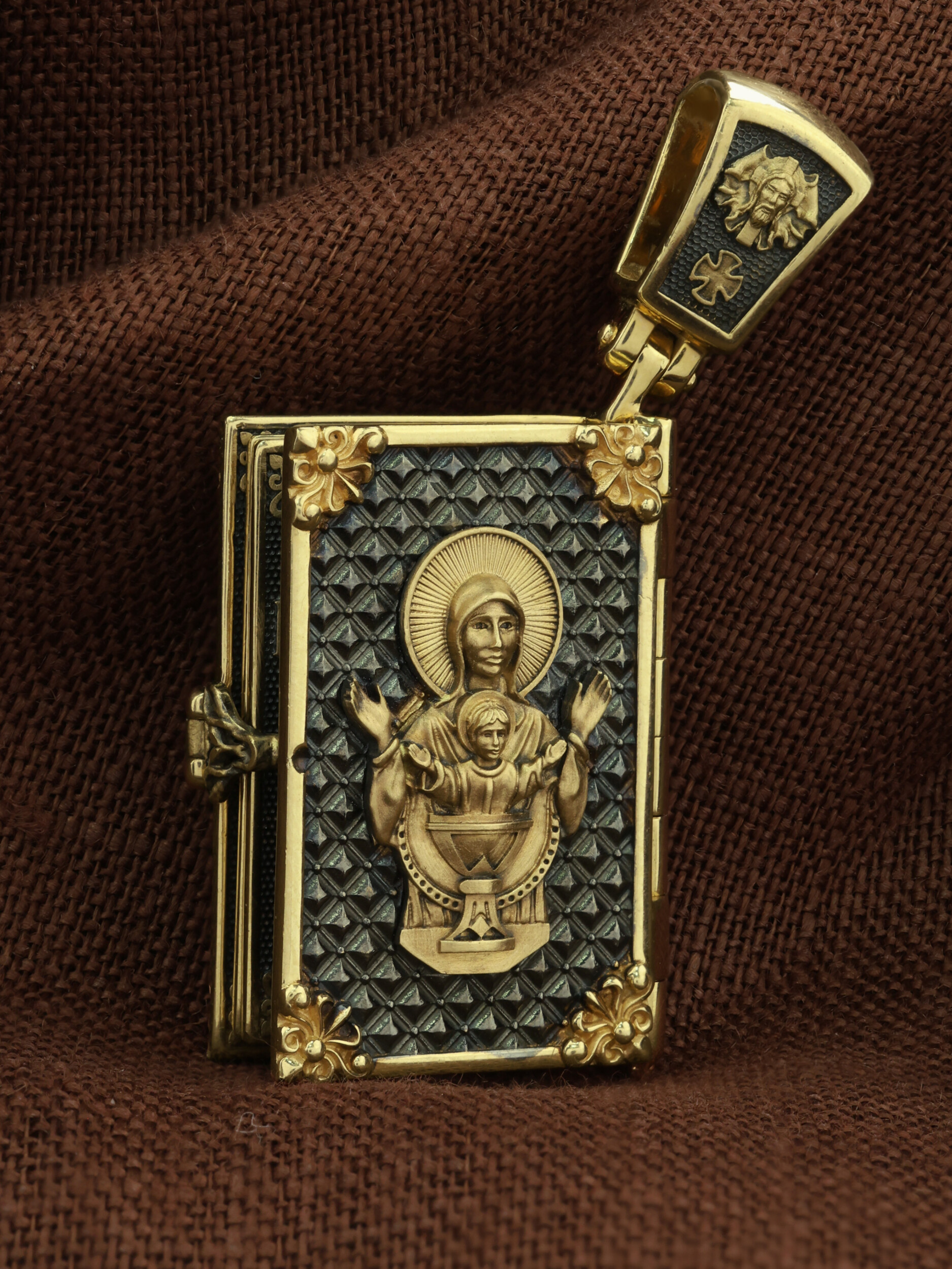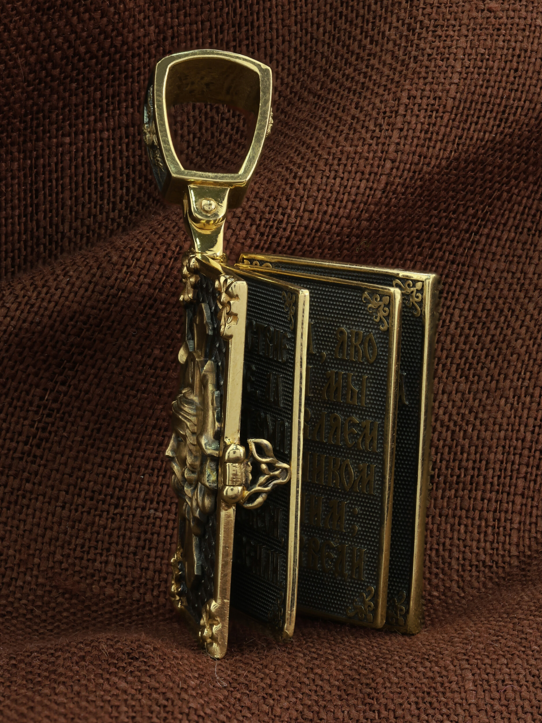 Специальная застежка сбоку скрывает внутреннее содержимое изделия — страницы, на которых выгровированы слова молитвы «Отче наш»: «Отче наш, Иже еси на небесех! Да святится имя Твое, да приидет Царствие Твое, да будет воля Твоя, яко на небеси и на земли. Хлеб наш насущный даждь нам днесь; и остави нам долги наша, яко и мы оставляем должником нашим; и не введи нас в напасть, но избави нас от лукаваго: Яко твое есть царствие и сила и слава во веки. Аминь».