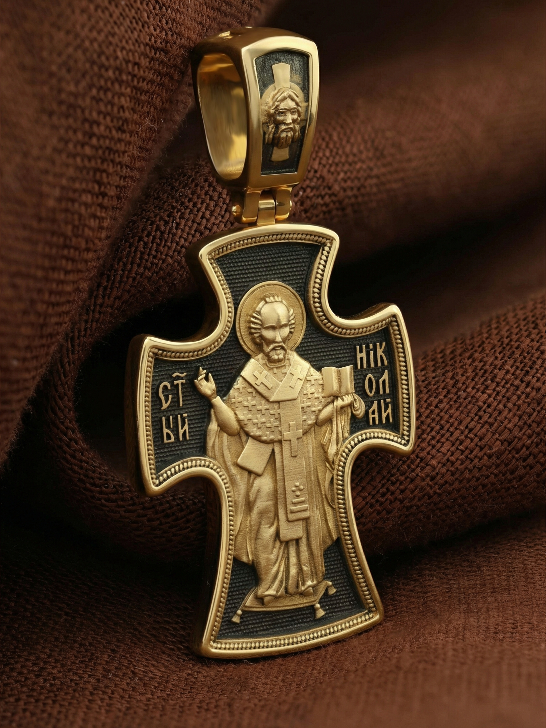 Оборотную сторону креста возглавляет икона святителя Николая Чудотворца, которого еще называют Николай Угодник за то, что он угодил своей жизнью Богу. Николай Чудотворец, помощник в делах, покровитель учащихся, утешитель обиженных. Также Святитель Николай Чудотворец известен своими молитвами за путешественников, когда непрестанный ветер и бушующие волны утихают и корабль заходит в спокойную гавань. На кулонном кольце изображен Спас Нерукотворный — Символ вочеловечившегося Божества и четырехкрылый Херувим.