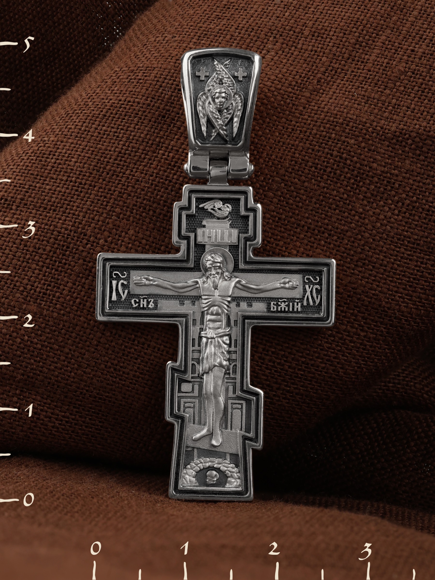 Восьмиконечный нательный крест с Распятием Иисуса Христа на горе Голгофе. Форма этого кресты является одной из самых распространенных на Руси и более всего соответствует тому Кресту, на котором был распят Христос.