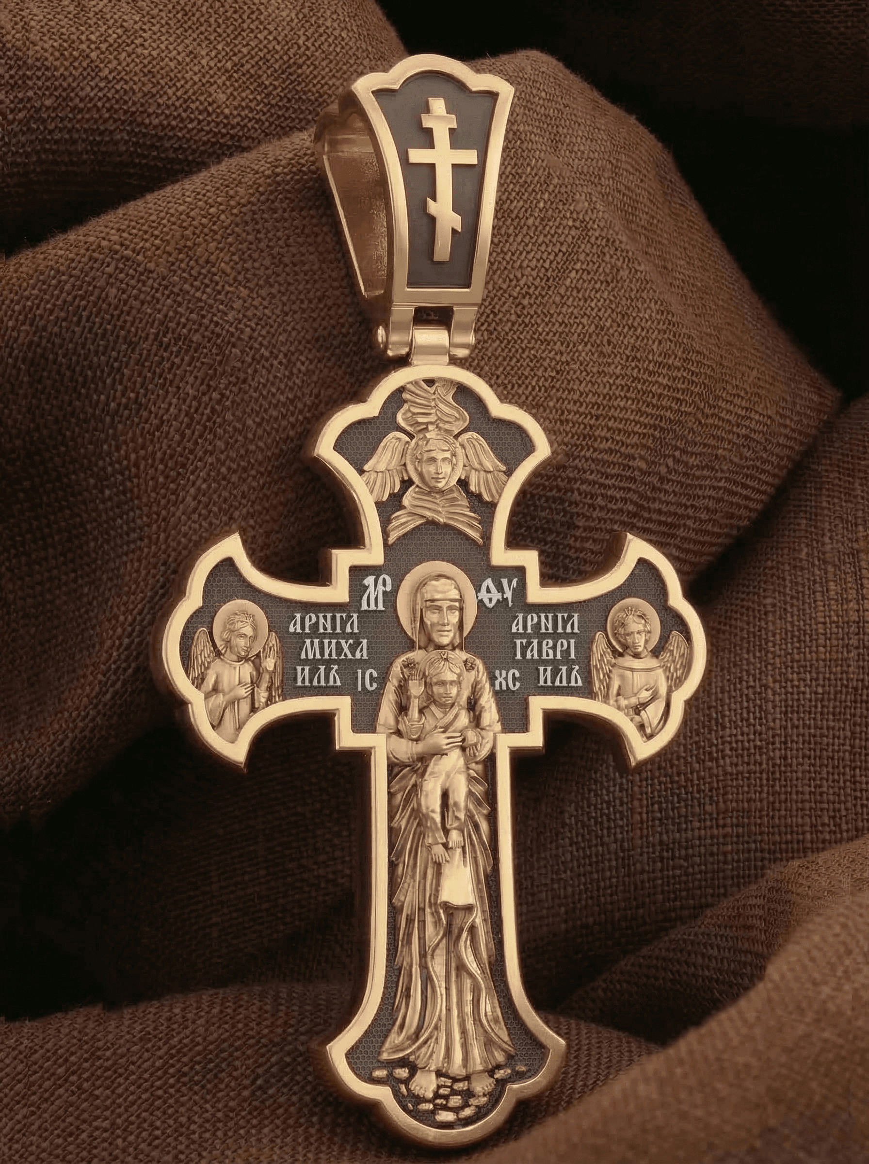 На обратной стороне креста в полный рост изображена Валаамская икона Божией Матери, над которой раскрыл свои крылья серафим. Этот образ написал в 1878 году иеромонах Валаамского монастыря о. Алипий. Валаамскую икону прославили многие чудеса, ее считают целительницей при разных недугах. Перед этим образом Богородицу молят в первую очередь об укреплении веры, просят даровать смирение, твердость в соблюдении заповедей Христовых и об исцелении. Богородице предстоят два архангела, Михаил и Гавриил.