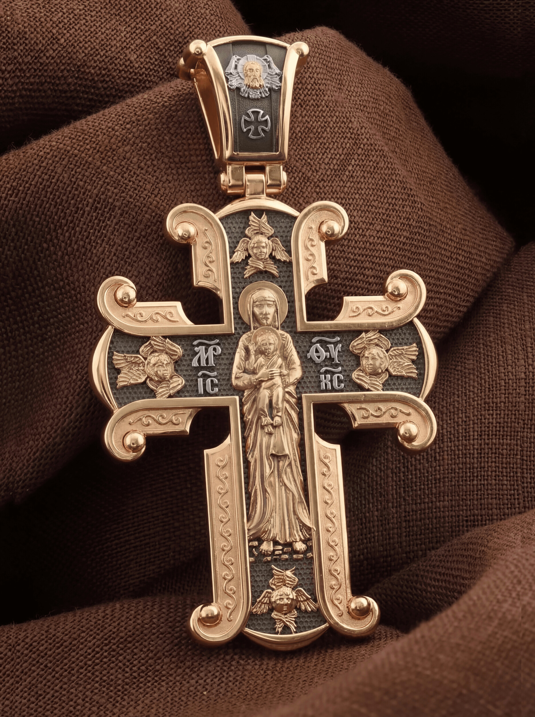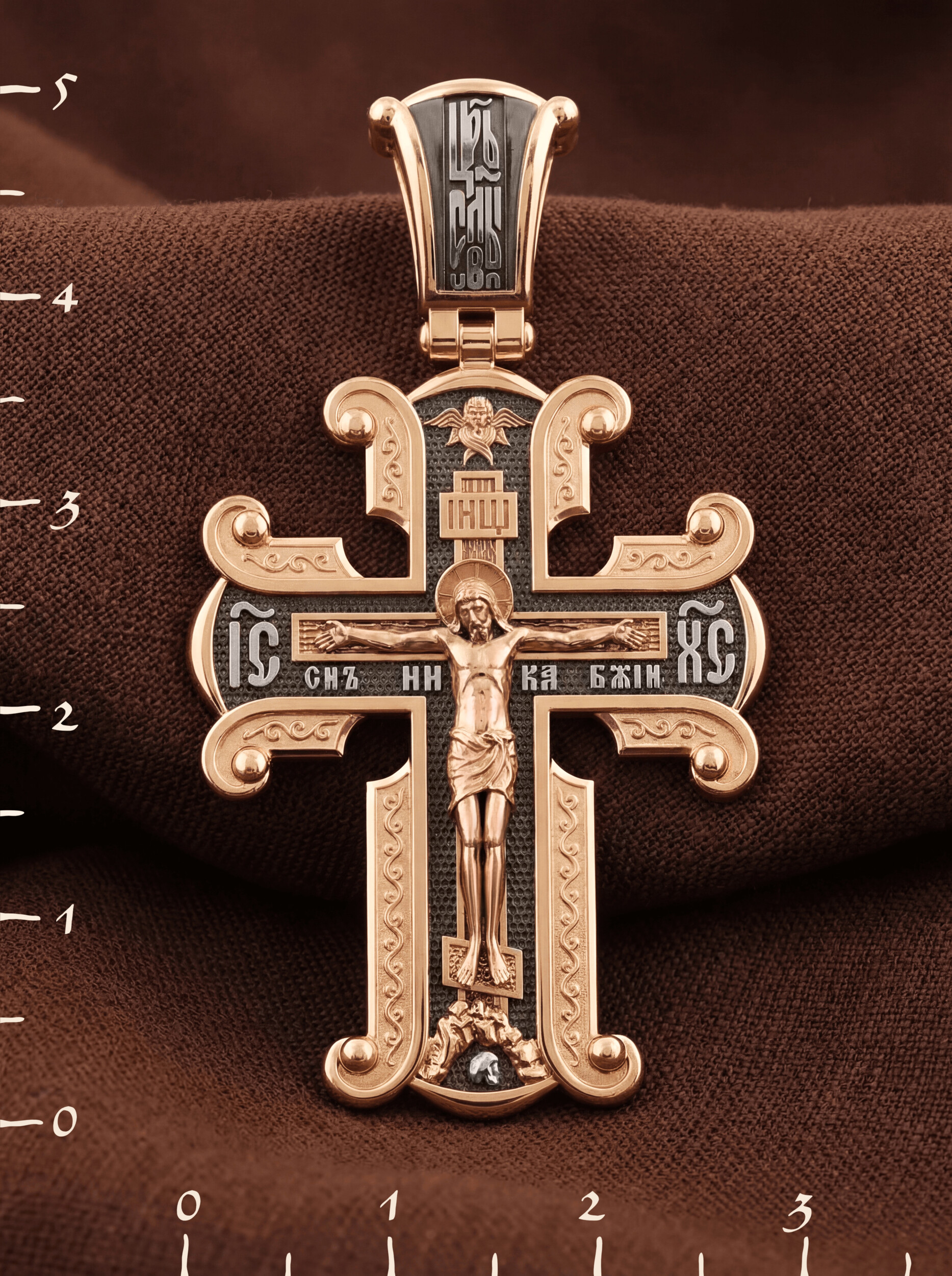На лицевой стороне необычной формы нательного креста мы видим распятие Господне. Сам крест украшен плетением полурастительной тематики и золотым ободком, заканчивающимся завитками. На кулонном кольце с лицевой стороны надпись — Царь Славы. Под ней — шестикрылый огненный серафим, и буквы «IНЦI», означающие Иисус Назорей Царь Иудейский. С обеих сторон горизонтальной перекладины надписи — монограмма Святого имени Христа — «ИС ХС», а под ней — «НИКА» (Победитель) и «Сын Божий». В подножии мы видим изображенную гору Голгофу в виде скалистой горки с Главой Адамовой в пещере.