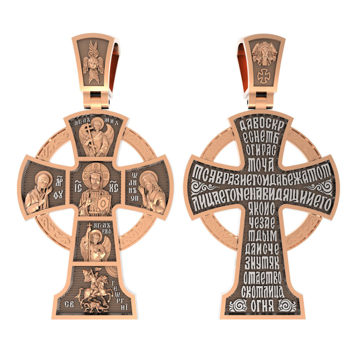 На обороте написан начальный стих оградительной молитвы Честному Кресту Господню: «Да воскреснет Бог, и расточатся врази Его, и да бежат от лица Его ненавидящии Его. Яко исчезает дым, да исчезнут; яко тает воск от лица огня, тако да погибнут беси от лица любящих Бога и знаменующихся крестным знамением, и в веселии глаголющих: радуйся, Пречестный и Животворящий Кресте Господень, прогоняй бесы силою на тебе пропятаго Господа нашего Иисуса Христа, во ад сшедшаго и поправшаго силу диаволю, и даровавшаго нам тебе Крест Свой Честный на прогнание всякаго супостата. О, Пречестный и Животворящий Кресте Господень! Помогай ми со Святою Госпожею Девою Богородицею и со всеми святыми во веки. Аминь».