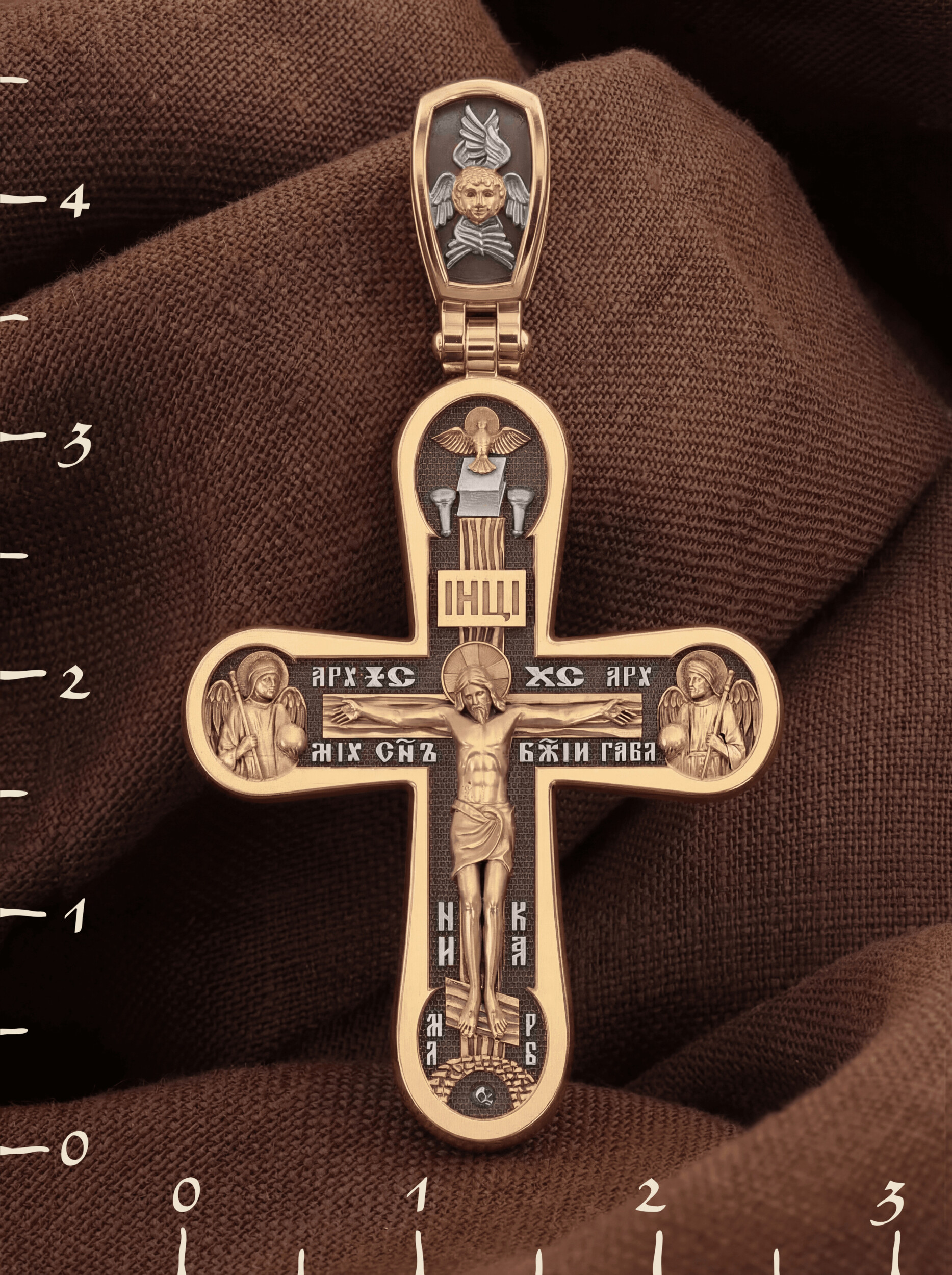 Центральную часть лицевой стороны занимает Распятие Господа Иисуса Христа. Крест стоит на горе камней, символизирующих Голгофу, в основании которой различается череп. Это голова Адама. С обеих стон Его стоят Архангелы: покровитель воинов и всех верных Богу, защитник душ умерших, страж райских ворот — Архистратиг Михаил; и Архангел Гавриил — небесный вестник, покровитель музыкантов и учителей.