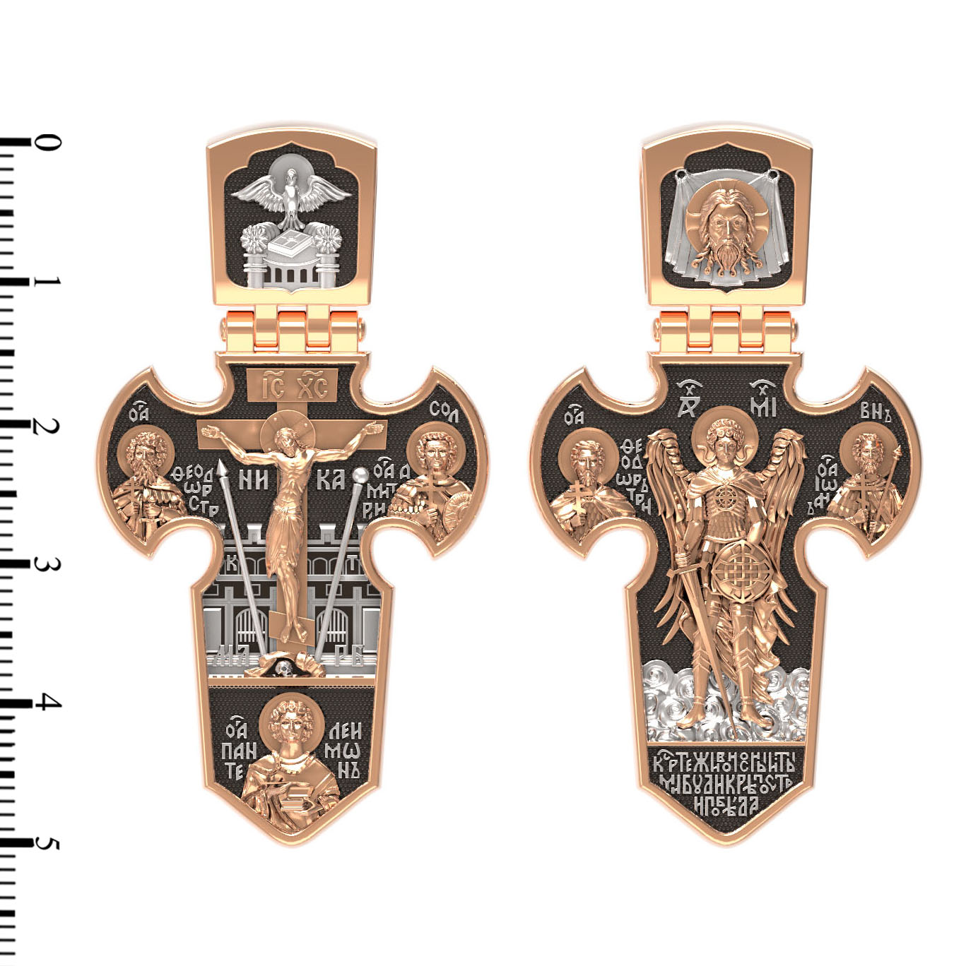 Оборот креста открывается величественной фигурой Архангела Михаила, архистратига Небесного воинства. Его имя означает «Кто яко Бог?», так как он самый могучий и грозный враг зла. С двух сторон от Архистратига Михаила предстоят еще два воина дружины Христовой: великомученик Феодор Тирон и мученик Иоанн Воин. В основании креста молитвенное обращение из Канона, написанного в XIV веке святым монахом Григорием Синаитом: «Кресте Живоносный, ты ми буди крепость и победа». Это молитва воина, восставшего против зла с любовью к ближнему, верой в Бога и надеждой на неизменную помощь Его Небесного Воинства.