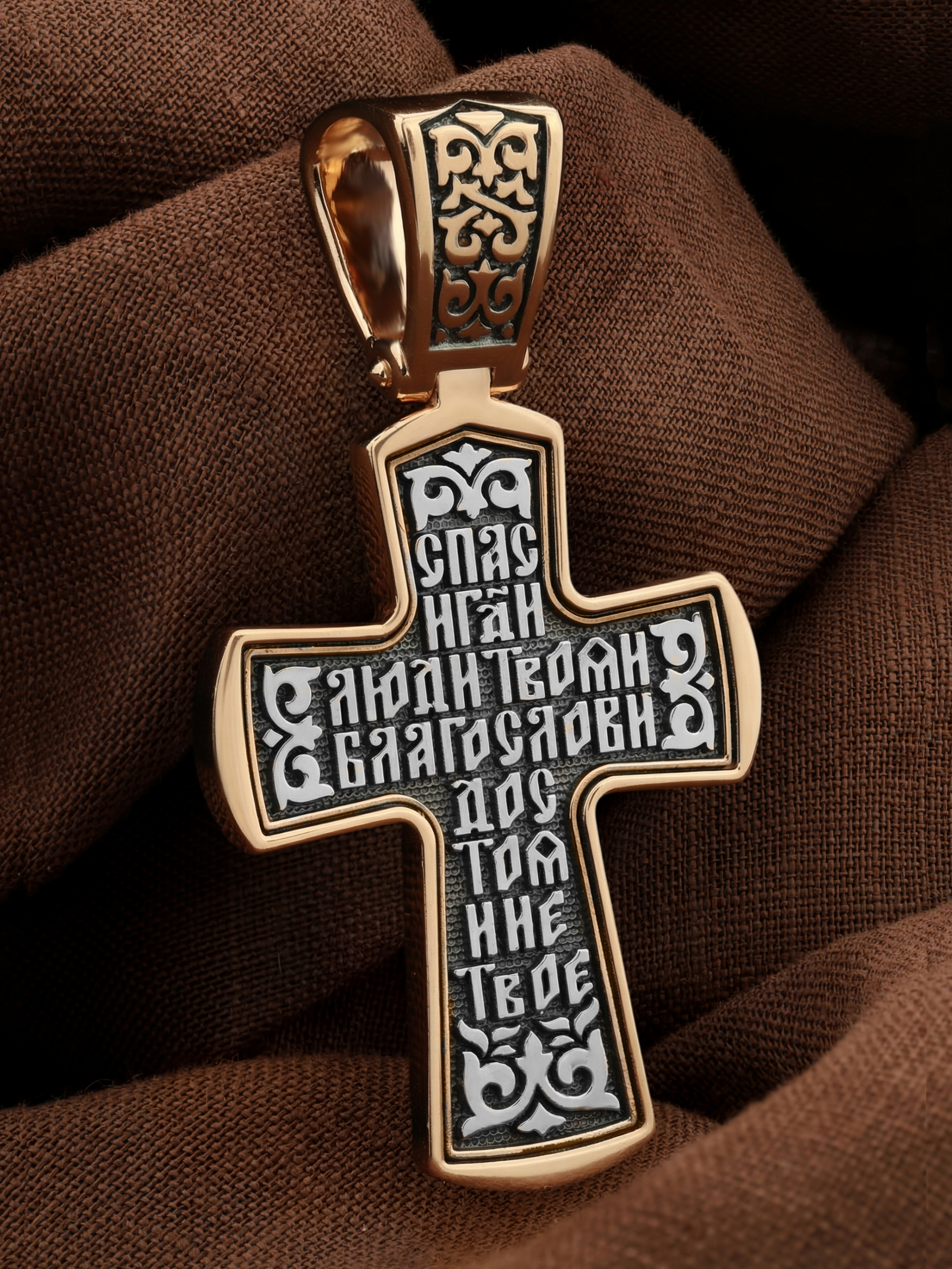 На оборотной стороне креста написан начальный стих тропаря Животворящему Кресту Господню: «Спаси, Господи, люди Твоя и благослови достояние твое…».