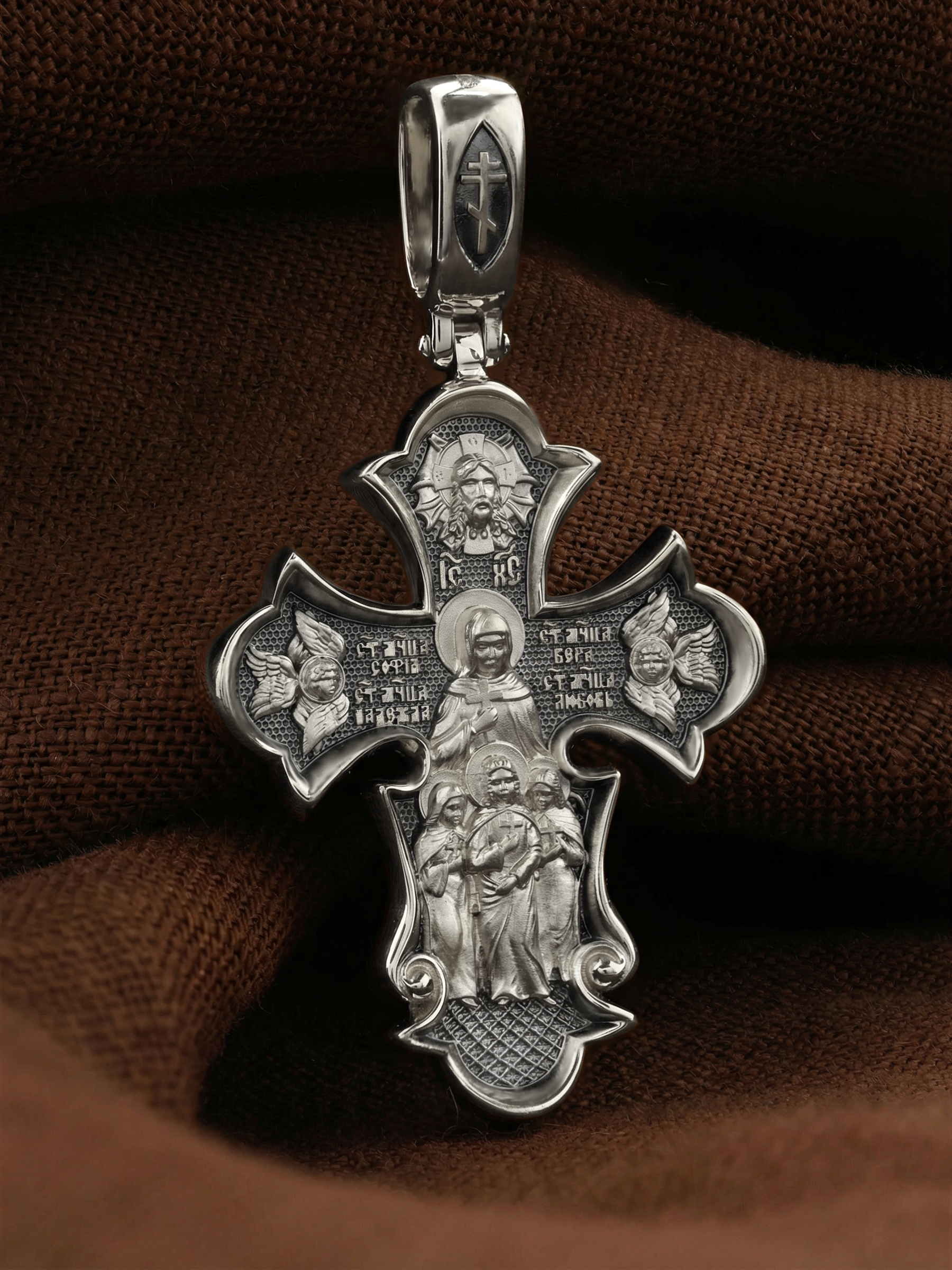 На оборотной стороне креста изображены Святые мученицы Вера, Надежда, Любовь и матерь их София, жившие во 2 веке нашей эры в Римской империи. Известно, что София была родом из Милана. Она рано овдовела, после чего перебралась в Рим. Своих дочерей София воспитывала в христианской вере и даже дала им имена в честь главных христианских добродетелей — Вера, Надежда и Любовь. В те годы римское государство жестоко преследовало верующих во Христа. Маленьких девочек (старшей Вере тогда было всего 12, а младшей Любови лишь 9) арестовали, подвергли истязаниям, а затем умертвили на глазах их матери. Сама София скончалась на следующий день у могилы своих дочерей. Но трагическая судьба на земле обернулась для мучениц вечной славой в ином мире. Церковь причислила их к лику святых и сегодня по молитвам к ним происходят чудеса. Выше образов мучениц изображен Спас Нерукотворный — образ Господа и Спасителя нашего Иисуса Христа, чудесно отпечатавшийся на плате, котором Христос вытер свой лик. По обеим сторонам креста изображены Ангелы Серафимы. На кулонном кольце помещен крест.