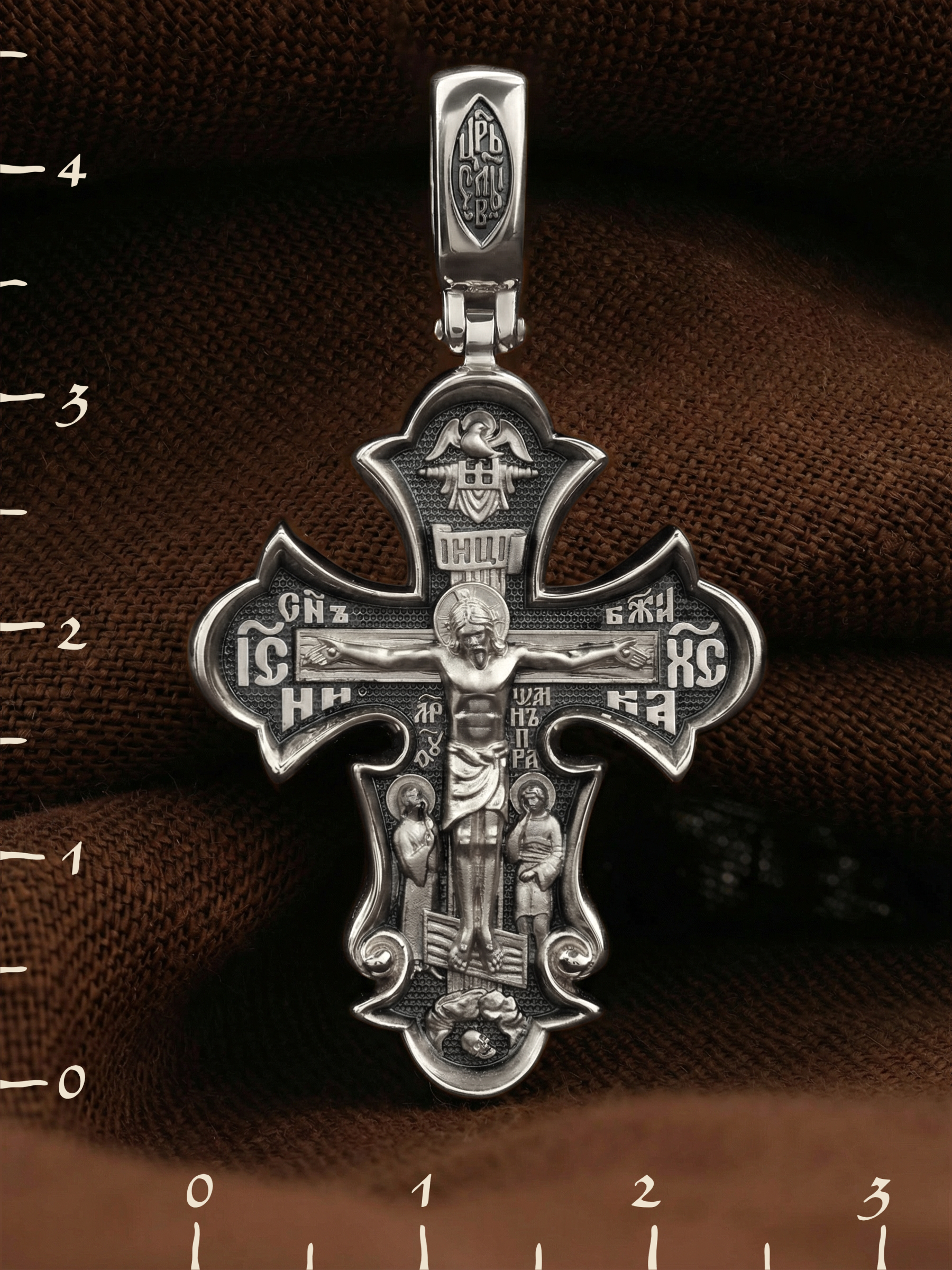 На лицевой стороне креста изображено Распятие Господа и Спасителя нашего Иисуса Христа, отдавшего Себя на смерть, для искупления грехов мира. Крест является символом жертвенной любви всеблагого Бога к падшим людям, всепобеждающим духовным оружием христиан, основанием и средоточием церковной жизни. Верхняя перекладина символизирует титло — табличку, на которой, согласно Евангелию, было начертано: Иисус Назорей Царь Иудейский (IНЦI). Также Распятие сопровождается надписями, олицетворяющими Христа. Надпись «IС» « ХС», что означает Иисус Христос, слово «НИКА», что означает «победитель» и слова «Сын Божий» помещается на разных сторонах поперечной перекладины креста. Над вершиной Распятия помещено изображение Святого Духа в виде голубя. Слева от Распятия изображена Пресвятая Богородица, справа — апостол и евангелист Иоанн Богослов, один из ближайших учеников Иисуса Христа. Возвышение, на котором стоит Крест, символизирует гору Голгофу, на которой произошло Распятие. Под подножием Креста изображена покоящаяся голова (череп) Адама. На кулонном кольце помещена надпись «Царь Славы».