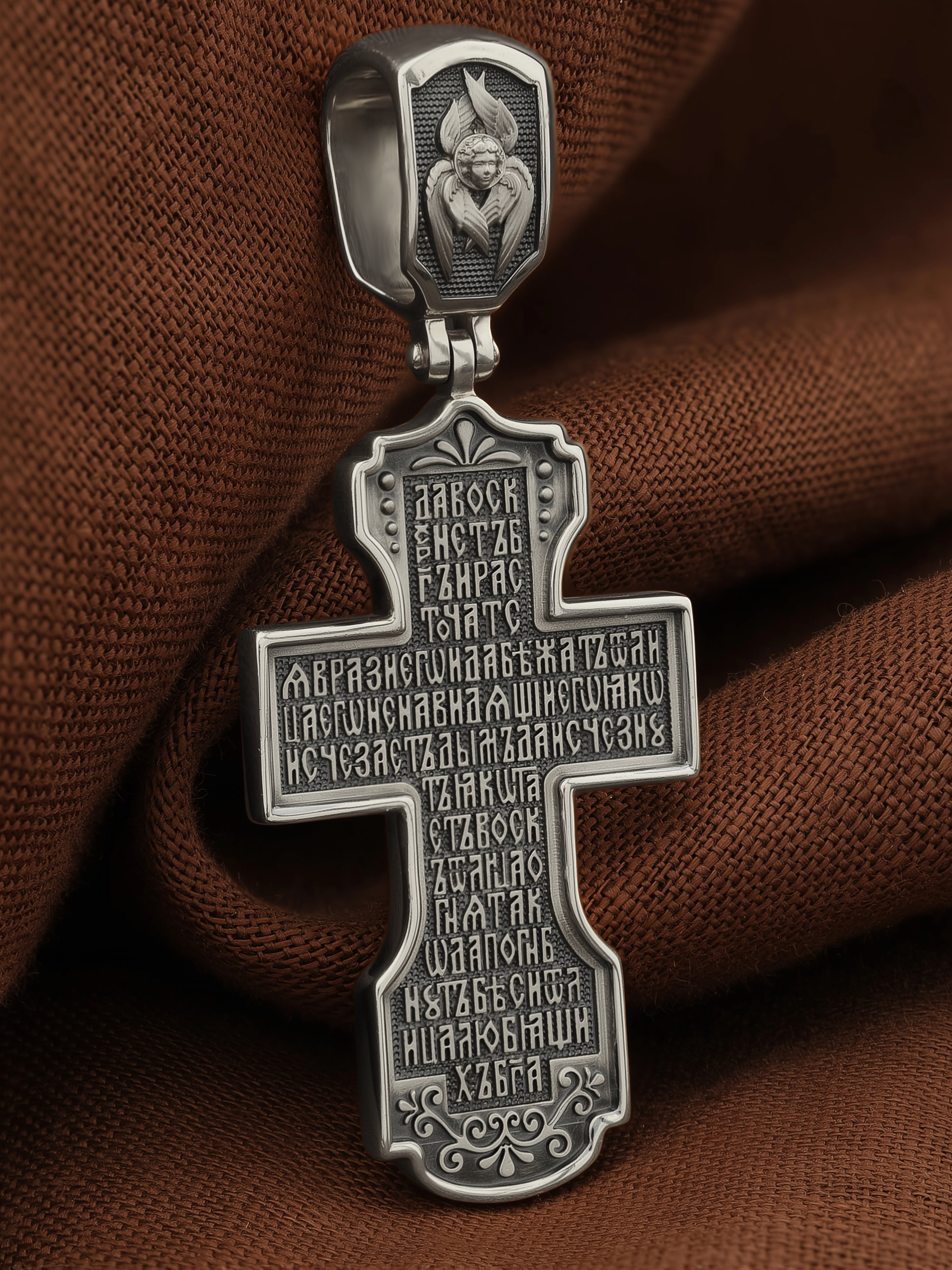 На оборотной стороне креста помещена молитва Честному Кресту Господню: «Да воскреснет Бог, и расточатся врази Его, и да бежат от лица Его ненавидящии Его. Яко исчезает дым, да исчезнут; яко тает воск от лица огня, тако да погибнут беси от лица любящих Бога…». На кулонном кольце изображен шестикрылый Серафим.