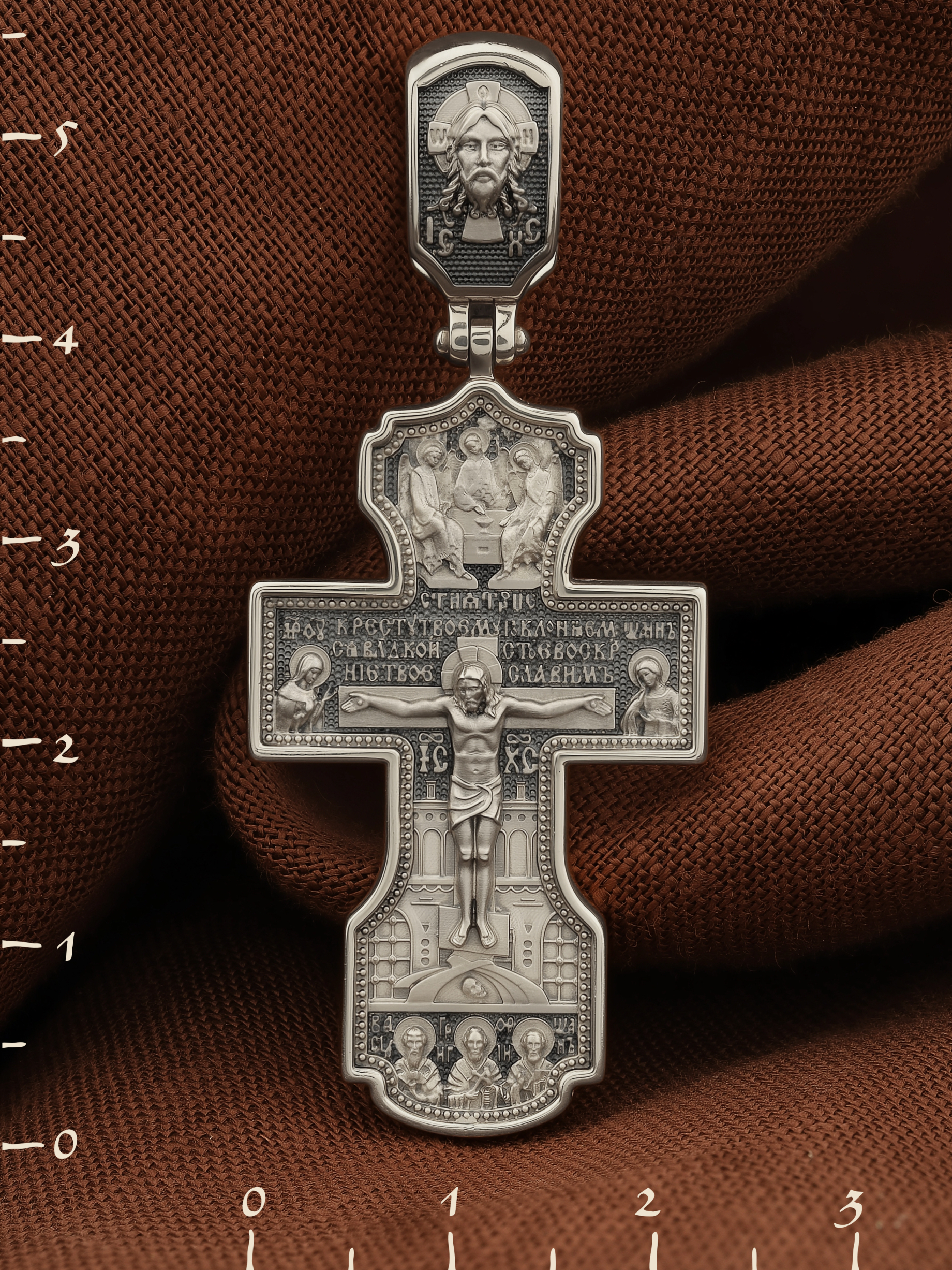 На лицевой стороне креста изображено Распятие Господа и Спасителя нашего Иисуса Христа, отдавшего Себя на смерть, для искупления грехов мира. Крест является символом жертвенной любви Всеблагого Бога к падшим людям, всепобеждающим духовным оружием христиан, основанием и средоточием церковной жизни. Господь сказал: «кто хочет идти за Мною, отвергнись себя, и возьми крест свой, и следуй за Мною». (Мк. 8: 34). Выше Распятия помещены слова молитвы:"Кресту Твоему поклоняемся, Владыко, и святое Воскресение Твое Славим». Над Распятием — образ Святой Троицы в виде трех ангелов. Надпись «IС» « ХС» означает Иисус Христос и находится ниже поперечной перекладины креста. Слева от Распятия изображена Пресвятая Богородица. Справа — апостол и евангелист Иоанн Богослов, один из ближайших учеников Иисуса Христа. За крестом высится Иерусалимская стена. Крест стоит на горе камней, символизирующих Голгофу. В ее основании различается череп — это голова Адама. Ниже распятия изображены отцы Церкви — Святители Василий Великий, Григорий Богослов и Иоанн Златоуст. На православном кресте Христос не умирает, а свободно простирает руки, ладони Иисуса открыты, будто он хочет обнять все человечество, даря им свою любовь и открывая путь к вечной жизни. На кулонном кольце изображен Нерукотворный образ Господа и Спасителя нашего Иисуса Христа, чудесно отпечатавшийся на плате, которым Христос вытер свой лик.