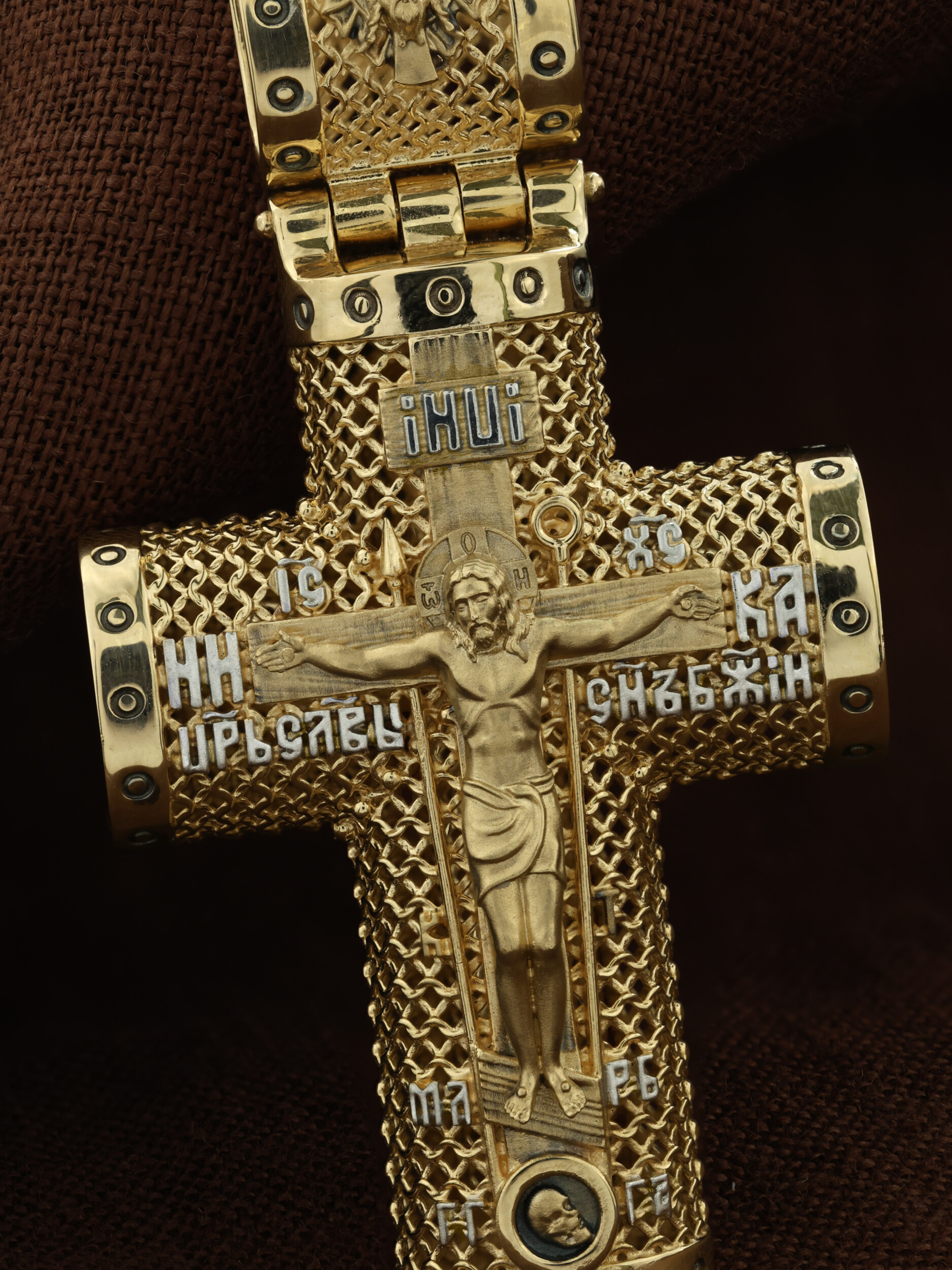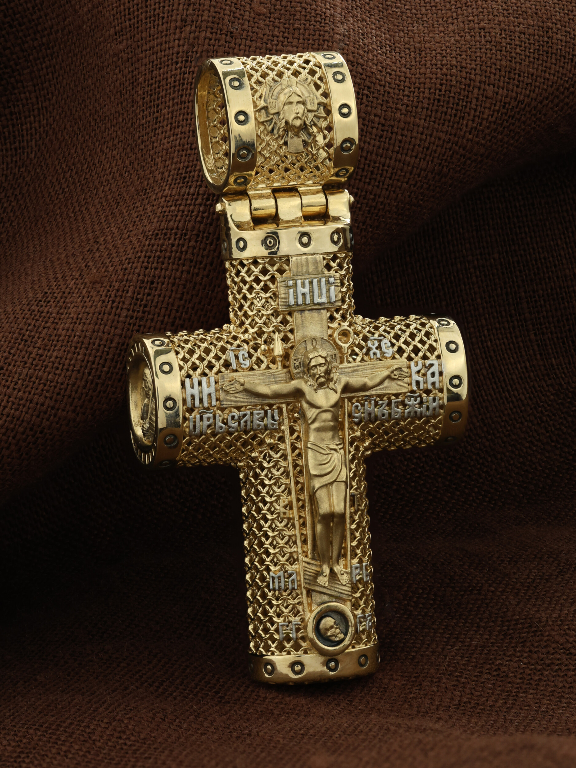 На лицевой стороне креста изображено Распятие Господа и Спасителя нашего Иисуса Христа. Крест- символ спасения и искупления рода человеческого, знамение победы над смертью и адом. Иисус Христос, как искупительная жертва освобождения человечества от власти греха, умер крестной смертью и в третий день воскрес. Распятие сопровождается каноническими надписями. На верхней табличке, выше головы Иисуса, расположена надпись, составленная Понтием Пилатом — «IНЦI». Она означает «Иисус Назорей, Царь Иудейский». Надписи «IC» «ХC», означает Иисус Христос, «НИКА», что означает Победитель, «Царь Славы» и «Сын Божий», размещается на разных сторонах поперечной перекладины креста. Крест стоит на горе камней, символизирующих Голгофу, которая обозначена надписью «Г Г». В ее основании различается череп — это голова Адама, обозначенный надписью «Г А». Надпись «МЛРБ» — «место лобное рай бысть» означает место лобное стало раем. Вдоль креста изображены орудия Страстей Христовых: копие сотника Лонгина, которым пронзили подреберье мёртвого Иисуса, чтобы убедиться в Его смерти, и трость с губкой, с которой Иисуса напоили уксусом. Они обозначены буквами «К» и «Т». На кулонном кольце размещен «Нерукотворный образ Иисуса Христа», на оборотной стороне кулонного кольца- шестикрылый Серафим.