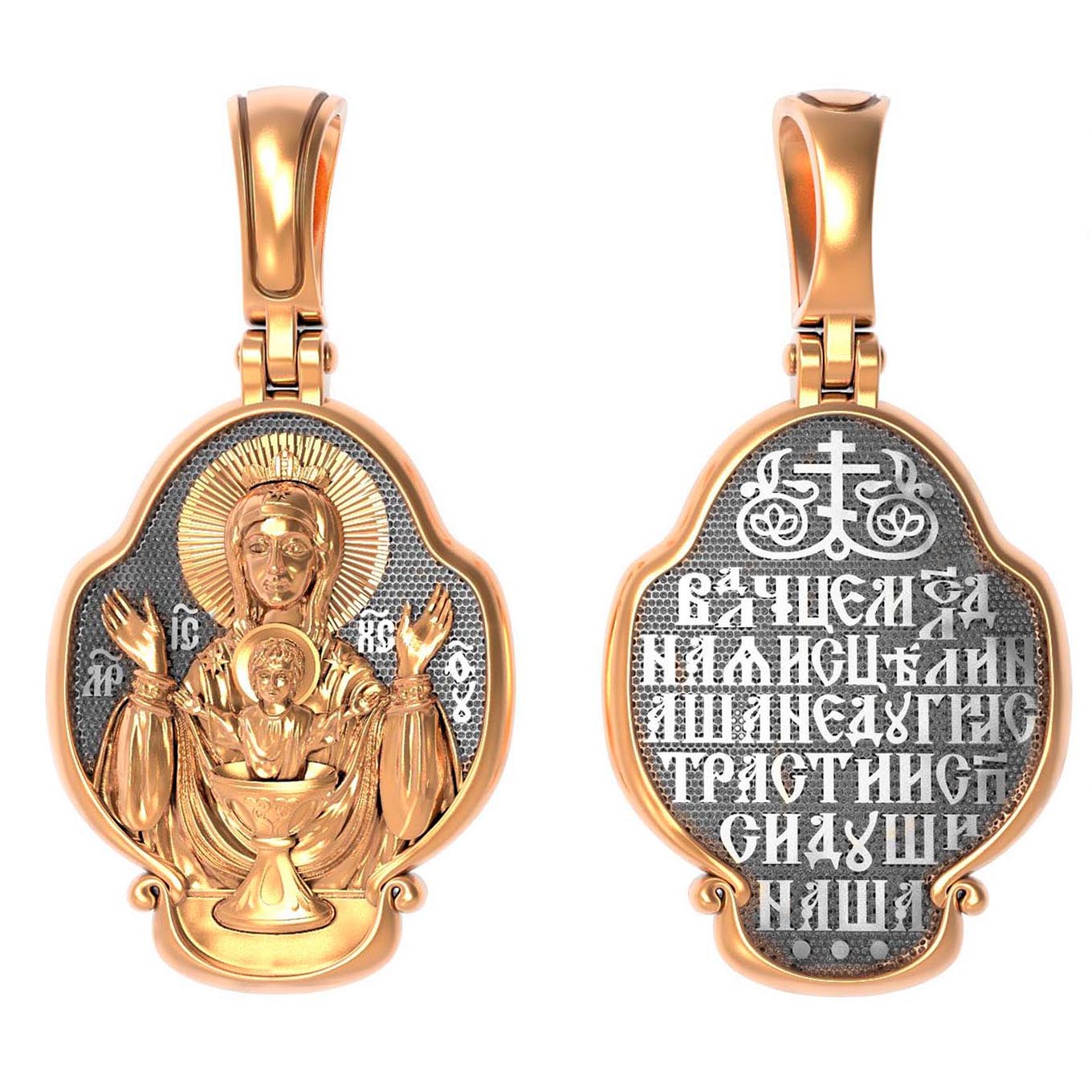 На лицевой части образка изображена икона Божией Матери «Неупиваемая чаша». Икона славится помощью в исцелении зависимостей, помогает людям обрести свободу от греховных страстей.