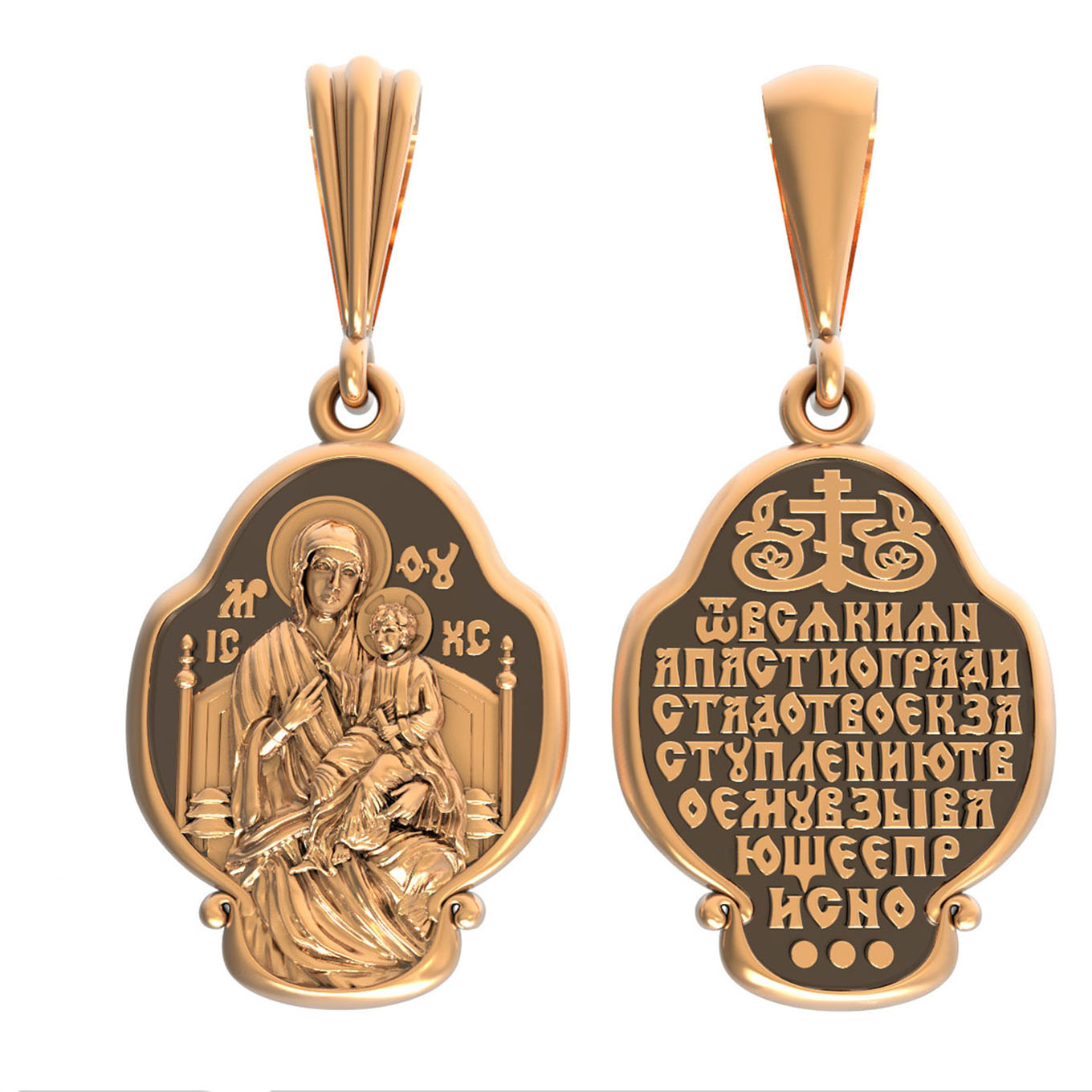 На обороте образка написана молитва Богородице в честь Ее иконы «Всецарица» (Пантанасса): «От всякия напасти огради стадо Твое, к заступлению Твоему взывающее присно».