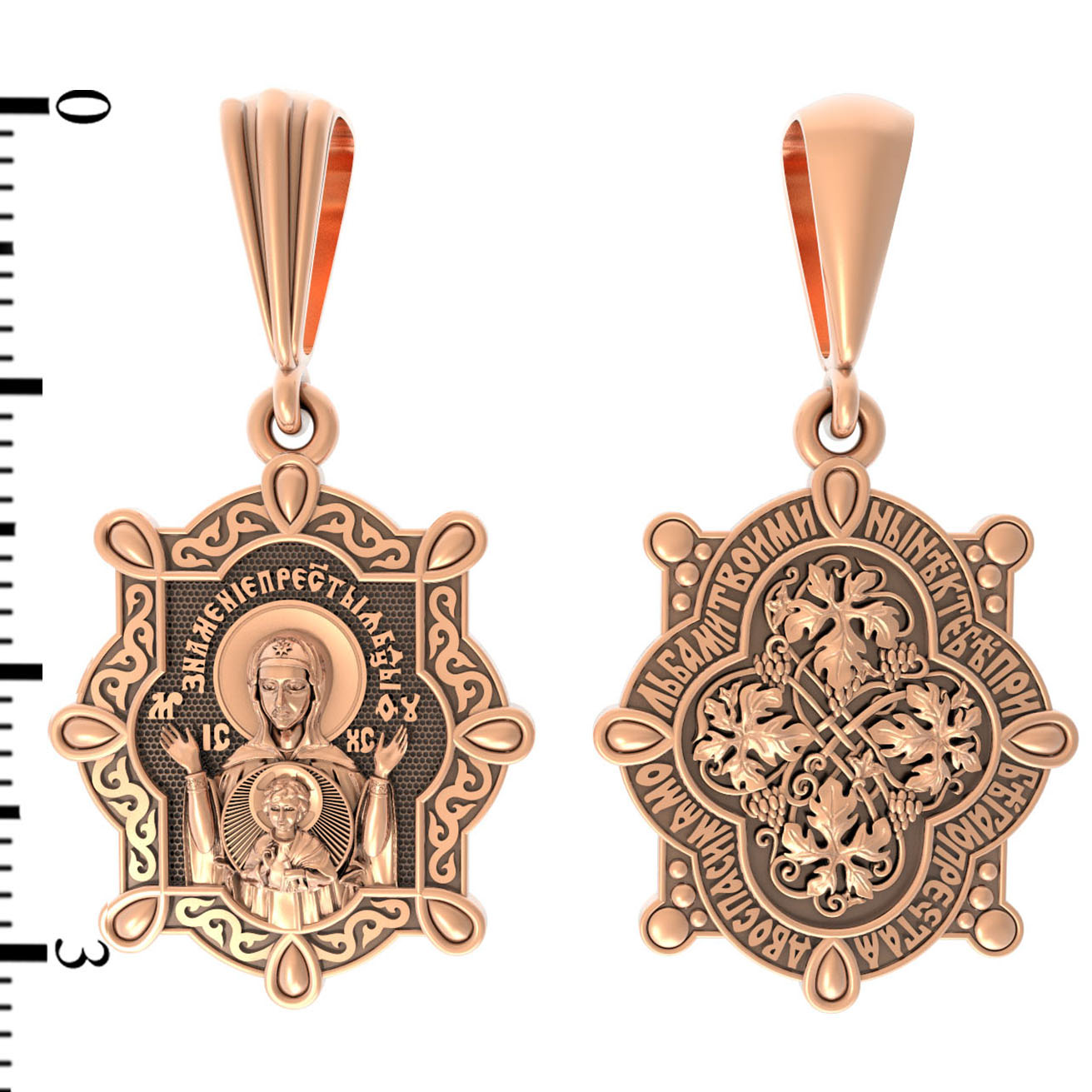 В центр образка помещен образ Божией Матери «Знамение», прославившийся многими чудесами в Новгороде в XII веке. Икона эта чтится как одна из самых великих святынь Русской земли. Молитвенно воздетые руки Богородицы означают заступничество за людей пред Богом. Рядом с Ней, на фоне круглого щита, — благословляющий Божественный Младенец — Спас-Эммануил.