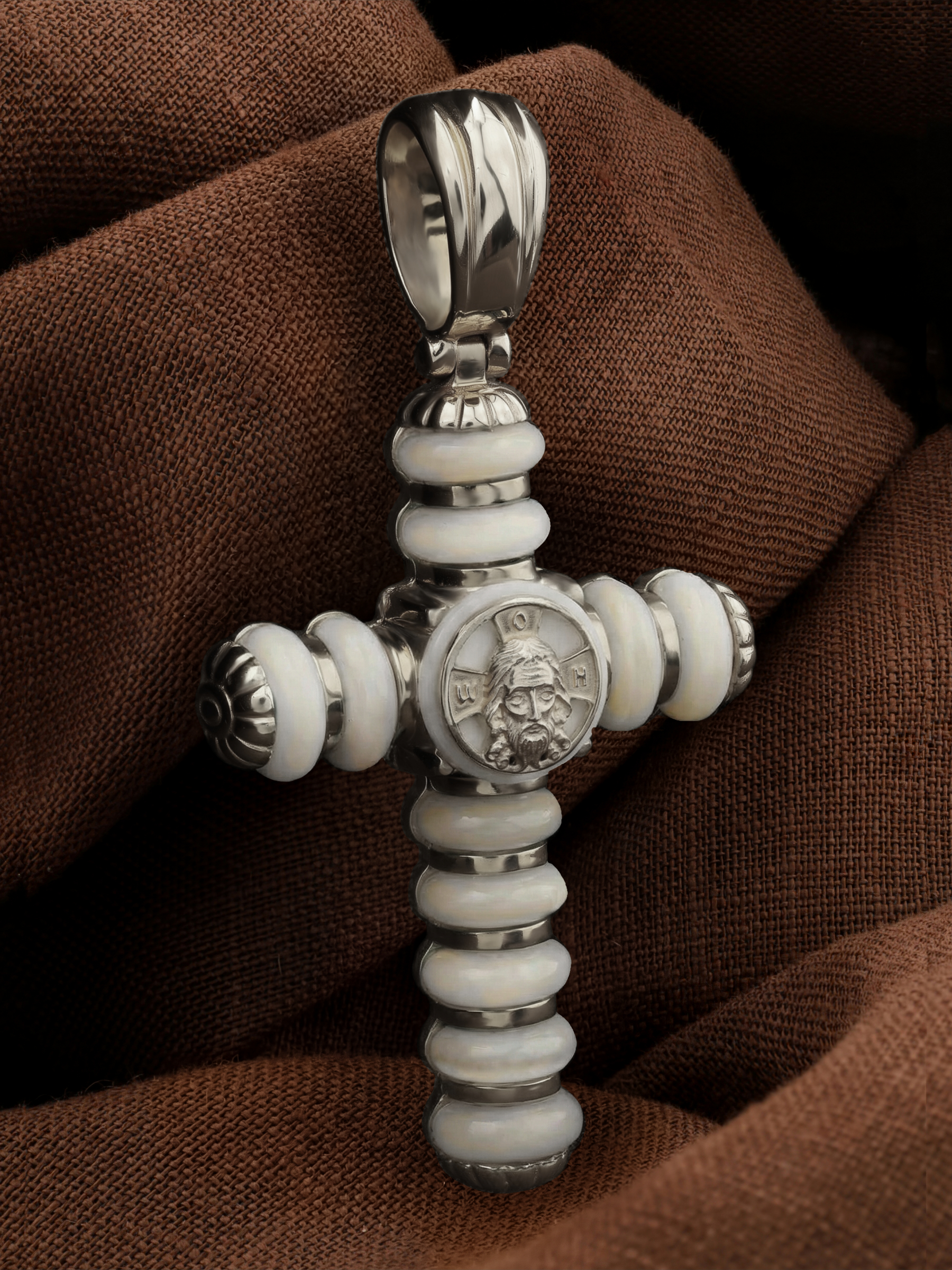 Крест из белого золота c кахолонгом