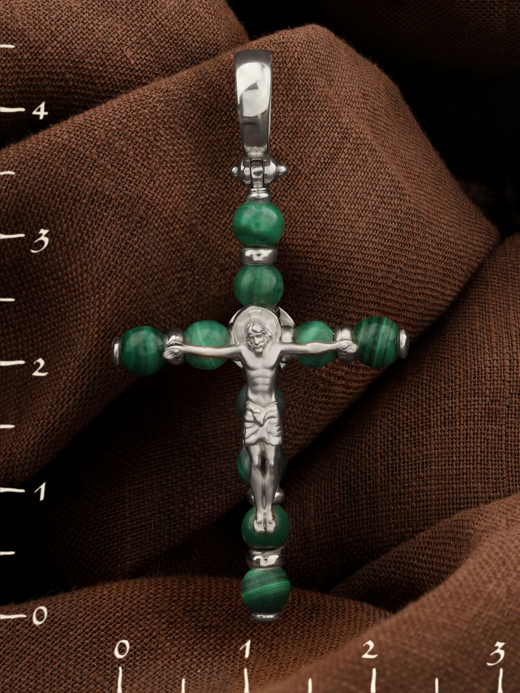 На лицевой стороне креста изображено Распятие Господа и Спасителя нашего Иисуса Христа. Своими крестными страданиями Господь смыл наши грехи, покрыл наш долг перед Богом или, на языке Писания, нас «искупил». В Голгофе сокрыта непостижимая тайна бесконечной правды и любви Бога. Крест стал символом победы добра над злом, жизни над смертью, напоминанием бесконечной Божьей любви, предметом радости. Воплотившийся Сын Божий Своею кровью освятил крест и сделал его проводником Своей благодати, источником освящения верующих. На верхней табличке, выше головы Иисуса, расположена надпись, составленная Понтием Пилатом — «IНЦI». Она означает «Иисус Назорей, Царь Иудейский». Надпись «IC» «ХC», означает Иисус Христос, помещаются на разных сторонах поперечной перекладины креста. Христос в Своей Божественной любви, над которой смерть не властна и которая, страдая, и не страдает в обычном смысле, простирает к людям со Креста Свои объятия, в которые призывается и привлекается весь мир. Поэтому Тело Его не висит, а торжественно покоится на Кресте.