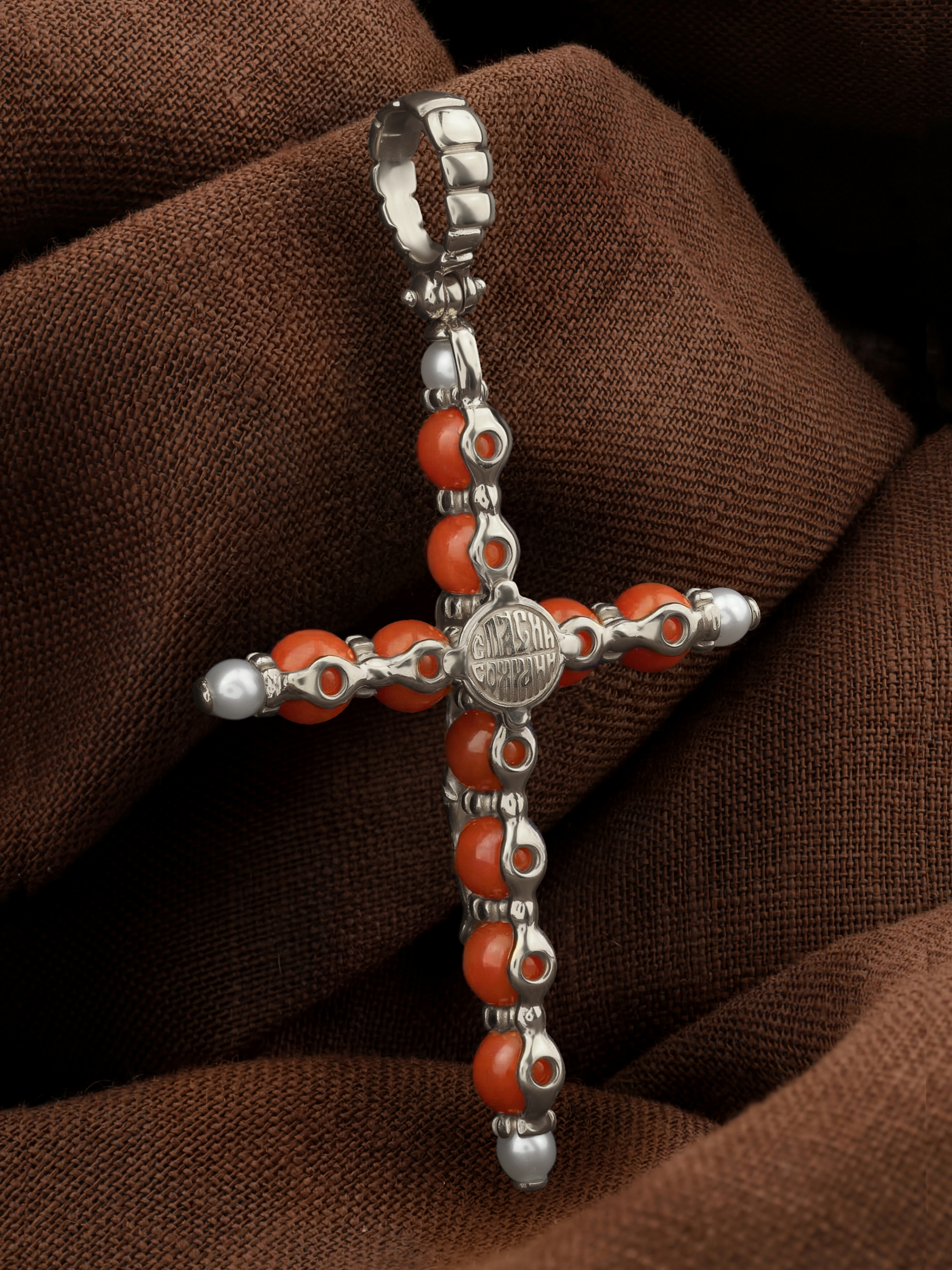 Крест из белого золота c жемчугом и кораллом