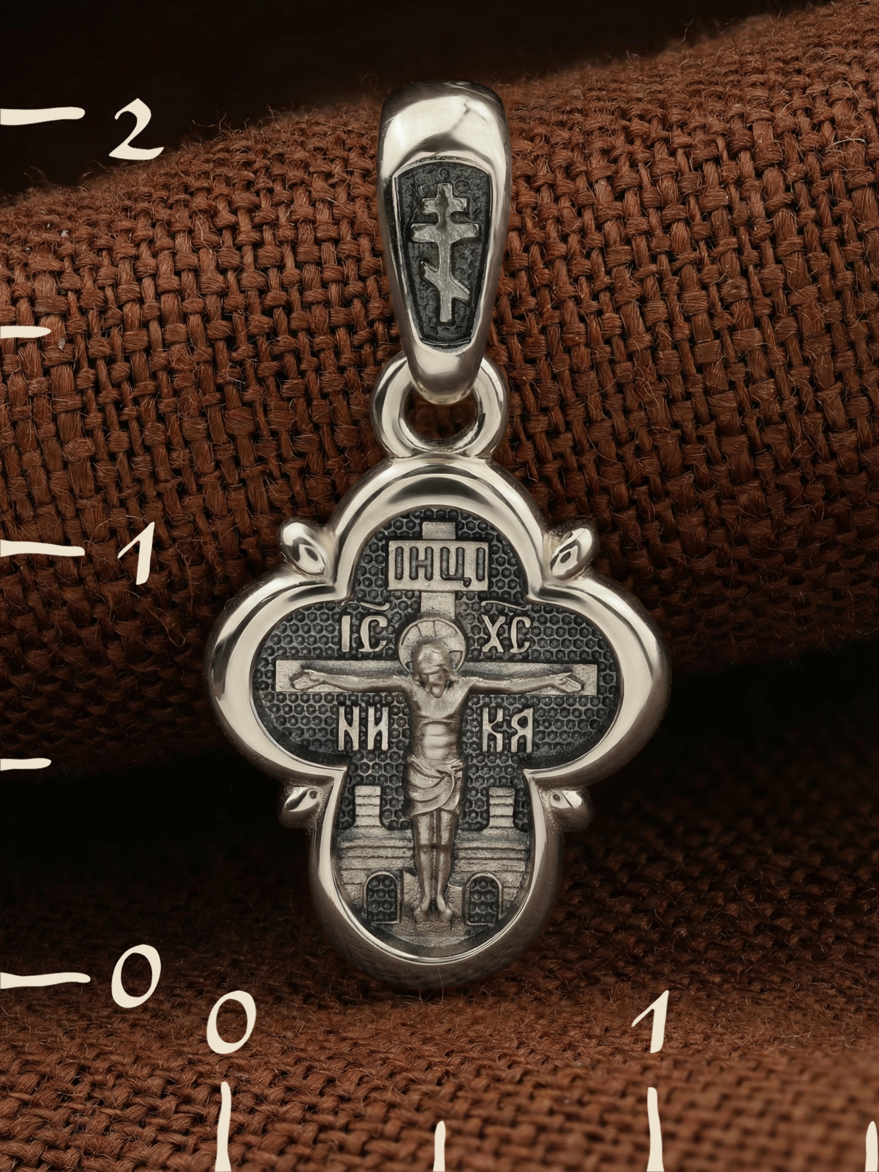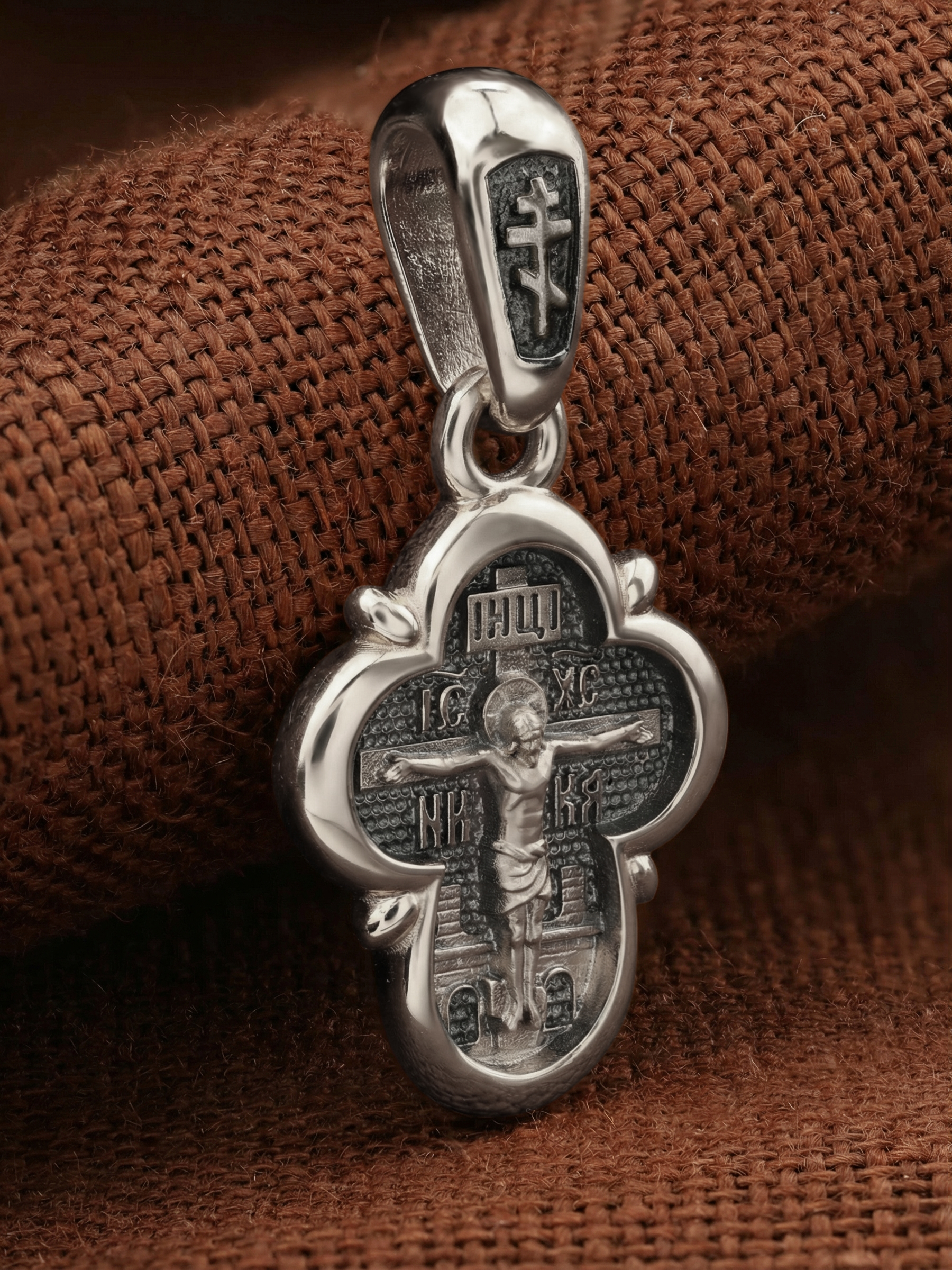 На лицевой стороне креста изображено Распятие Господа и Спасителя нашего Иисуса Христа, отдавшего Себя на смерть, для искупления грехов мира. Крест является символом жертвенной любви Всеблагого Бога к падшим людям, всепобеждающим духовным оружием христиан, основанием и средоточием церковной жизни. Господь сказал: «кто хочет идти за Мною, отвергнись себя, и возьми крест свой, и следуй за Мною». (Мк. 8: 34). На верхней табличке, выше головы Иисуса, расположена надпись, составленная Понтием Пилатом — «IНЦI». Она означает «Иисус Назорей, Царь Иудейский». Надпись «IC» «ХC», означает Иисус Христос, помещается на разных сторонах поперечной перекладины креста. Рядом — слово «НИКА», что означает «победитель». За крестом высится Иерусалимская стена. Над вершиной Распятия, на кулонном кольце, помещен крест.