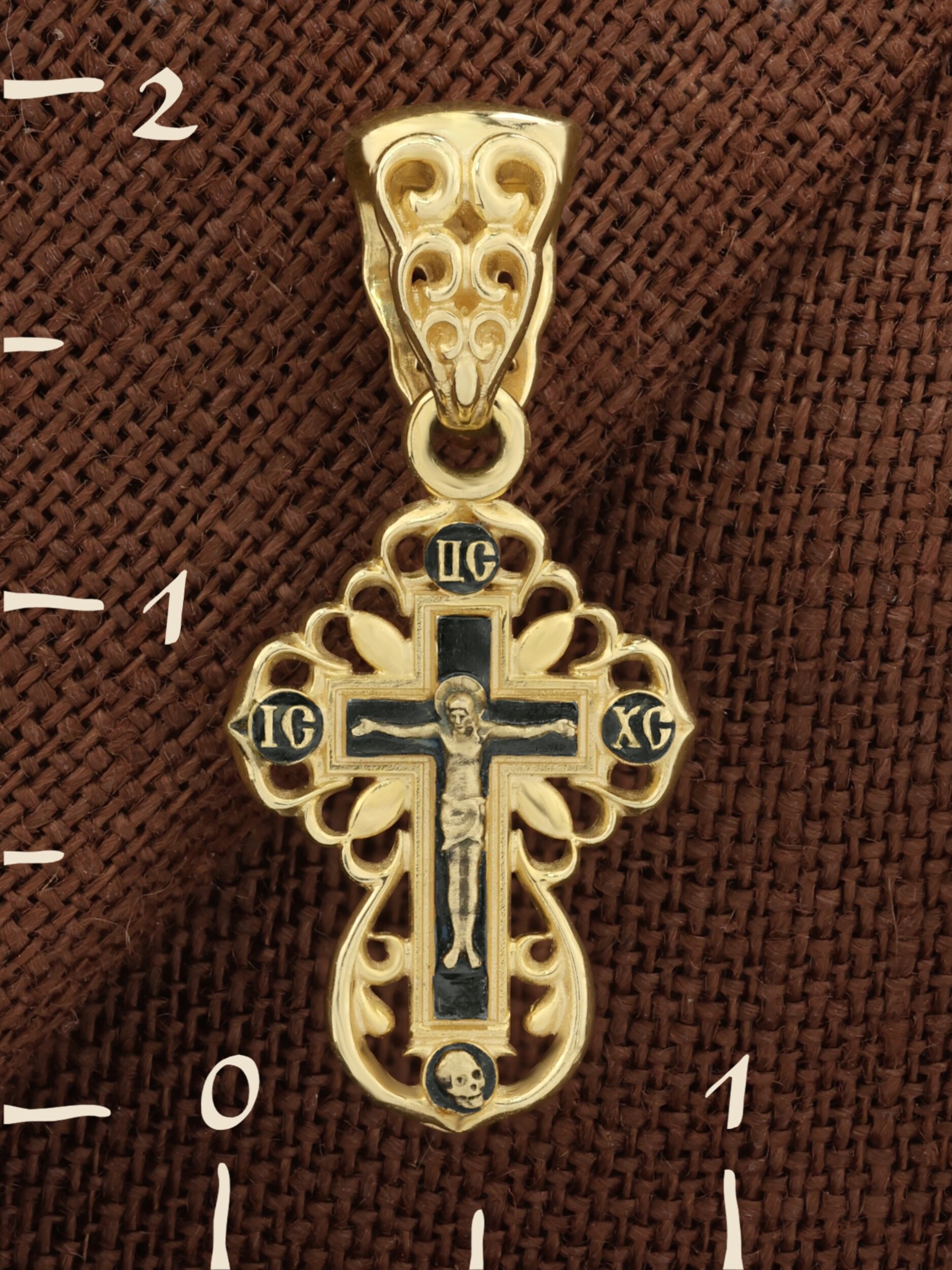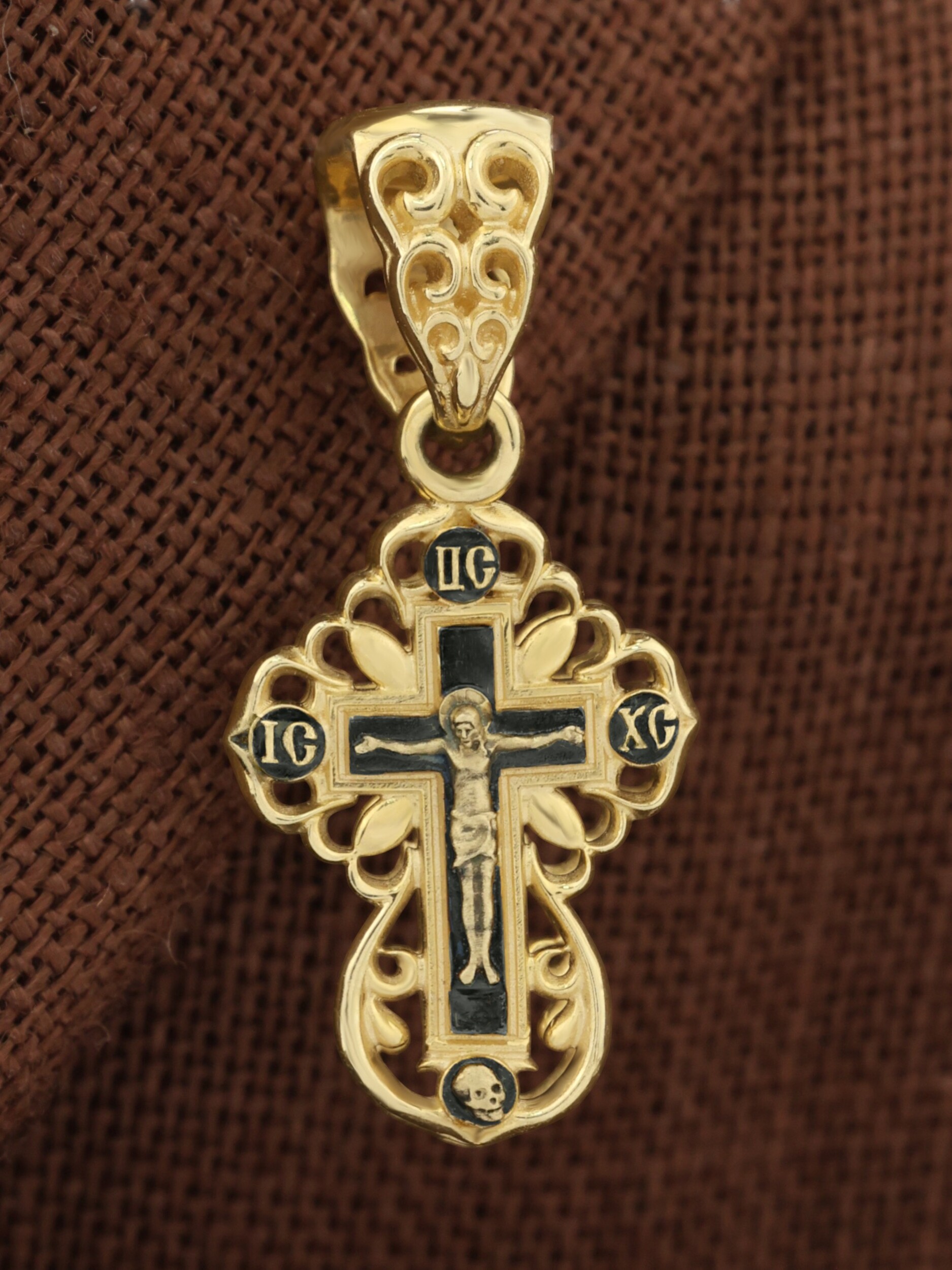 На лицевой стороне креста изображено Распятие Господа и Спасителя нашего Иисуса Христа. Своими крестными страданиями Господь смыл наши грехи, покрыл наш долг перед Богом или, на языке Писания, нас «искупил». В Голгофе сокрыта непостижимая тайна бесконечной правды и любви Бога. Крест стал символом победы добра над злом, жизни над смертью, напоминанием бесконечной Божьей любви, предметом радости. Воплотившийся Сын Божий Своею кровью освятил крест и сделал его проводником Своей благодати, источником освящения верующих. Над вершиной Распятия помещена надпись «Царь Славы». Надпись «IC» «ХC», означает Иисус Христос, помещаются на разных сторонах поперечной перекладины креста. В основании Распятия различается череп– это голова Адама. Христос в Своей Божественной любви, над которой смерть не властна и которая, страдая, и не страдает в обычном смысле, простирает к людям со Креста Свои объятия, в которые призывается и привлекается весь мир. Поэтому Тело Его не висит, а торжественно покоится на Кресте.