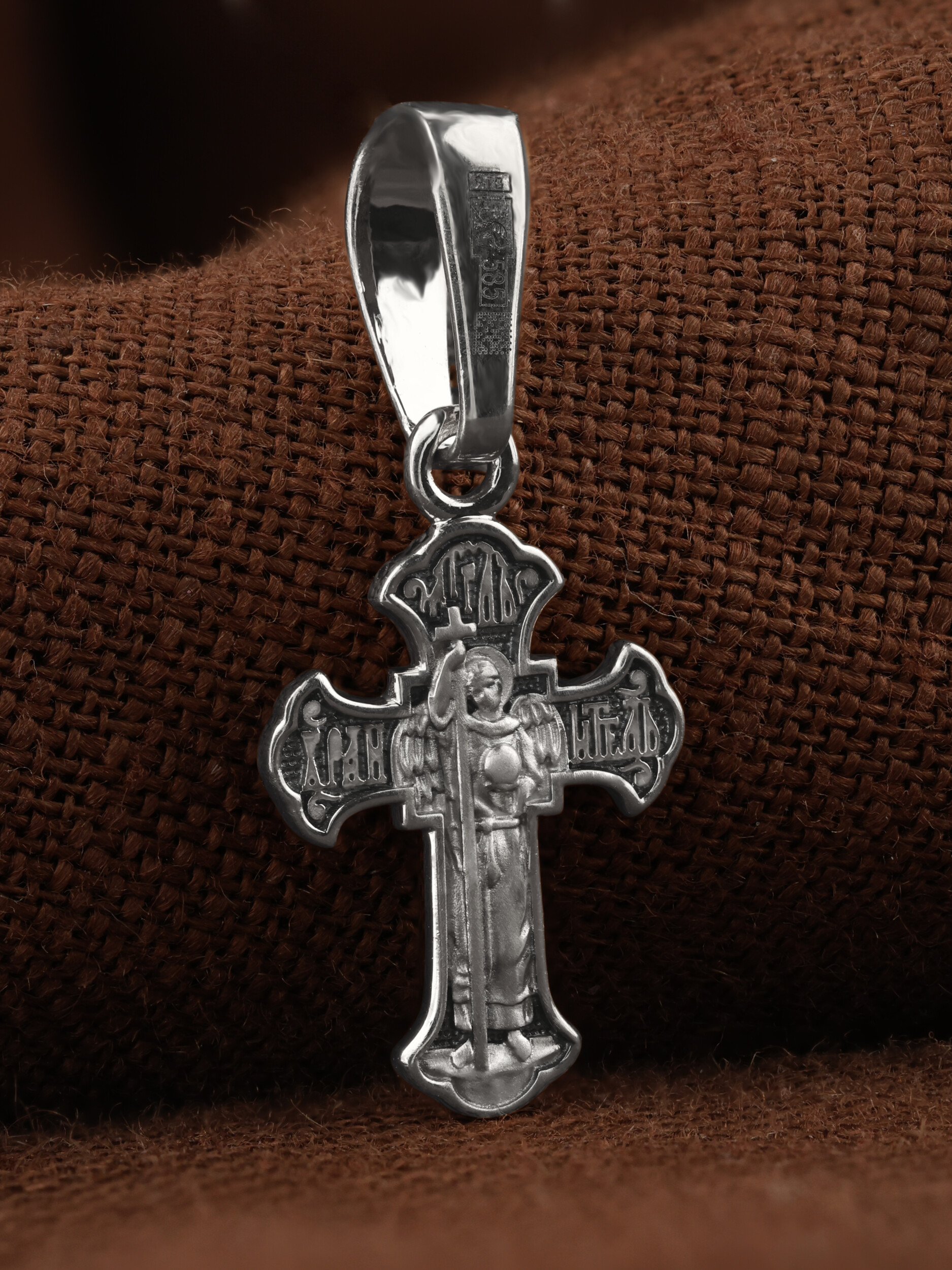 На оборотной стороне креста изображен святой Ангел-Хранитель в виде прекрасного юноши держащего в правой руке крест, а в левой — сферу. Ангел-Хранитель — это Ангел приставляемый Богом к человеку при крещении для охраны и помощи в добрых делах. Невидимо пребывая при нас постоянно, он, руководствуя нас ко спасению, не только по нашему желанию таинственно наставляет нас на все доброе и полезное, не только возносит наши молитвы к Богу, но еще и сам от себя охраняют и защищают нас от врагов видимых и невидимых, ходатайствует за нас пред Богом.