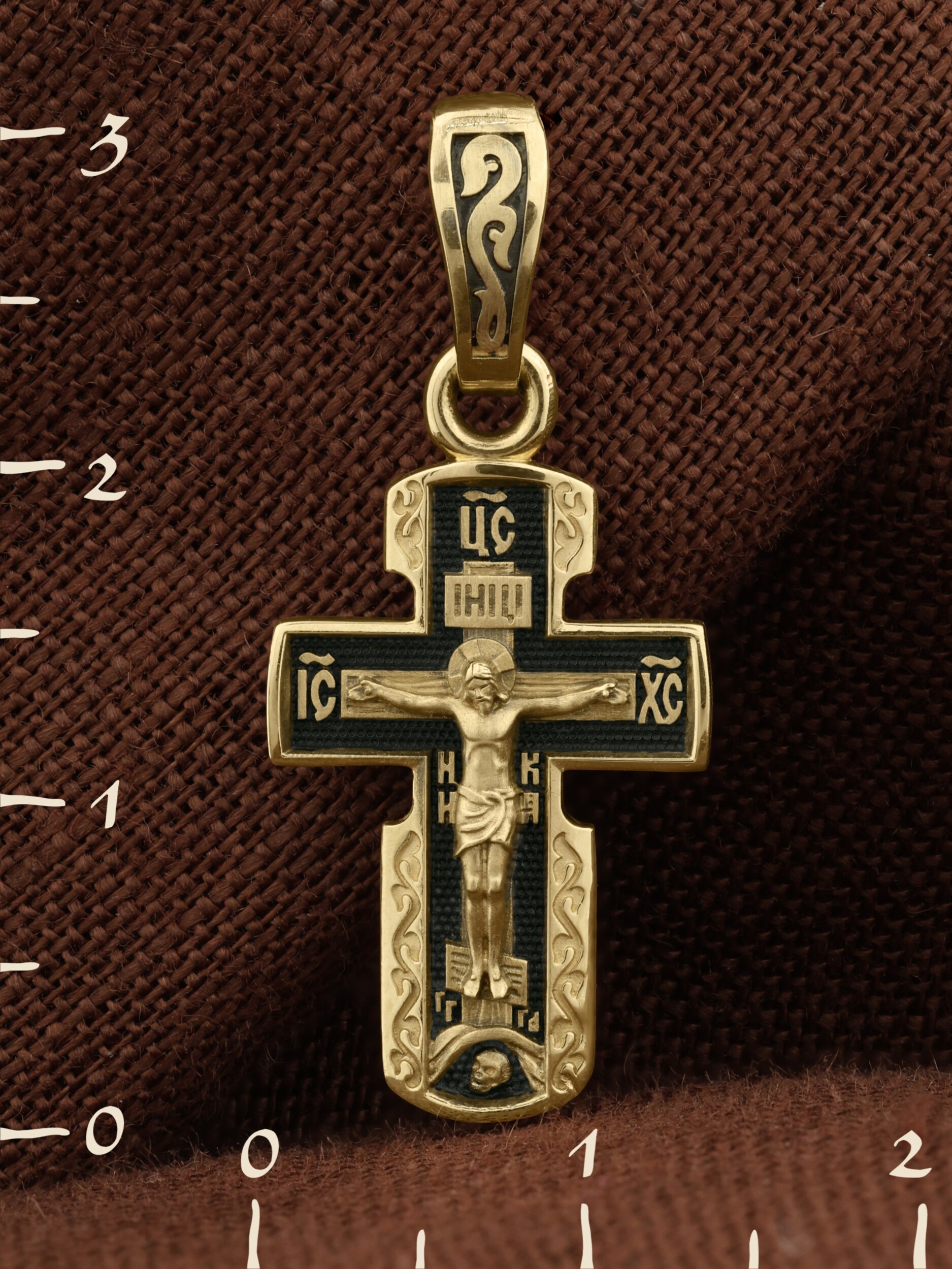 На лицевой стороне креста изображено Распятие Господа и Спасителя нашего Иисуса Христа, отдавшего Себя на смерть, для искупления грехов мира. Крест является символом жертвенной любви Всеблагого Бога к падшим людям, всепобеждающим духовным оружием христиан, основанием и средоточием церковной жизни. Над вершиной Распятия помещена надпись «Царь Славы». На верхней перекладине расположена надпись «IНЦI». Она символизирует титло — табличку, на которой, согласно Евангелию, было начертано: Иисус Назорей, Царь Иудейский. Надпись «IC» «ХC», означает Иисус Христос, помещаются на разных сторонах поперечной перекладины креста. Ниже помещена надпись «НИКА», что означает «победитель». Крест стоит на горе камней, символизирующих Голгофу. В ее основании различается череп и надписи «Г.А.» — голова Адама, «Г.Г.» — гора Голгофа.