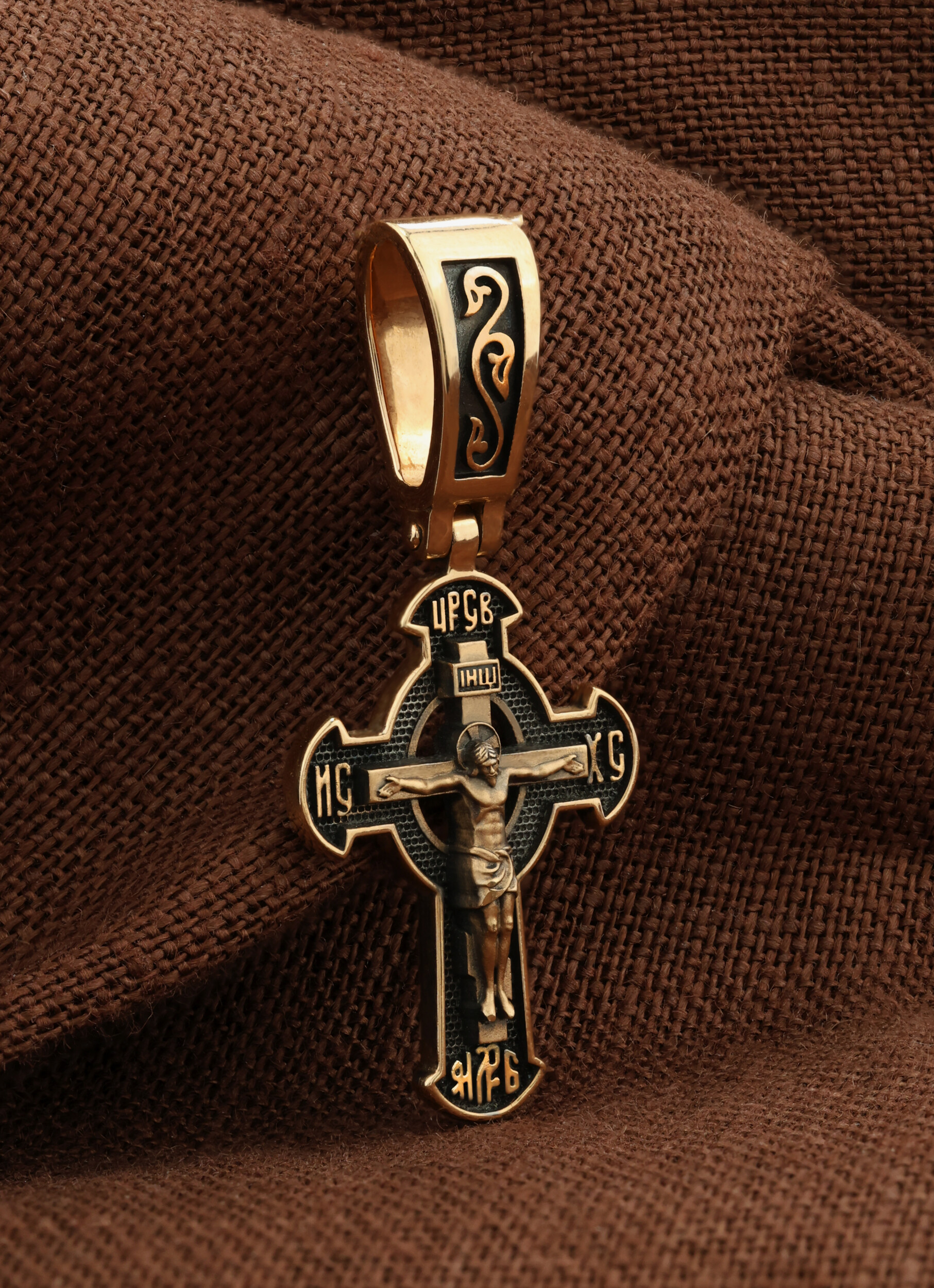 Оборотная сторона креста украшена растительным орнаментом. Помещенный на крест орнамент символизирует жизнедательную силу, животворное тепло креста. В растительный узор, на горизонтальной перекладине, вписано молитвенное славословие: «Спаси и сохрани». Эта надпись означает непрерывную молитву, совершаемую носителем данного креста.
