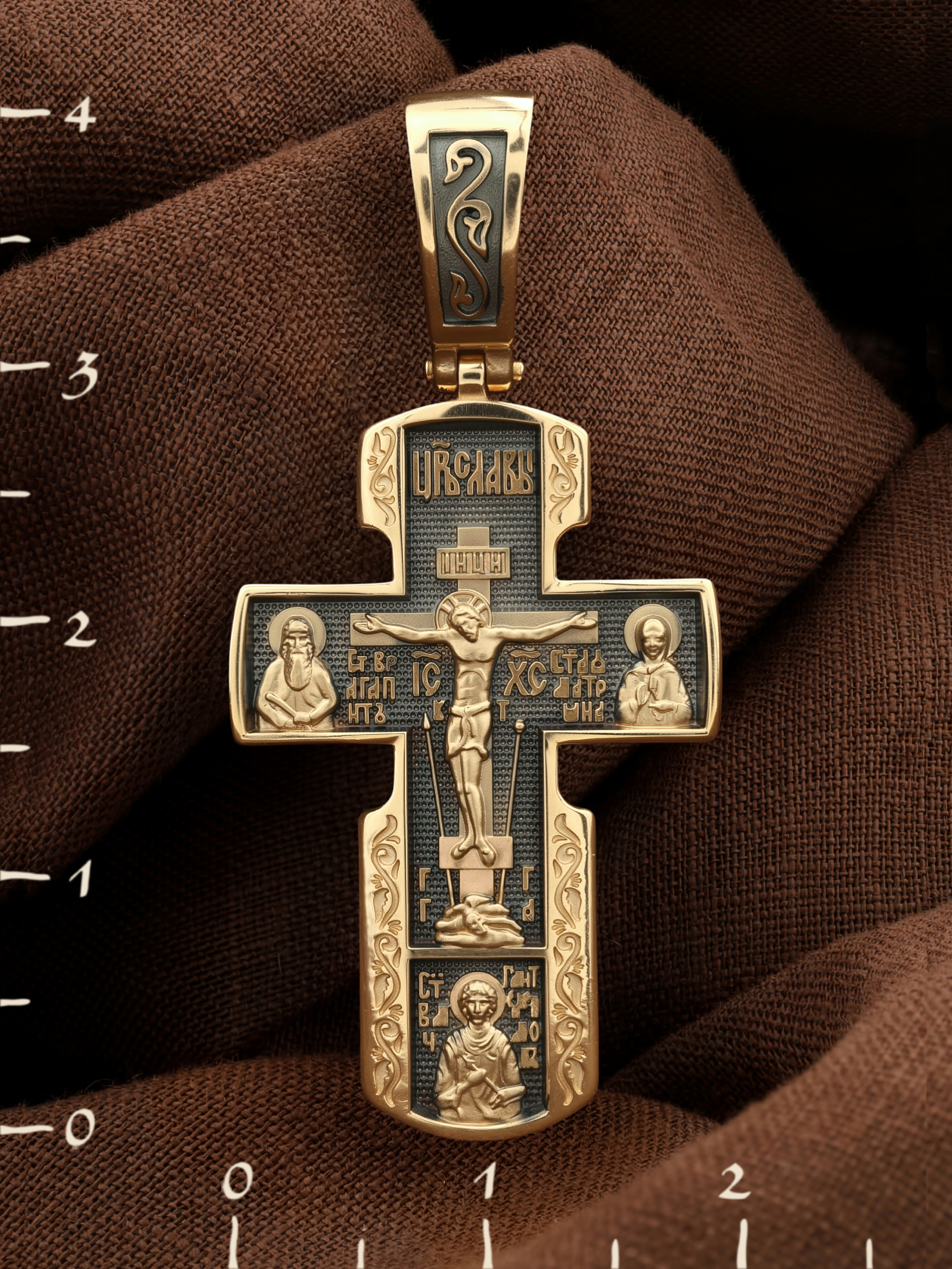 Как действенная помощь в немощах и болезнях был создан крест с образами святых целителей и со знаменитой афонской иконой Божией Матери «Всецарица». На лицевой стороне креста изображено Распятие Иисуса Христа. Над титлом видим слова «ЦРЬ СЛВЫ» — Царь Славы. Верхняя перекладина символизирует собой табличку с надписью «IHЦI» — Иисус Назарянин Царь Иудейский. Под перекладиной пишется сокращенно имя Спасителя «IC XC» — Иисус Христос. Возвышение, на котором стоит Крест, символизирует гору Голгофу, на которой произошло Распятие. У подножия Креста изображают прах Адама, обозначенный черепом. Справа от Распятия помещен образ прославленной святой блаженной Матроны. Слева — икона Преподобный Агапита. Этот святой жил в пещерах Киево-Печерского монастыря в XI веке и бескорыстно врачевал мирян и монахов. У основания Креста Господня изображен великомученик Пантелеимон Целитель. Господь даровал удивительную силу его молитве. Ею он исцелял любые болезни и даже воскрешал умерших.