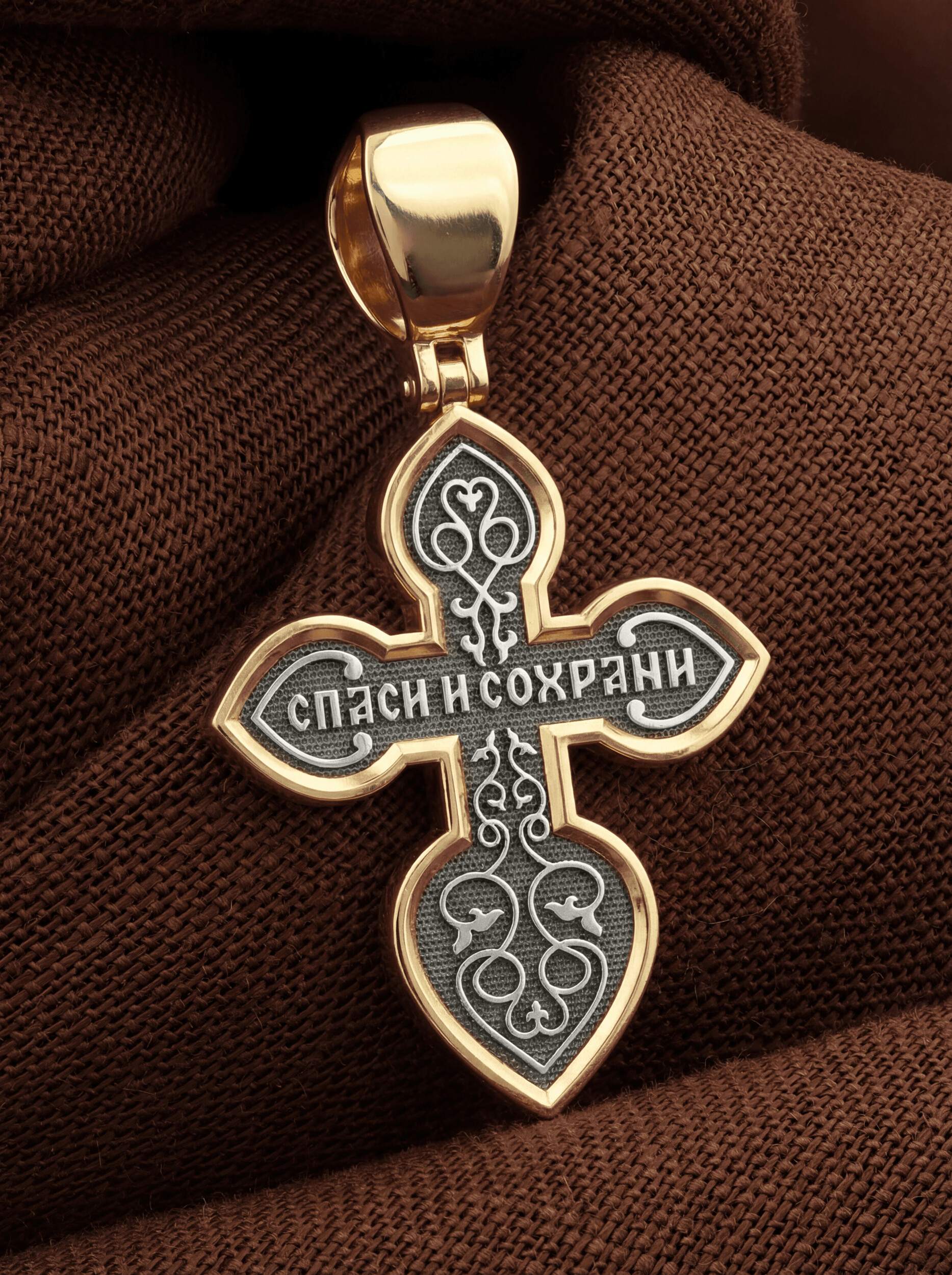 На обороте данного креста, в окружении изящного растительного узора, написано молитвенное славословие: «Спаси и сохрани».