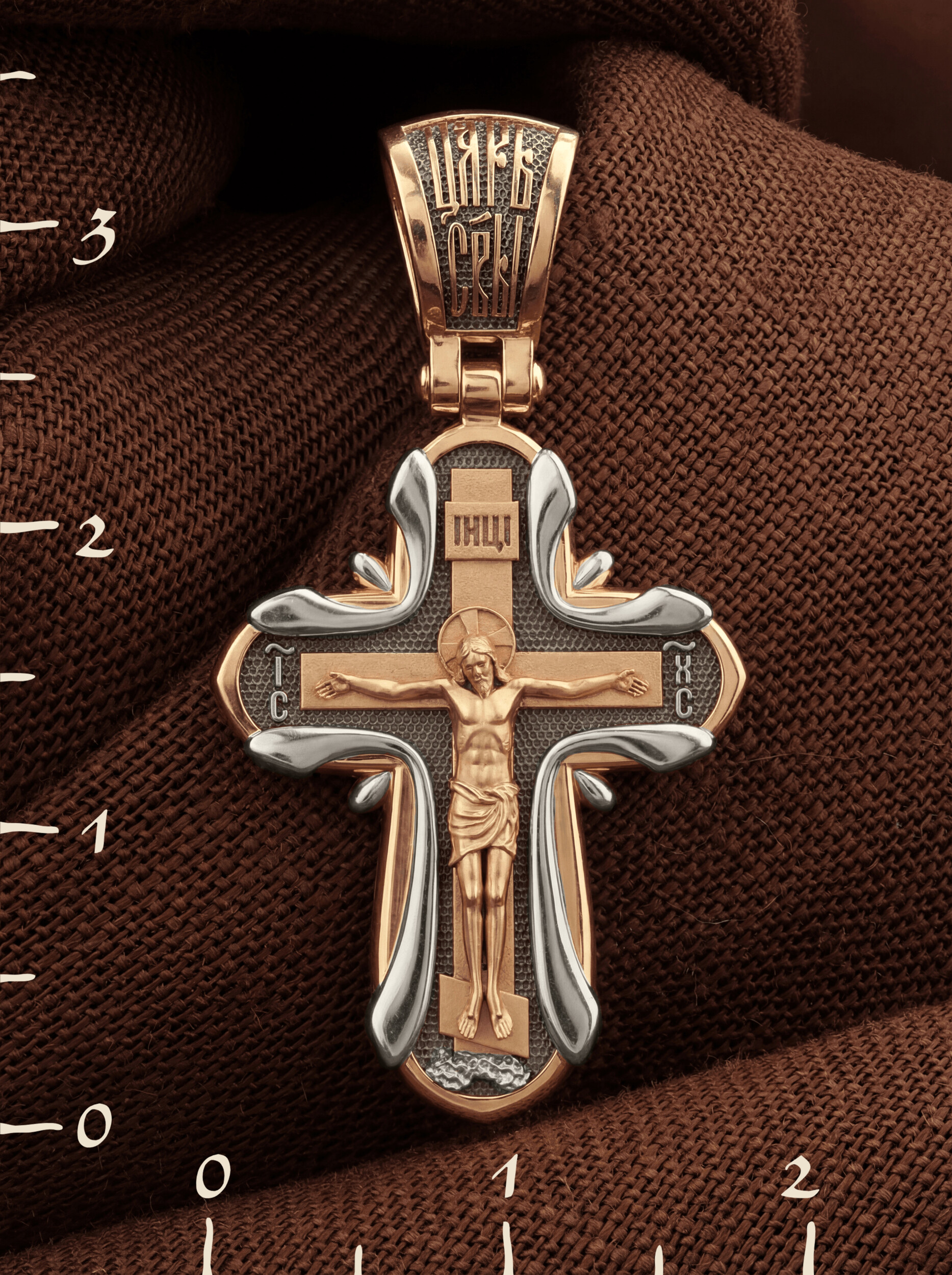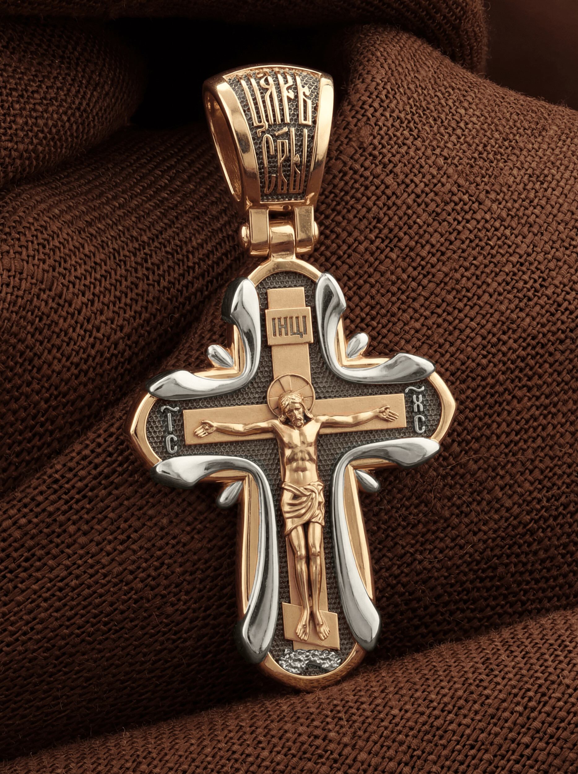 На лицевой стороне креста изображено Распятие Господа и Спасителя нашего Иисуса Христа, отдавшего Себя на смерть, для искупления грехов мира. Крест является символом жертвенной любви Всеблагого Бога к падшим людям, всепобеждающим духовным оружием христиан, основанием и средоточием церковной жизни. Господь сказал: кто хочет идти за Мною, отвергнись себя, и возьми крест свой, и следуй за Мною. (Мк. 8: 34). Над вершиной Распятия, на кулонном кольце, помещена надпись «Царь Славы». На верхней табличке, выше головы Иисуса, расположена надпись, составленная Понтием Пилатом — «IНЦI». Она означает «Иисус Назорей, Царь Иудейский». Надпись «IC» «ХC», означает Иисус Христос, помещается на разных сторонах поперечной перекладины креста. Крест стоит на горе камней, символизирующих Голгофу.