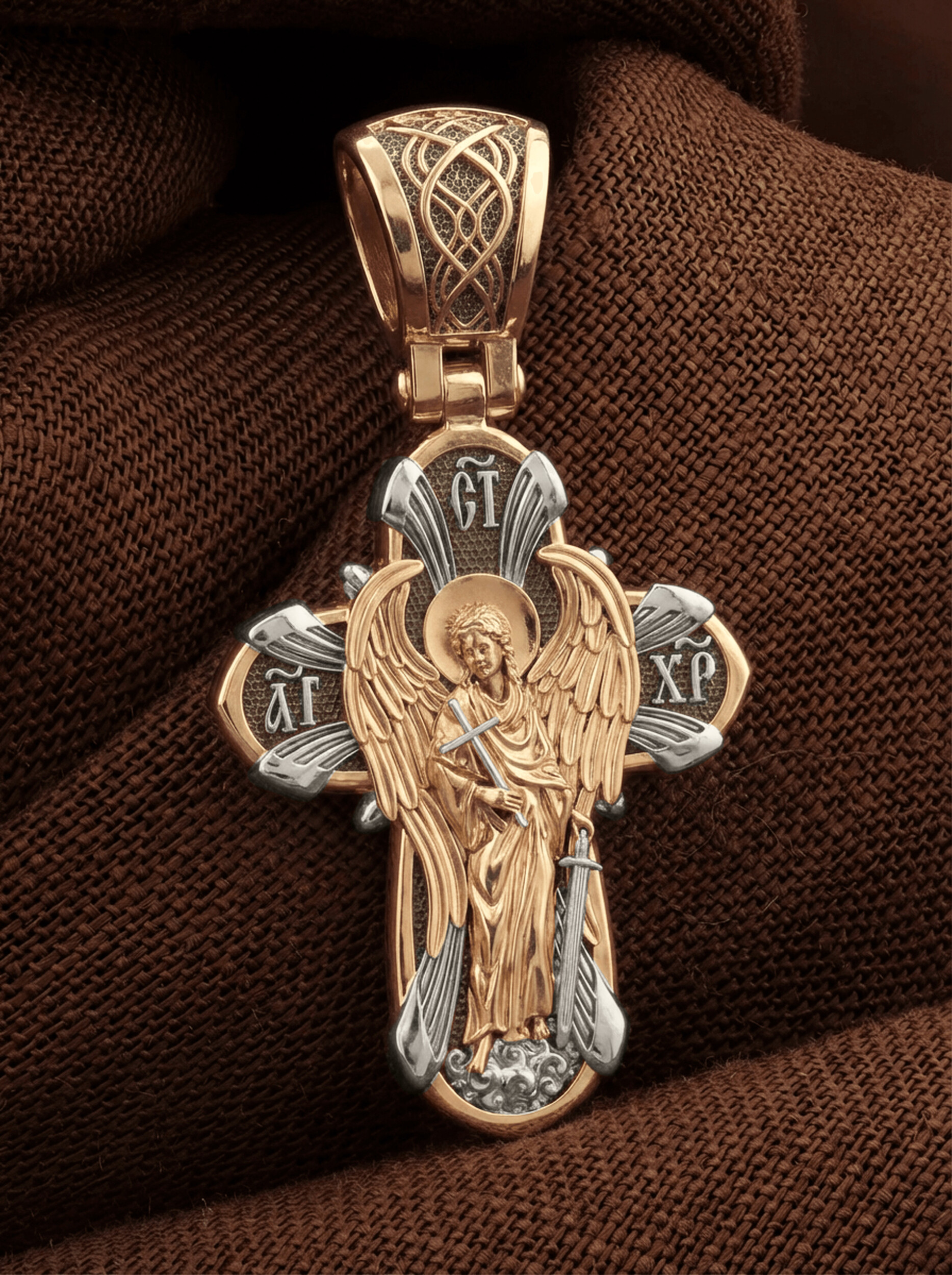 На оборотной стороне креста изображен Святой Ангел-Хранитель держащий в правой руке крест, а в левой — мечь.. Ангел-Хранитель — это Ангел приставляемый Богом к человеку при крещении для охраны и помощи в добрых делах. Он невидимо находится при человеке на протяжении всей его жизни, если человек сохраняет в себе любовь к Богу и истинную веру перед Ним. Ангел-Xранитель делают для нас все, что служит к истинному нашему благу и спасению. Невидимо пребывая при нас постоянно, он, руководствуя нас ко спасению, не только по нашему желанию таинственно наставляет нас на все доброе и полезное, не только возносит наши молитвы к Богу, но еще и сам от себя охраняют и защищают нас от врагов видимых и невидимых и ходатайствует за нас пред Богом. Ангел-Хранитель так любит нас, как никто на земле любить не может. Ангел-Хранитель — присный друг наш, незримый тихий собеседник, пресладостный утешитель. Одного лишь каждому из нас он желает — спасения души; к этому он направляет все свои заботы. И если видит нас также заботящимися о спасении, радуется, если же видит нас пребывающими в нерадении о душе своей, скорбит. Но и самый великий грешник может примириться со своим Ангелом-Хранителем посредством искреннего раскаяния в грехах и оставления их навсегда. В таком случае, по слову Писания, великая радость бывает для всех ангелов на небесах (Лк. 15:10).