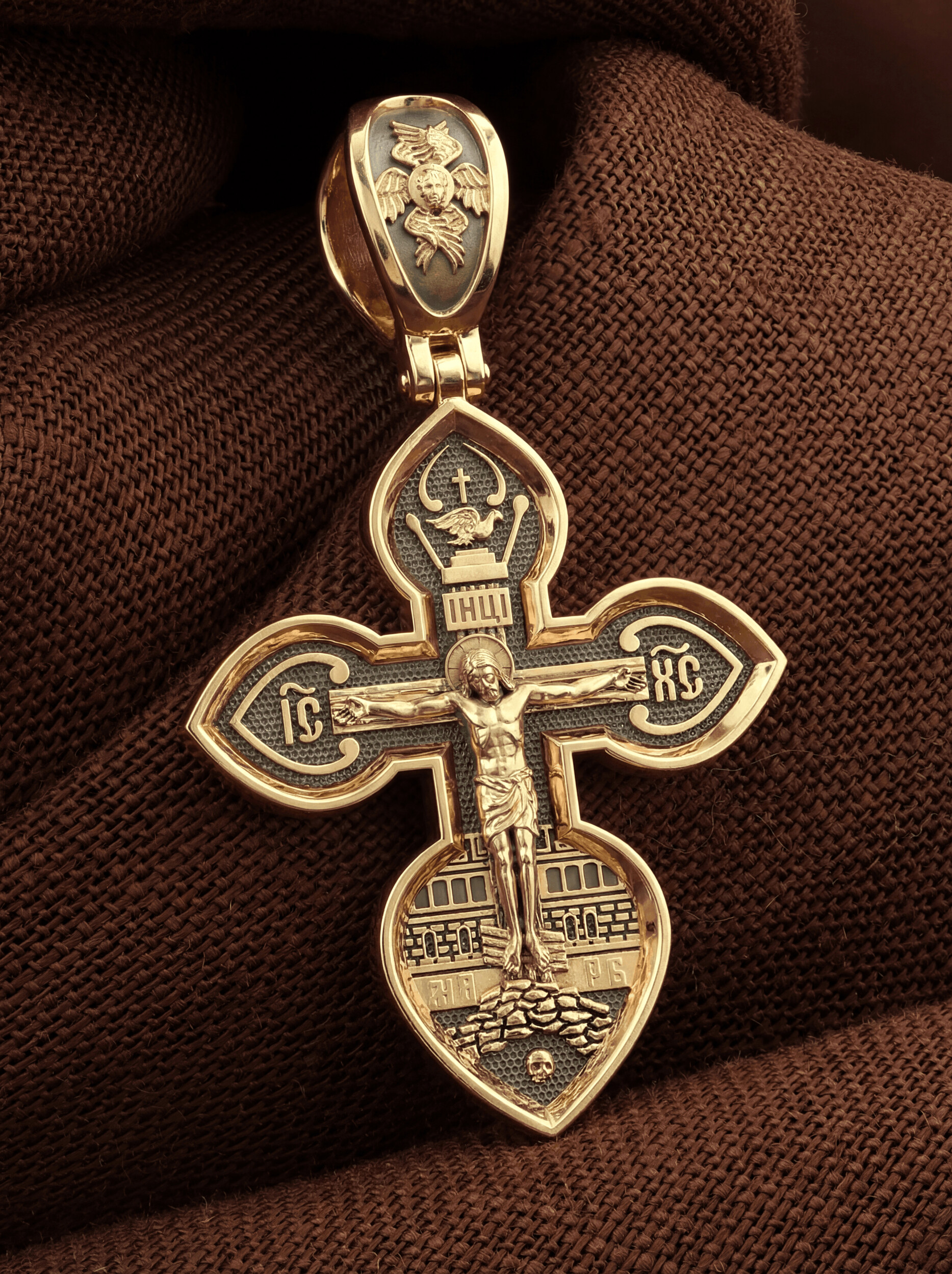 На лицевой стороне нательного креста по традиции изображено Распятие Иисуса Христа. В основании креста изображен череп Адама, а гора Голгофа именуется также Лобным Местом и обозначена на кресте буквами «МЛ РБ». С обеих сторон горизонтальной перекладины написано святое имя Христа, которое принято писать на иконах сокращенно — «ИС ХС». Сверху у изголовья Иисуса Христа размещена табличка с надписью в виде аббревиатуры IНЦI — «Иисус Назорей Царь Иудейский», которая, согласно Евангелию, была прибита к кресту после Распятия. Внизу, в земной части креста, под ногами Христа изображается наклоненная перекладина. Это подножие, символизирующее мерило дел человеческих, в чаши которого на Страшном Суде будут полагаться добрые и злые дела людей. Один из распятых с Христом разбойников хулил Господа, и мерило склонилось под тяжестью его грехов, как бы низводя его в ад. Другой же каялся и просил у Господа милости. Ему подножие указывает на Царство Небесное.