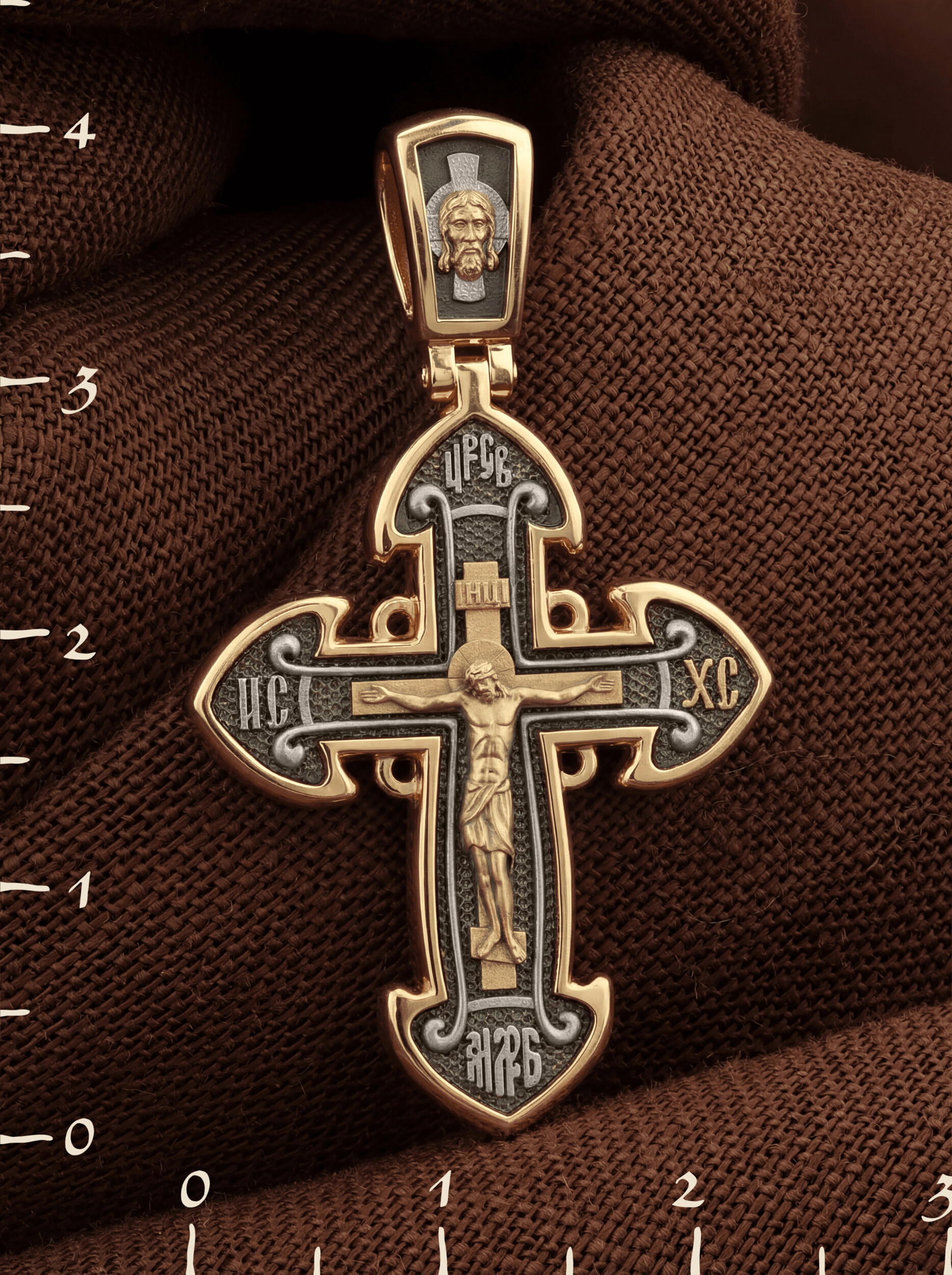 Традиционно на лицевой стороне этого креста изображено Распятие. Это связано с тем, что любой нательный крест в первую очередь символизирует крестные страдания Христа, Его смерть и Воскресение. Поэтому древний вид Распятия являет вознесенного на Крест Сына Божия не просто прибитого к кресту, а словно простирающего руки и призывающего в Свои объятия весь мир. Сохраняя образ страдания Христа, такой вид Распятия в то же время удивительно точно передает его духовный смысл. Христос, распятый и умерший, изображен живым в самой Своей смерти. С двух сторон раскинутых рук Христа написаны инициалы Его имени — «ИС ХС». Сверху над Распятием размещена надпись «Царь Славы», а у подножия Господа видна аббревиатура «МЛ РБ» (Место Лобное Рай Бысть), символизирующая гору Голгофу.