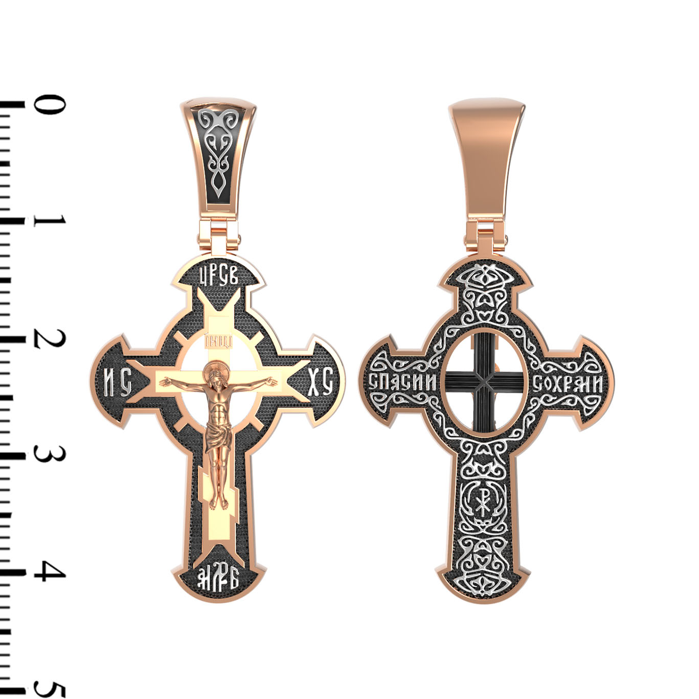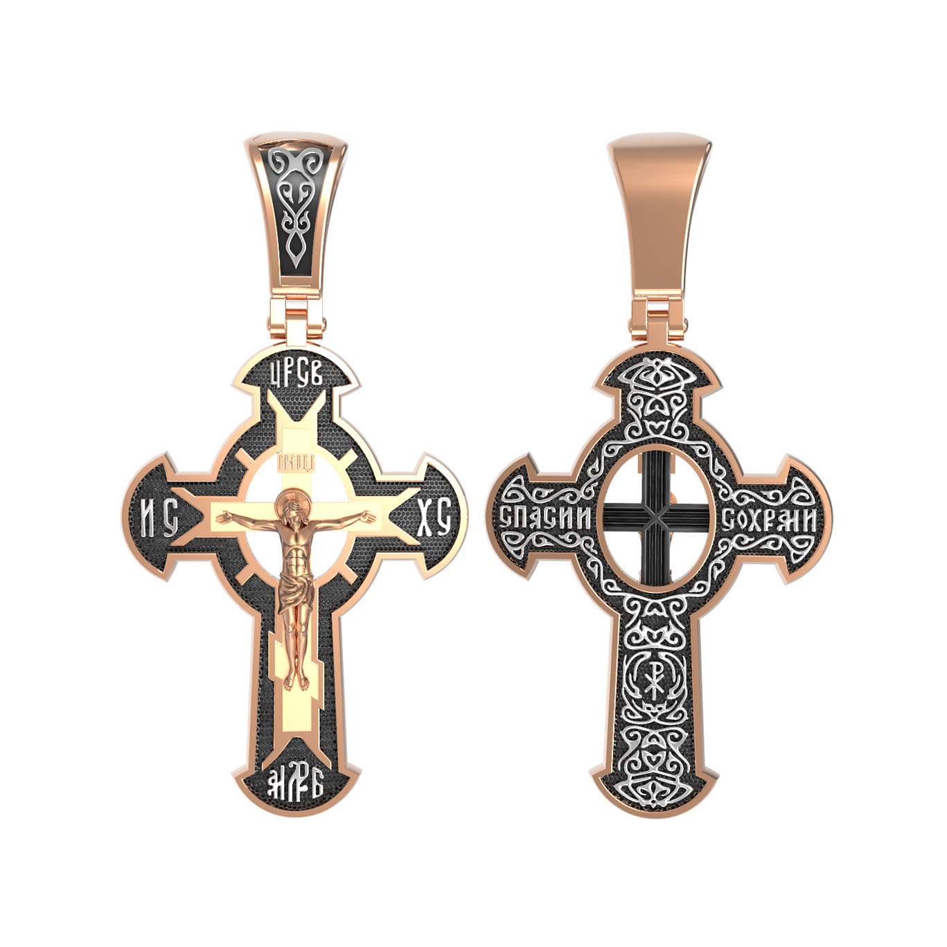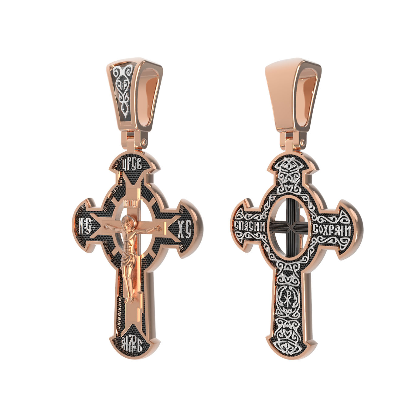 Оборотная сторона креста украшена растительным орнаментом. Помещенный на крест орнамент символизирует жизнедательную силу, животворное тепло креста. В растительный узор, на горизонтальной перекладине, вписано молитвенное славословие: «Спаси и сохрани». Эта надпись означает непрерывную молитву, совершаемую носителем данного креста.
