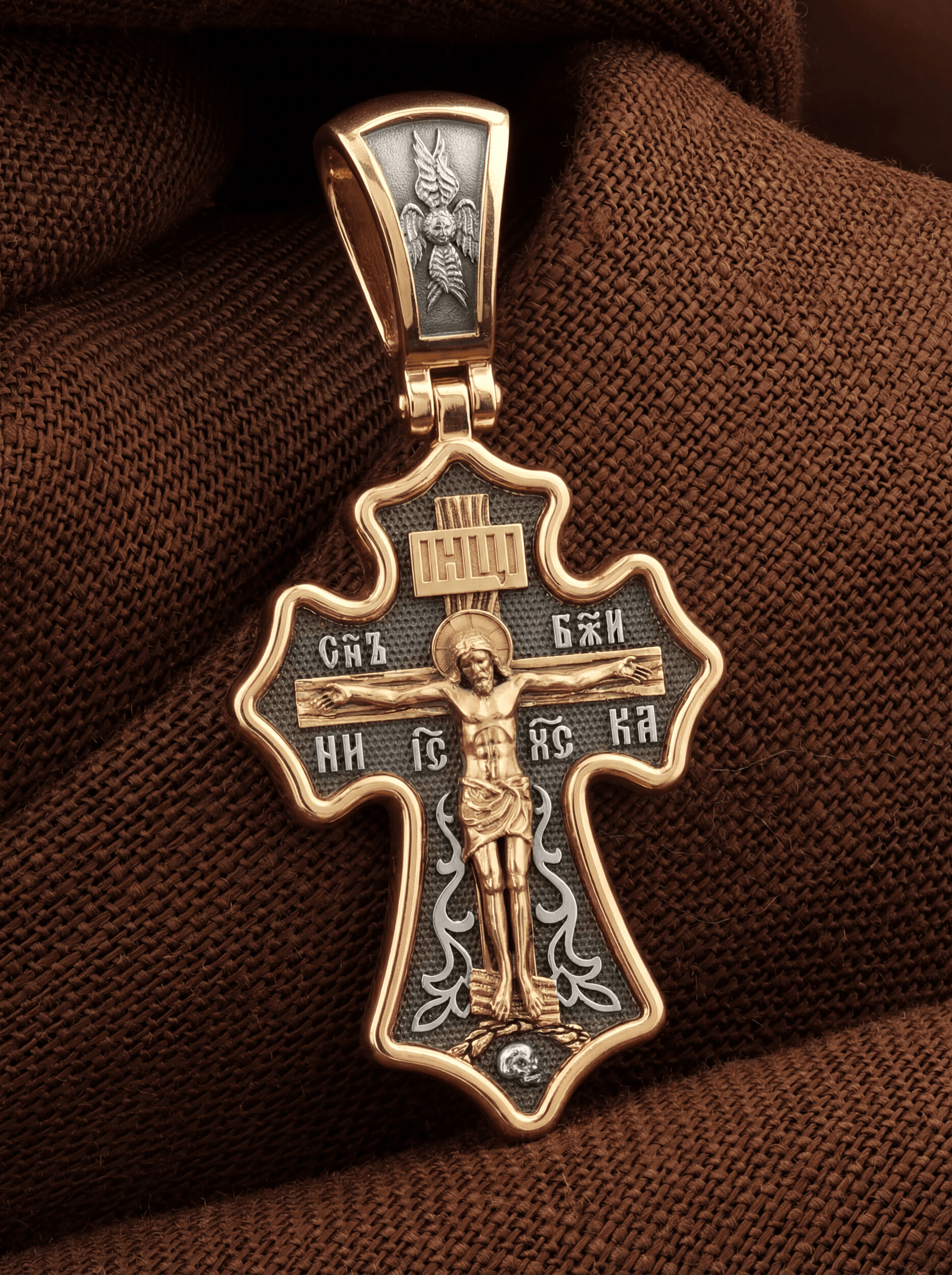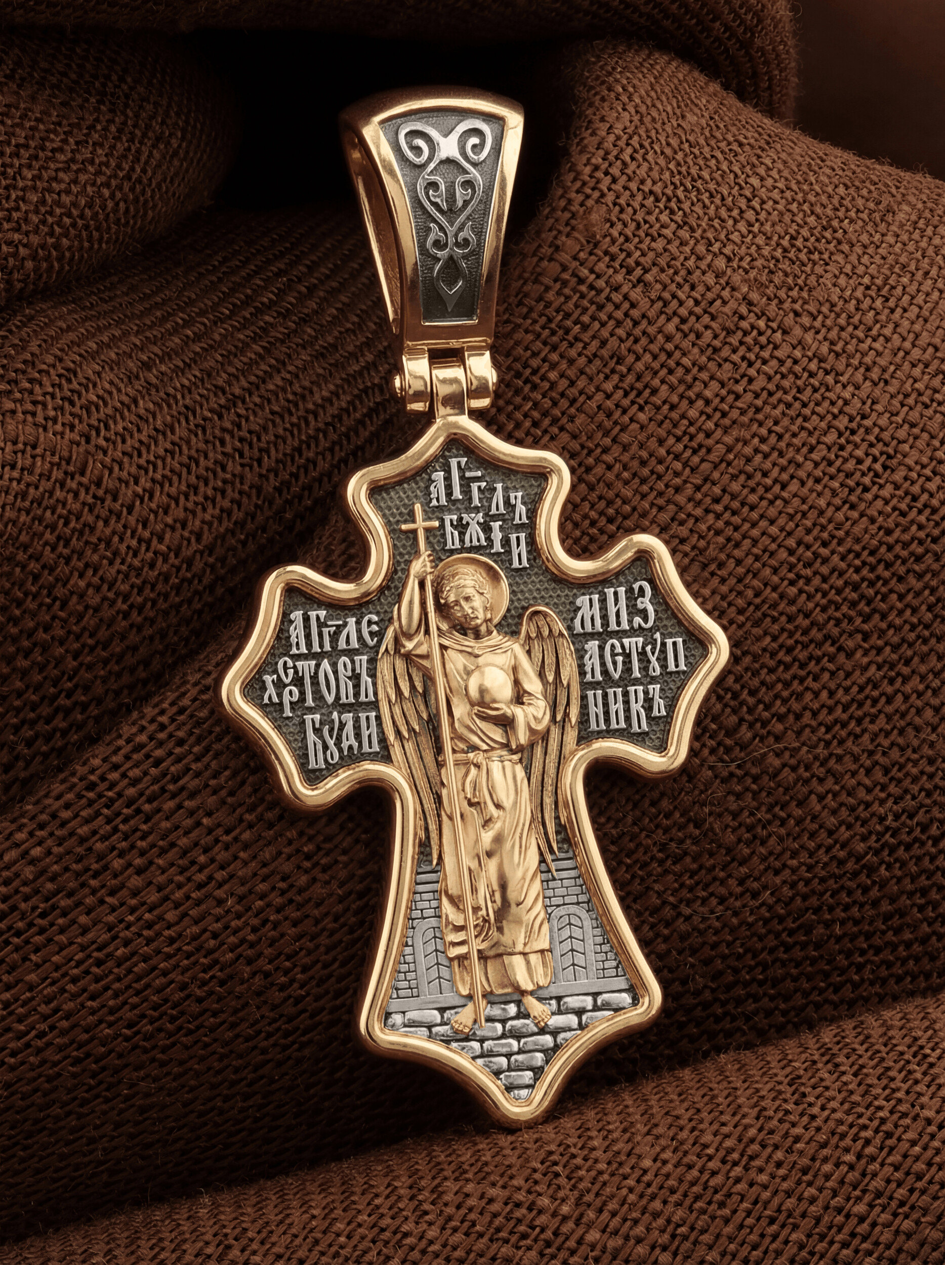 Оборотную сторону креста возглавляет Ангел Хранитель. Он защищает человека от злых духовных и физических нападений. Ангел не может нарушить свободу воли человека, поэтому его надо молитвенно просить о помощи. Вокруг его образа написана молитва: «Ангеле Христов, буди ми заступник».