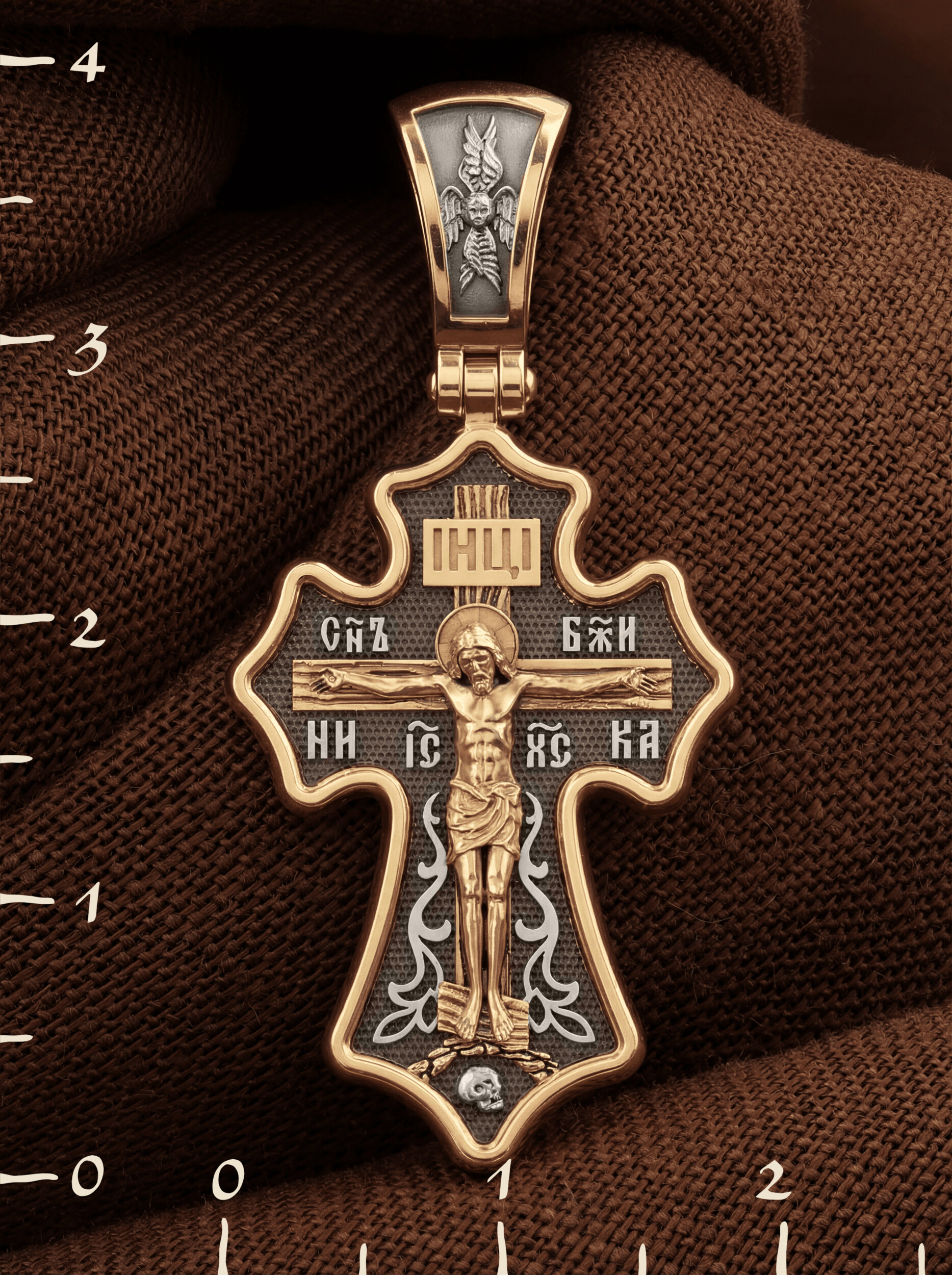 Основной композицией лицевой стороны является Распятие Господа Иисуса Христа. Позади Распятия видна иерусалимская стена, знак того, что Господь был распят вне стен города. Стена символизирует и Небесный Иерусалим, путь который открылся для человека через Голгофу. У подножья Господа в виде скалистой горки видна сама Голгофа с Главой Адамовой в пещере. Распятие сопровождается каноническими надписями. Это святое имя Христа, которое принято писать на иконах сокращенно — «ИС ХС», словосочетание «СЫН БОЖИЙ», что означает божественную природу Иисуса Христа, и надпись «НИКА» — «победитель». Над головой Господа на поперечной перекладине аббревиатура «IНЦI», что символизирует табличку, которая была прибита к Кресту, с надписью «Иисус Назорей Царь Иудейский».