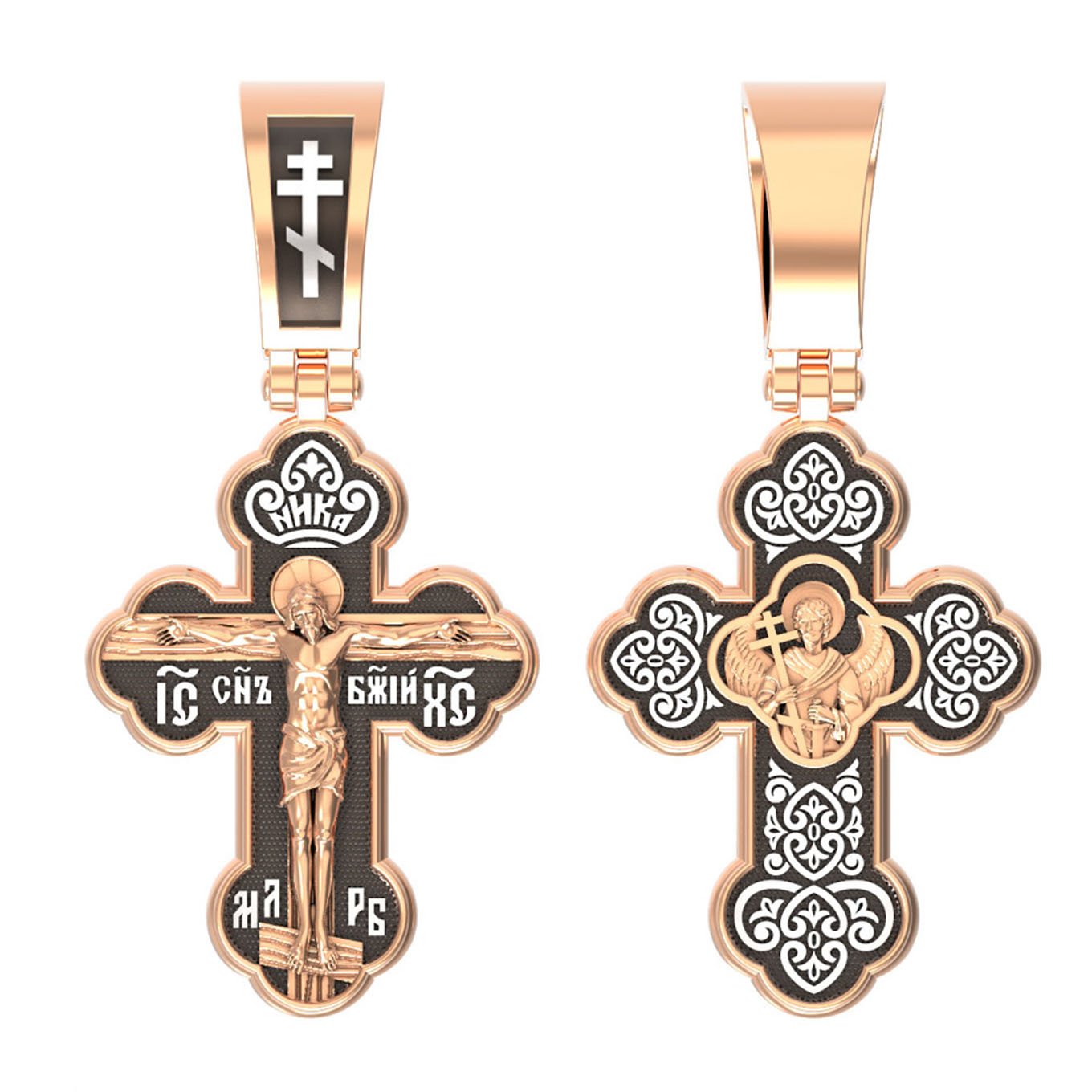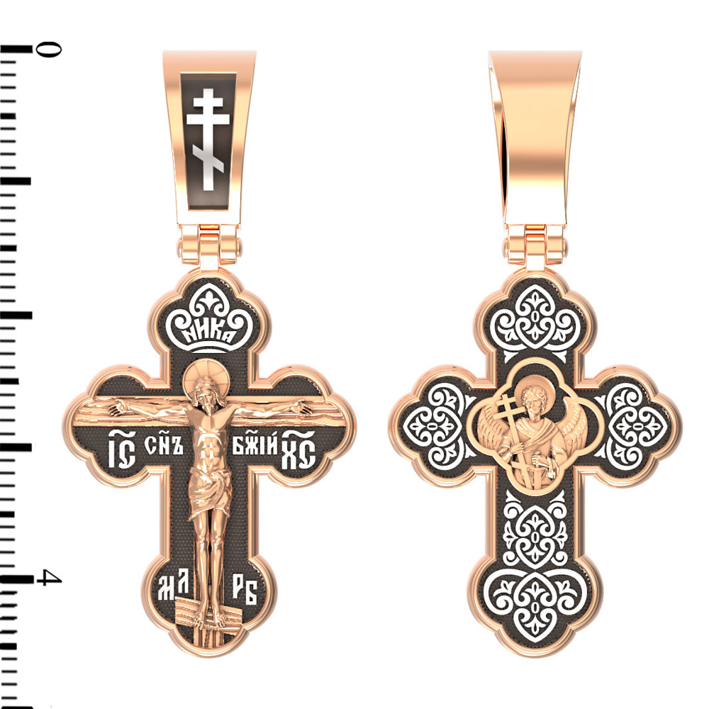 Крест нательный четырехконечный с трехлепестковыми завершениями перекладин. Основой композиции лицевой стороны креста является Распятие Иисуса Христа. С обеих сторон горизонтальной перекладины надписи — монограмма святого имени Христа — «ИС ХС», а под ней «Сын Божий». Над головой Христа надпись — «НИКА» (Победитель). В подножии мы видим изображенную гору Голгофу в виде скалистой горки, а так же буквы «МЛ» «РБ», которые означают: «Место Лобное Рай Бысть». Крест, на котором Спаситель мира принес Искупительную жертву, открыл врата рая, затворившиеся после грехопадения Адама. Поэтому Лобное место (Голгофа) стало раем.
