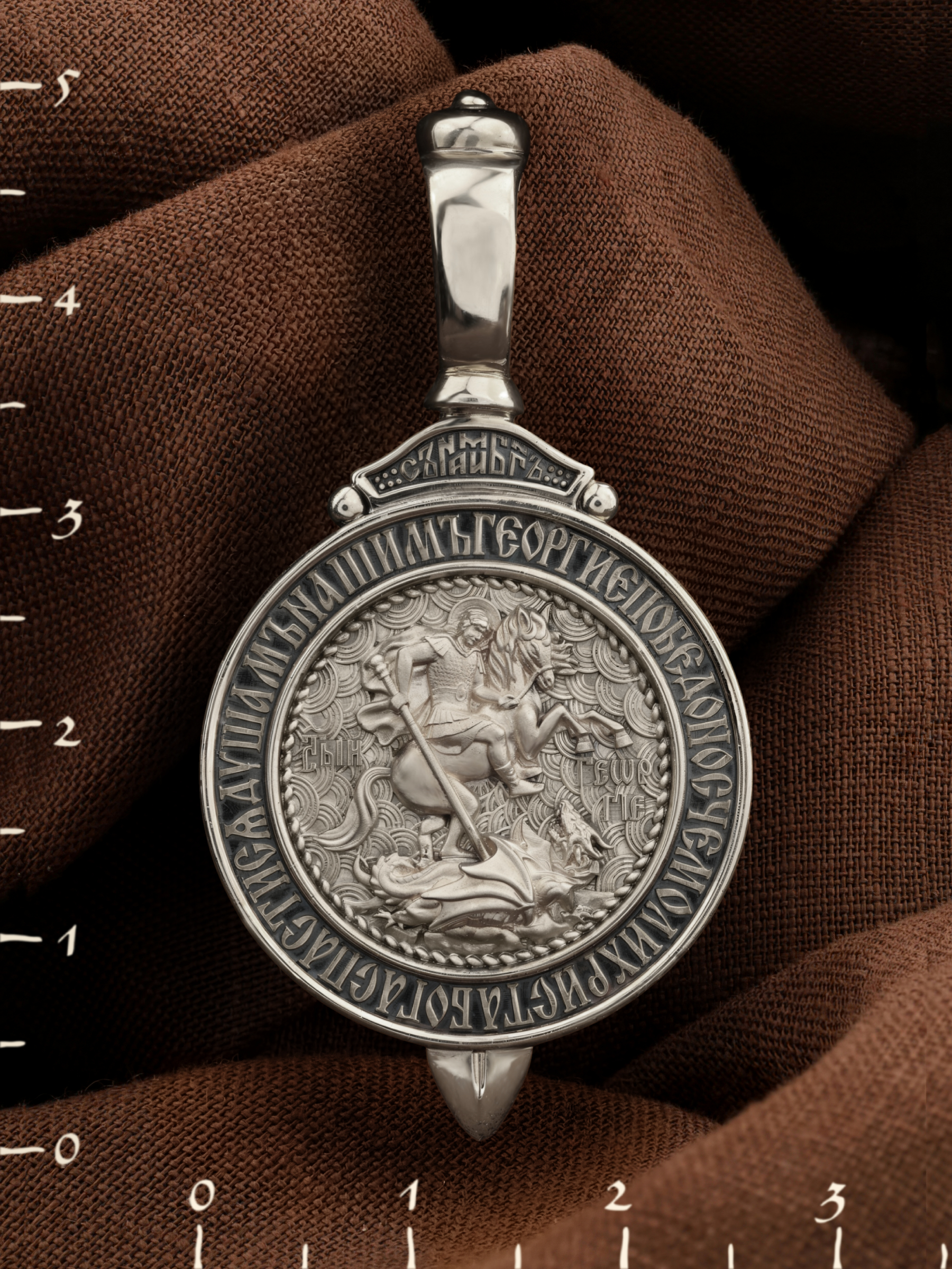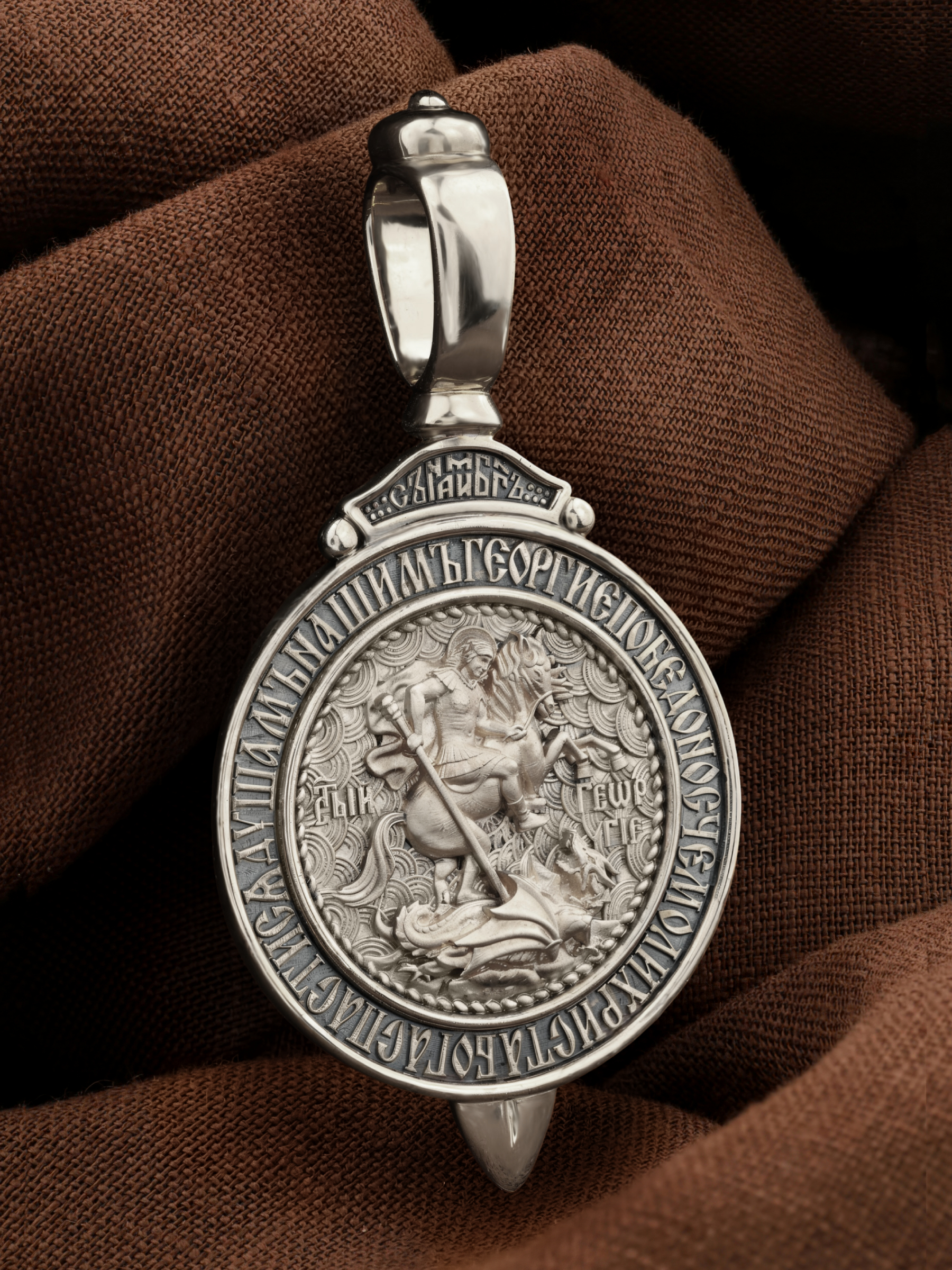 Основой композиции лицевой стороны является изображение Святого Великомученика Георгия Победоносца — одного из самых почитаемых и удивительных святых. На Руси он известен как Юрий или Егорий, покровитель воинов, помощник в крестьянском труде. На образке он изображен как воитель, сидящий на вздыбленном коне и поражающий копьем огнедышащего змея. Змей символизирует собою сатанинские силы. Молитвами вознесенными к Всевышнему и своей непреклонной верой он смог одолеть чудовище. Святой убил змея, спас царскую дочь, принесенную в жертву, и жителей города, их души от влияния дьявола, породив в них надежду и веру в Господа, призывая людей принять христианскую веру. Изображение святого великомученика Георгия Победоносца обрамлено словами молитвы: «Геогрие Победоносче, моли Христа Бога спастися душам нашим».