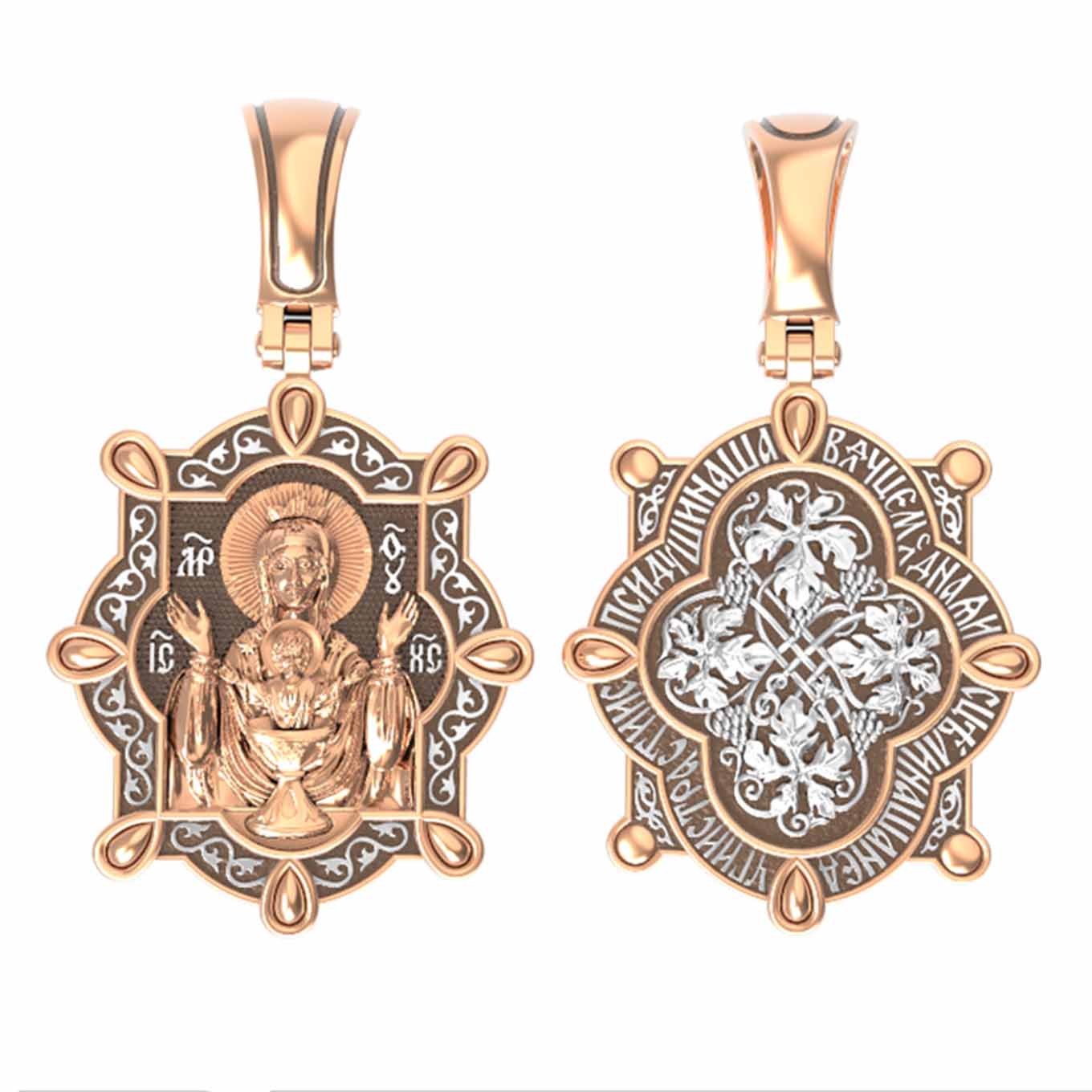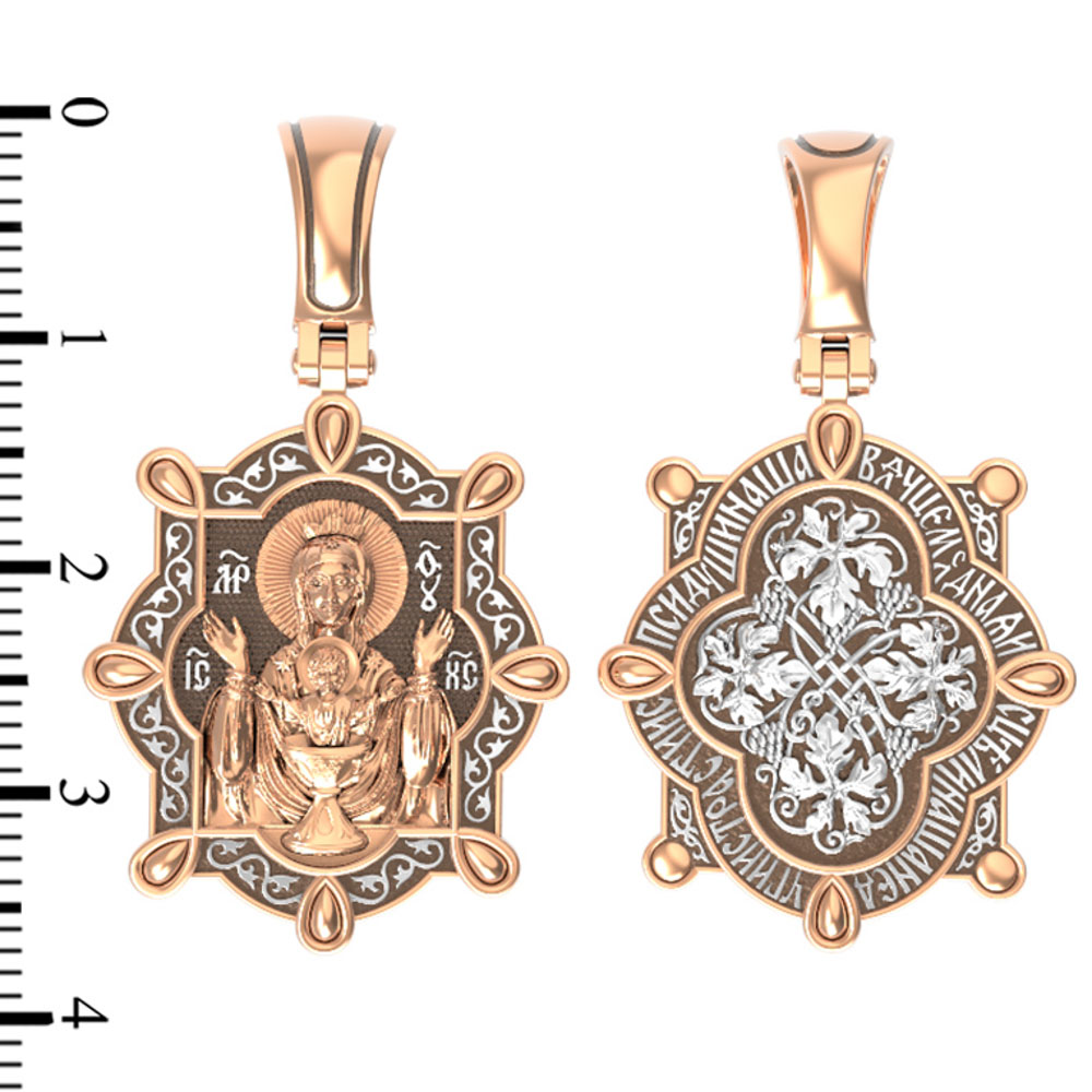 На лицевой части образка изображена икона Божией Матери «Неупиваемая чаша». Икона славится помощью в исцелении зависимостей, помогает людям обрести свободу от греховных страстей.