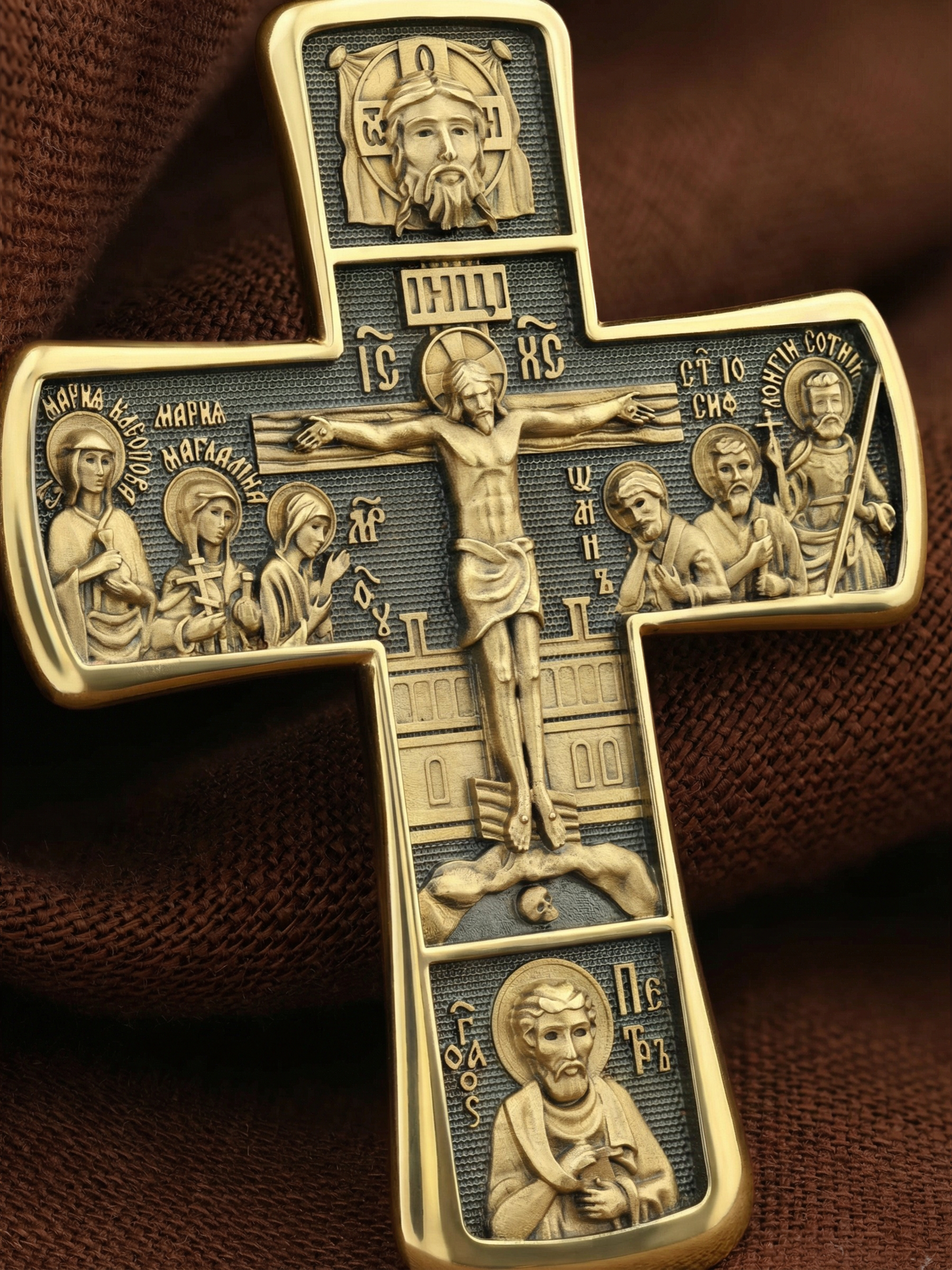 На лицевой стороне креста изображено Распятие Господа Иисуса Христа с предстоящими Ему святыми, которые, по преданию, находились у Креста Господа во время Его казни. Слева — Пресвятая Богородица и жены-мироносицы — равноапостольная Мария Магдалина и святая Мария Клеопова, справа — апостол Иоанн Богослов, прав. Иосиф Аримофейский и мч. Лонгин Сотник.