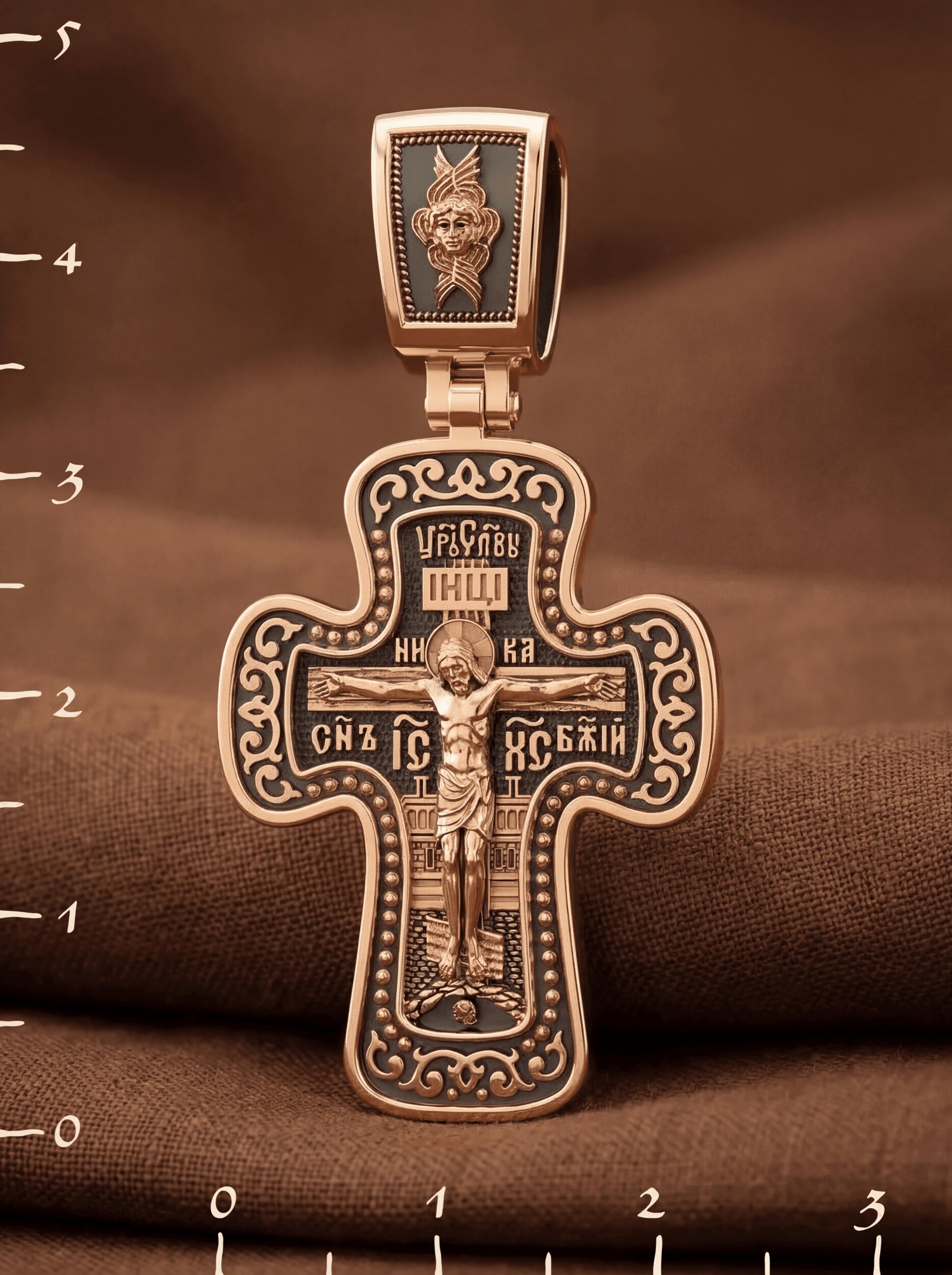 Распятие сопровождается каноническими надписями. Это святое имя Христа, которое принято писать на иконах сокращенно — «ИС ХС», словосочетание «СЫН БОЖИЙ», что означает божественную природу Иисуса Христа. Рядом с Его образом помещены слова «Царь Славы». Над головой Господа на поперечной перекладине аббревиатура «IНЦI», что символизирует табличку, которая была прибита к Кресту, с надписью «Иисус Назорей Царь Иудейский». На кулонном кольце помещено изображение Серафима.