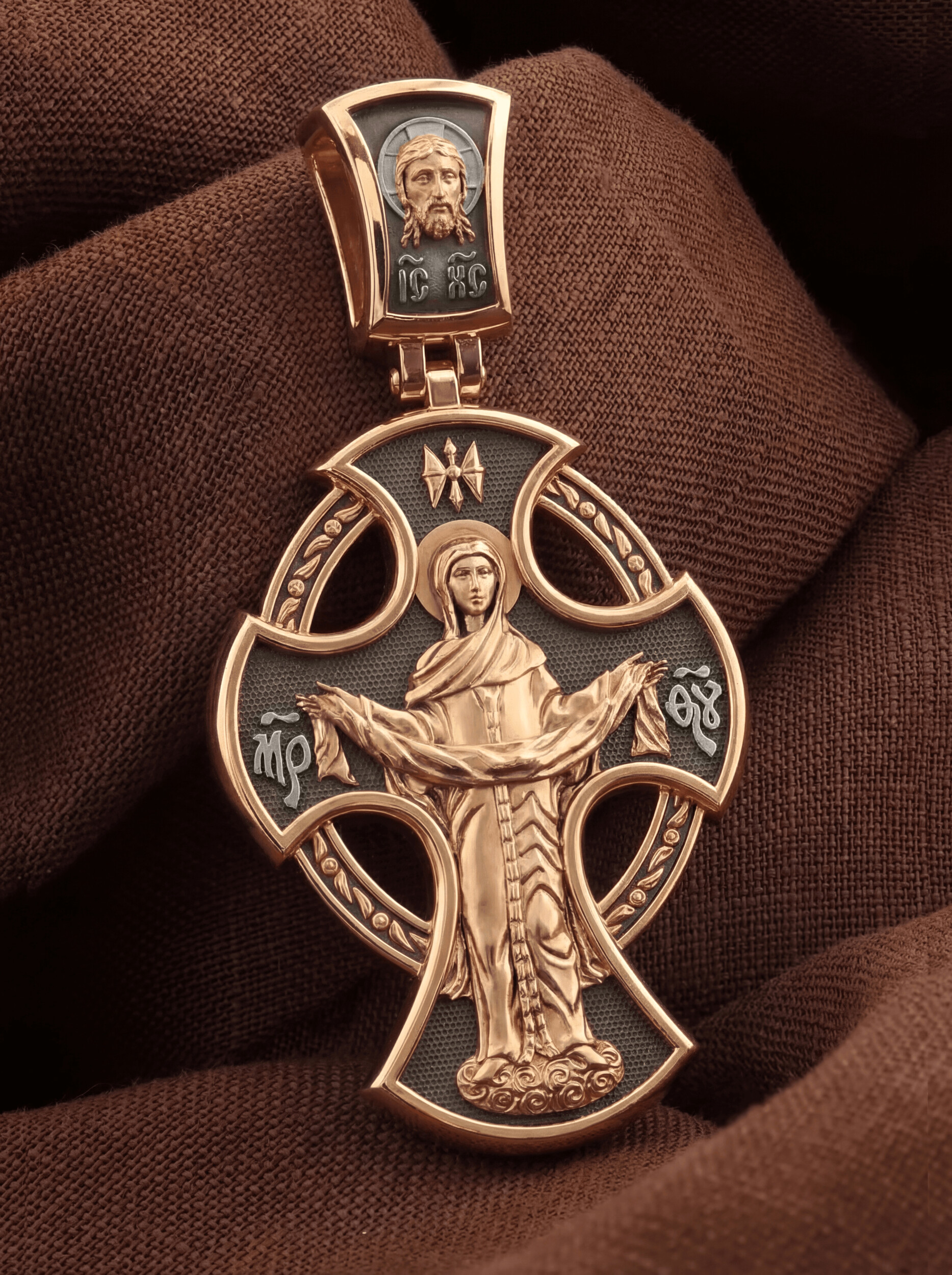На обороте креста изображена икона Покрова Пресвятой Богородицы. Праздник Покрова Божией Матери является воспоминанием чуда, которое произошло во Влахнернской церкви 1 (14) октября 910 года: Пресвятая Богородица явилась верующим над алтарем храма и распростерла над ними Свое покрывало. В этот день Божья Матерь открыла людям, что Она является Ходатаицей за них перед Богом. Богородица простирает Свой молитвенный покров над всеми православными христианами и умоляет Сына Своего о даровании вечного спасения каждому человеку. На кулонном кольце помещено изображение Спаса Нерукотворного — образ Спасителя, который Он запечатлел на плате и передал для исцеления больному проказой царю Эдессы. Ему придается победное и защитное значение.