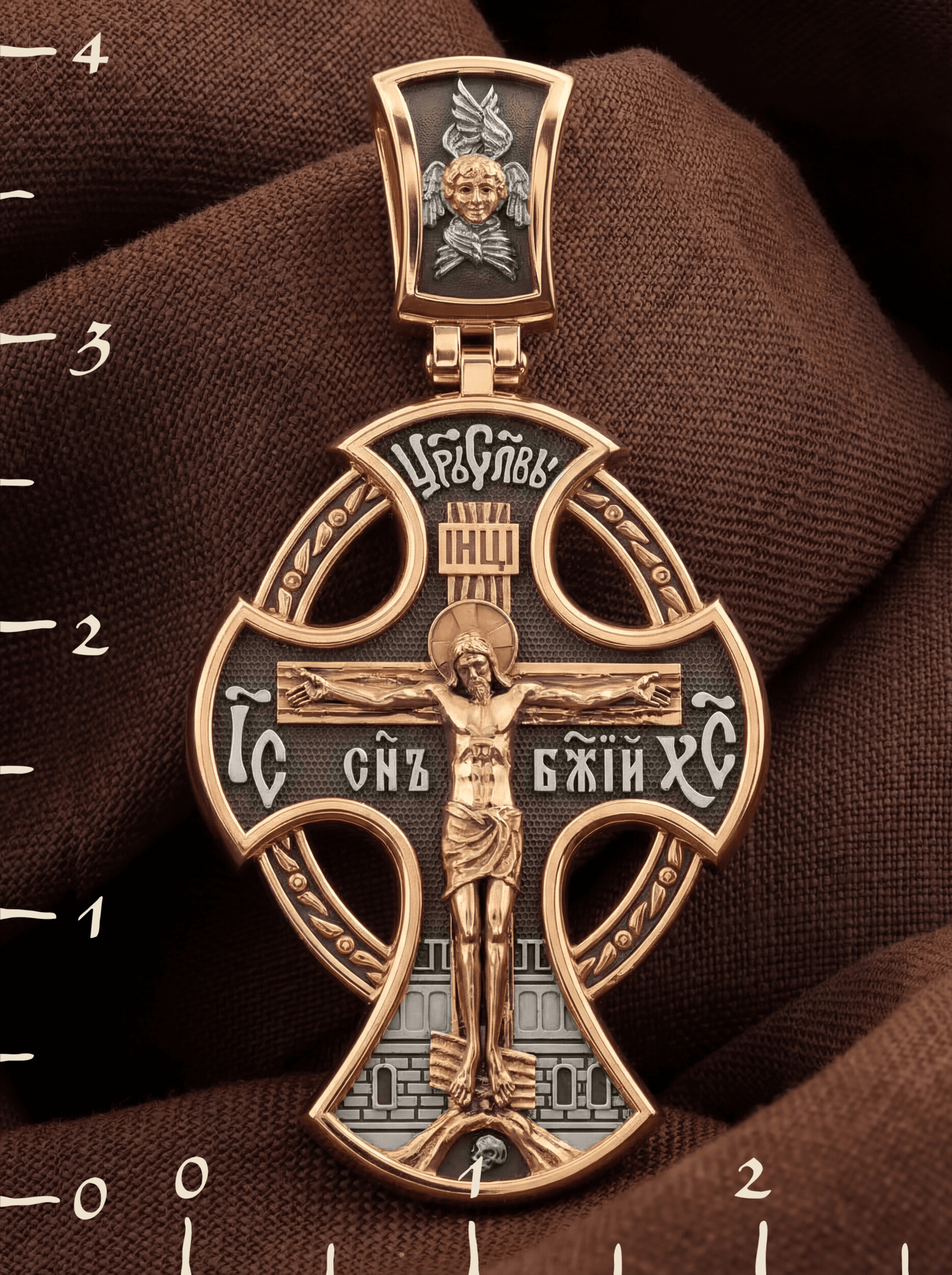На лицевой стороне креста изображено Распятие Иисуса Христа. Господь представлен свободно покоящимся на кресте с простертыми руками и как бы обнимающим всю Вселенную. Он — Спаситель, искупивший грехи мира, «поправший смертию смерть» и призывающий к Себе «все концы земли». Поэтому рядом с Его образом помещены слова «Царь Славы». Эти слова характеризуют Господа как Великого Архиерея, победителя смерти. Верхняя перекладина символизирует титло — табличку, на которой, согласно Евангелию, было начертано: Иисус Назорей Царь Иудейский (IНЦI). Также Распятие сопровождается надписями, олицетворяющими Христа. Это святое имя Христа «IC» (Иисус) «ХС» (Христос), и словосочетание «Сын Божий». Крест стоит на горе камней, символизирующих Голгофу, в основании которой различается череп. Это голова Адама. На кулонном кольце помещено изображение серафима.