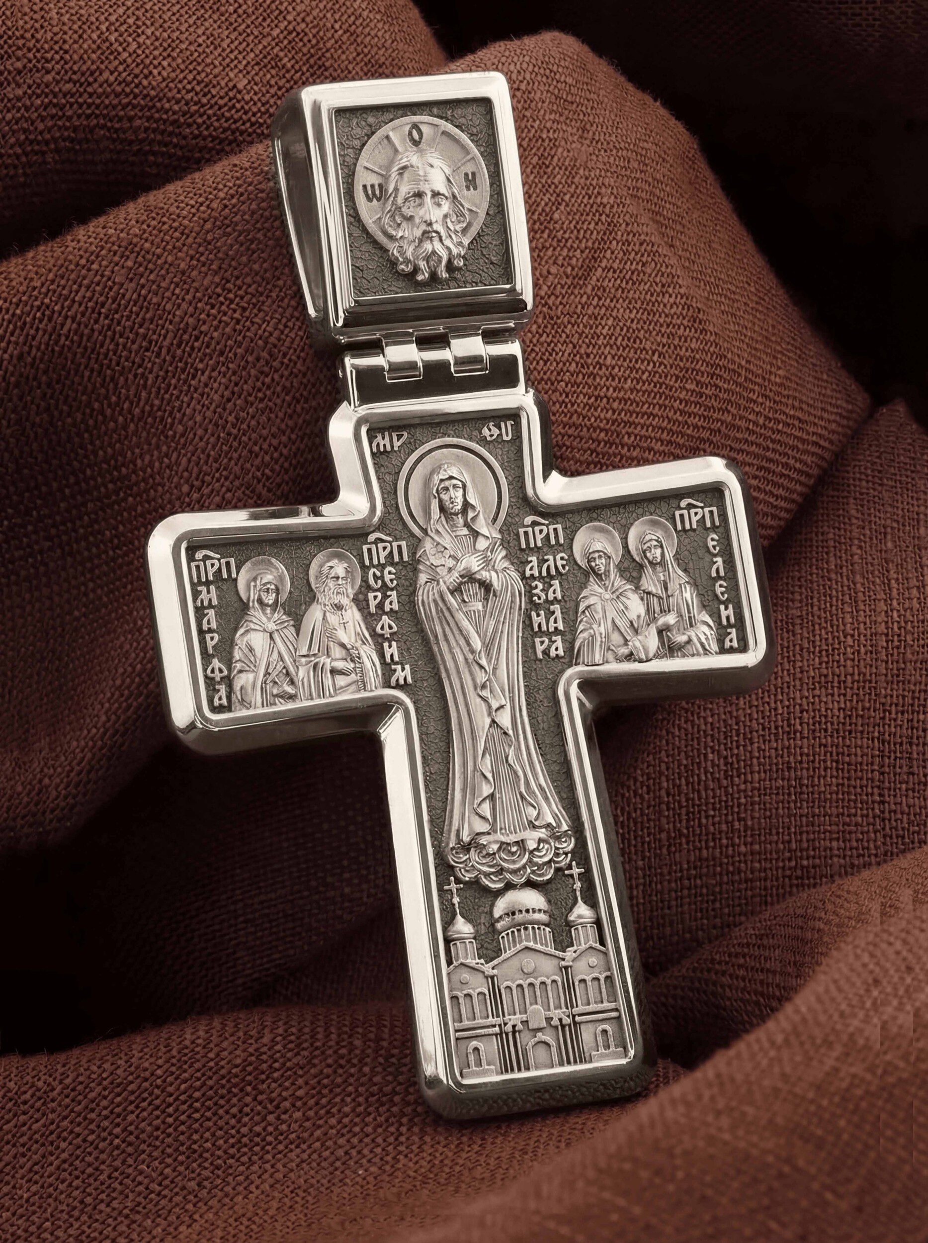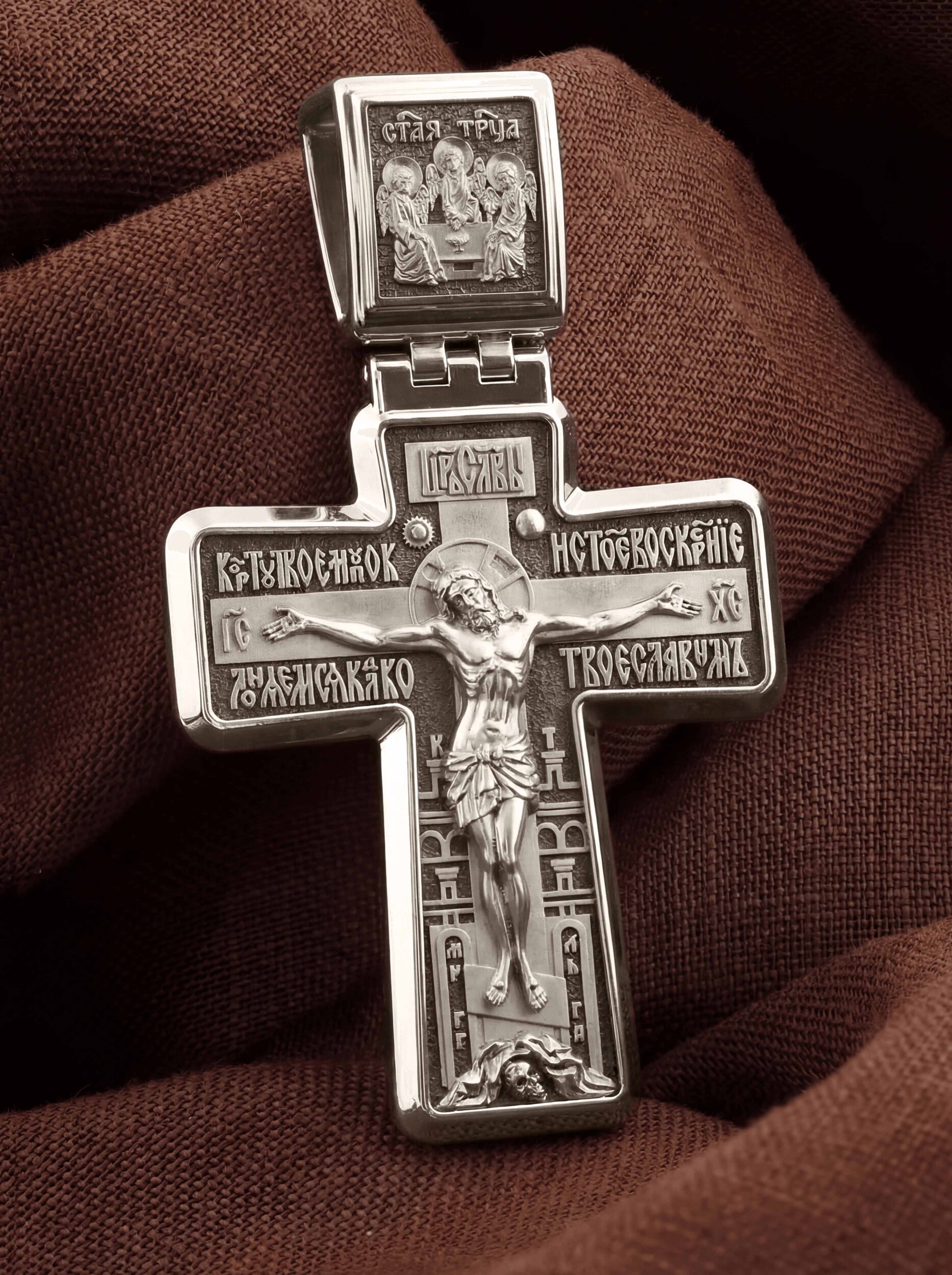 На лицевой стороне креста изображено Распятие Иисуса Христа. Позади Его изображена иерусалимская стена, знак того, что Господь был распят вне стен города. Но вместе с тем стена знаменует и Небесный Иерусалим, путь в который открылся для человечества через Голгофу: «МЛРБ», «Место Лобное Рай Бысть» — написано у ее основания. Рядом с Его образом помещены слова «Царь Славы». Эти слова характеризуют Господа, как Великого Архиерея, победителя смерти. Верхняя перекладина символизирует титло — табличку, на которой, согласно Евангелию, было начертано: «Иисус Назорей Царь Иудейский» (IНЦI). Также Распятие сопровождается надписями, олицетворяющими Христа. Это святое имя Христа «IC» (Иисус) «ХС» (Христос), а так же написан тропарь Животворящему Кресту: «Кресту Твоему поклоняемся, Владыко, и святое воскресение Твое славим». Распятие стоит на горе камней, символизирующих Голгофу, в основании которой различается череп. Это голова Адама. На кулонном кольце помещено изображение Святой Троицы.