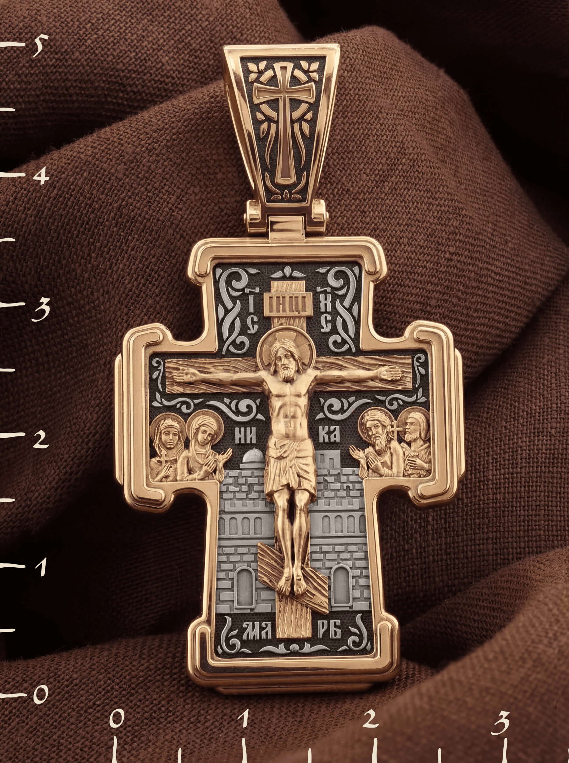 На лицевой стороне креста изображено Распятие Господа и Спасителя нашего Иисуса Христа. Крест- символ спасения и искупления рода человеческого, знамение победы над смертью и адом. Иисус Христос, как искупительная жертва освобождения человечества от власти греха, умер крестной смертью и в третий день воскрес. На верхней табличке, выше головы Иисуса, расположена надпись, составленная Понтием Пилатом — «IНЦI». Она означает «Иисус Назорей, Царь Иудейский». Рядом расположена надпись «IС» « ХС». Она означает Иисус Христос. Ниже — слово «НИКА», что означает «победитель». Слева от Распятия — Пресвятая Богородица и святая мироносица Мария Магдалина с крестом в руке. Справа — апостол и евангелист Иоанн Богослов, один из ближайших учеников Иисуса Христа, и сотник Лонгин с крестом в правой руке и копьем — в левой. За крестом высится Иерусалимская стена. Надпись «МЛРБ» — «место лобное рай бысть» означает, что место лобное стало раем, помещается в нижней части креста. На кулонном кольце помещен крест.