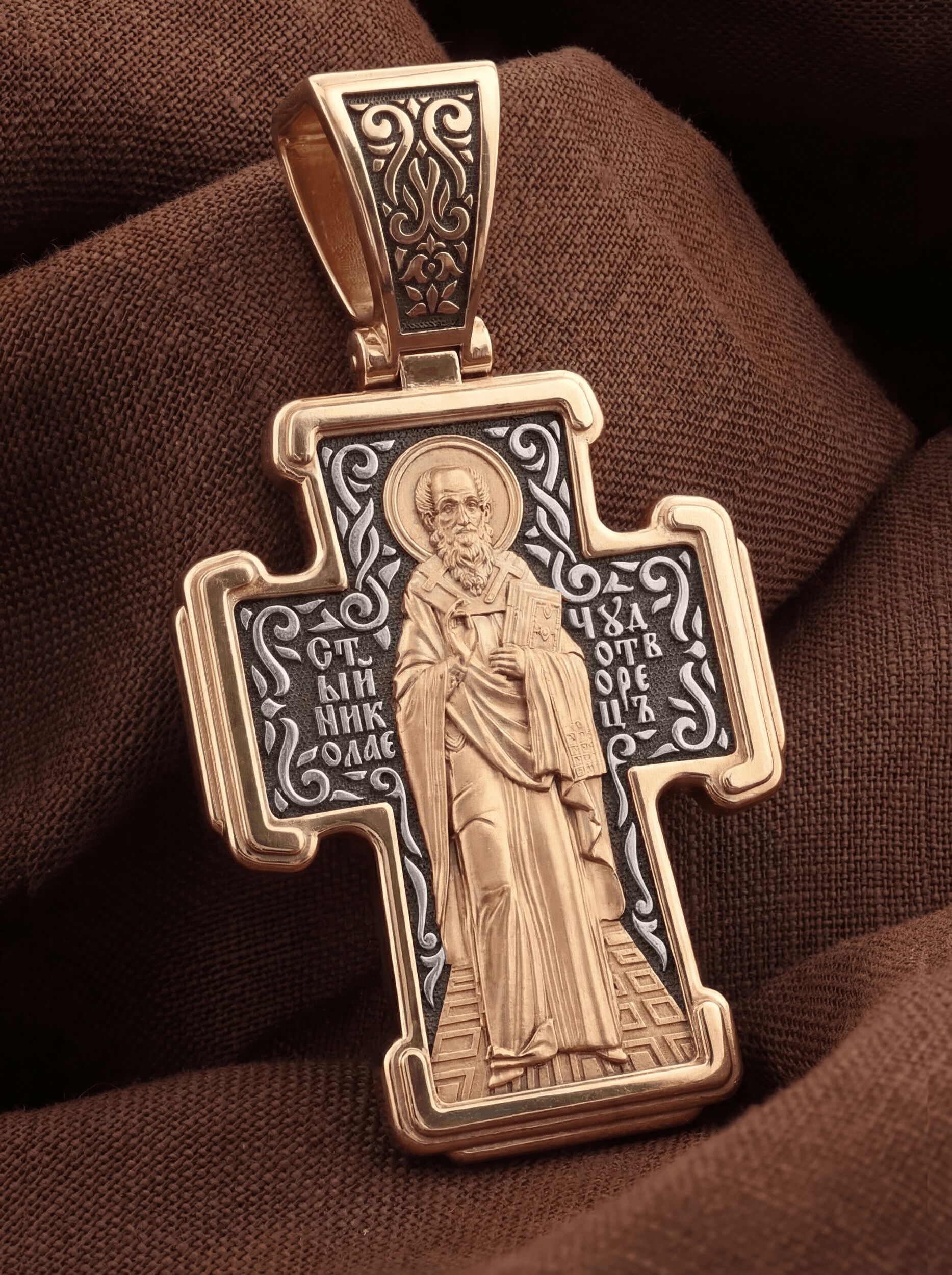 На оборотной стороне креста изображен Святитель Николай архиепископ Мир Ликийских, Чудотворец. Он является одним из самых почитаемых святых в православном мире. Святитель Николай родился во второй половине III века в Малой Азии в Ликийском городе Патары. С рождения Божий Угодник проявлял необыкновенные дарования. Сохранилось Предание, что во время крещения он, никем не поддерживаемый, простоял в купели три часа. Вся жизнь святого Николая — это служение Богу. Много великих и преславных чудес сотворил на земле и на море великий Святитель Николай Угодник. Он помогал сущим в бедах, укрощал штормы, спасал от потопления и выносил на сушу из глубины морской, освобождал из плена и приносил освобожденных домой, избавлял от уз и темницы, защищал от посечения мечом, освобождал от смерти и подавал многим различные исцеления, слепым прозрение, хромым хождение, глухим слух, немым дар слова.