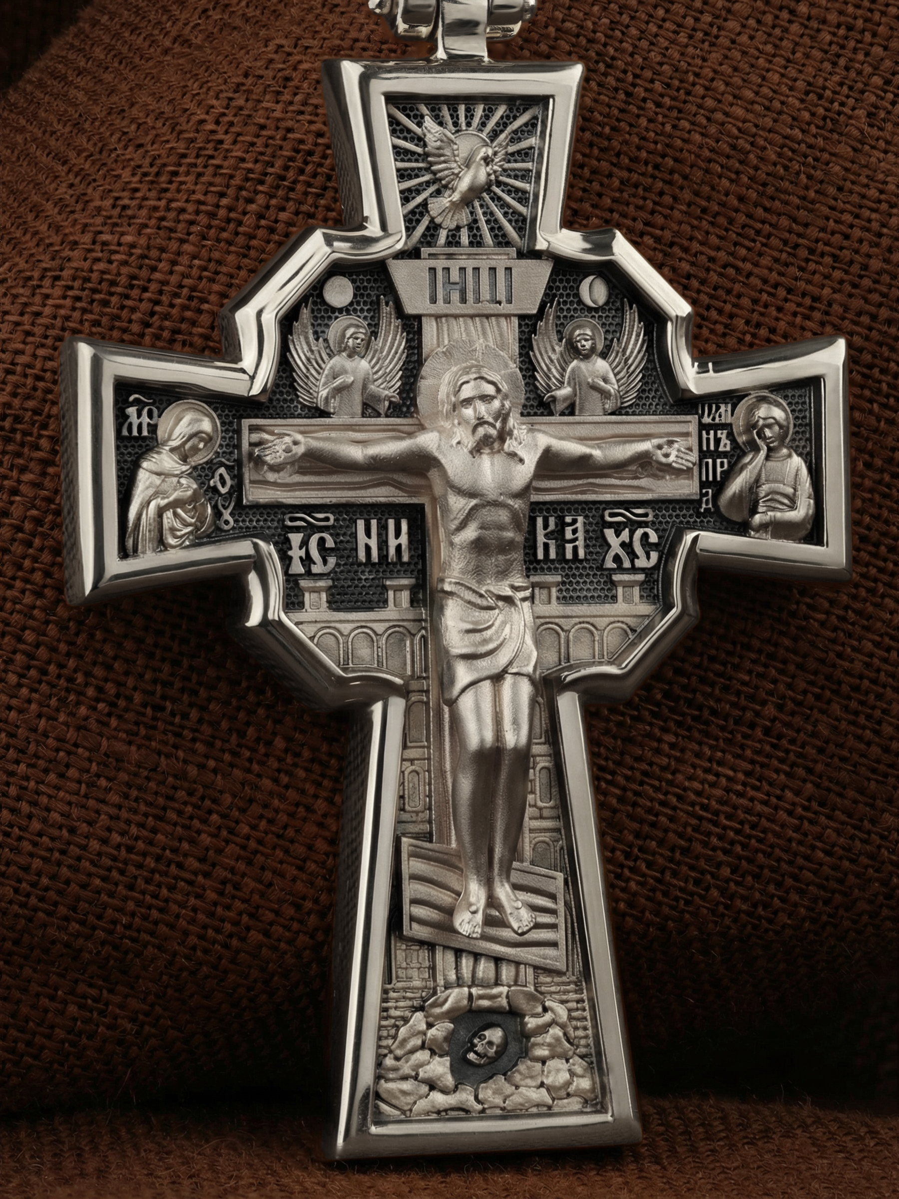 На лицевой стороне креста изображено Распятие Господа и Спасителя нашего Иисуса Христа, отдавшего Себя на смерть, для искупления грехов мира. Верхняя перекладина символизирует титло — табличку, на которой, согласно Евангелию, было начертано: Иисус Назорей Царь Иудейский (IНЦI). Распятие сопровождается надписями, олицетворяющими Христа. Надпись «IС» « ХС», что означает Иисус Христос, и слово «НИКА», что означает «победитель», помещаются ниже поперечной перекладины креста. Над вершиной Распятия помещено изображение Святого Духа, в виде голубя сходящего с небес, и двух Ангелов. Слева от Распятия изображена Пресвятая Богородица, справа — апостол и евангелист Иоанн Богослов, один из ближайших учеников Иисуса Христа. За крестом высится Иерусалимская стена, в знак того, что Господь был распят вне стен города. Возвышение, на котором стоит Крест, символизирует гору Голгофу, на которой произошло Распятие. Под подножием Креста изображена покоящаяся голова (череп) Адама. На кулонном кольце помещено изображение шестикрылого Серафим.