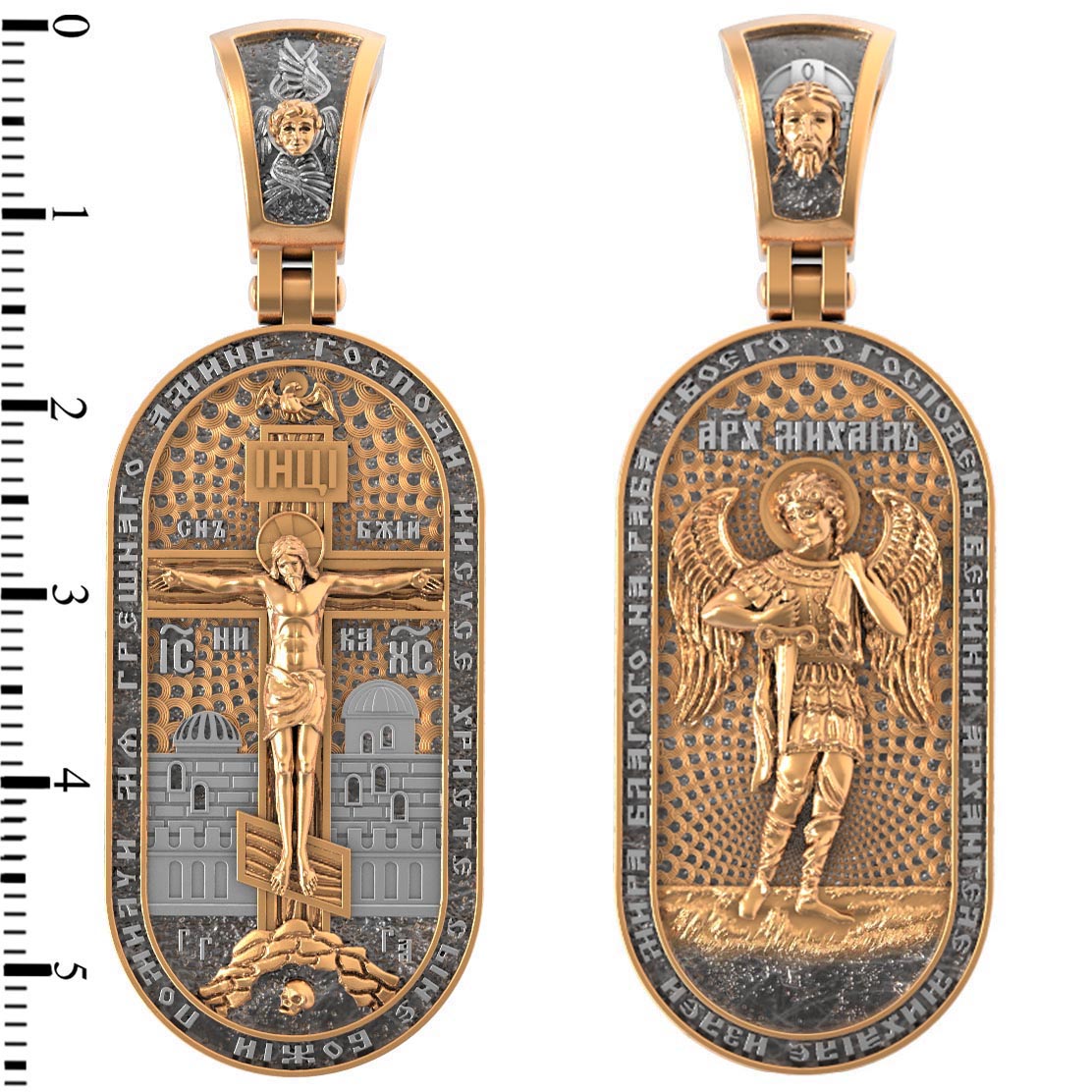 Основой композиции оборотной стороны является ростовое изображение Архангела Михаила — Архистратига всех Небесных Воинств. Он ведет непримиримую войну против сил зла, охраняет райские врата и защищает души людей. По контуру написана молитва: «О, Господень Великий Архангеле Михаиле, излей мира благого на раба Твоего». На кулонном кольце изображен Спас Нерукотворный — Символ вочеловечившегося Божества.