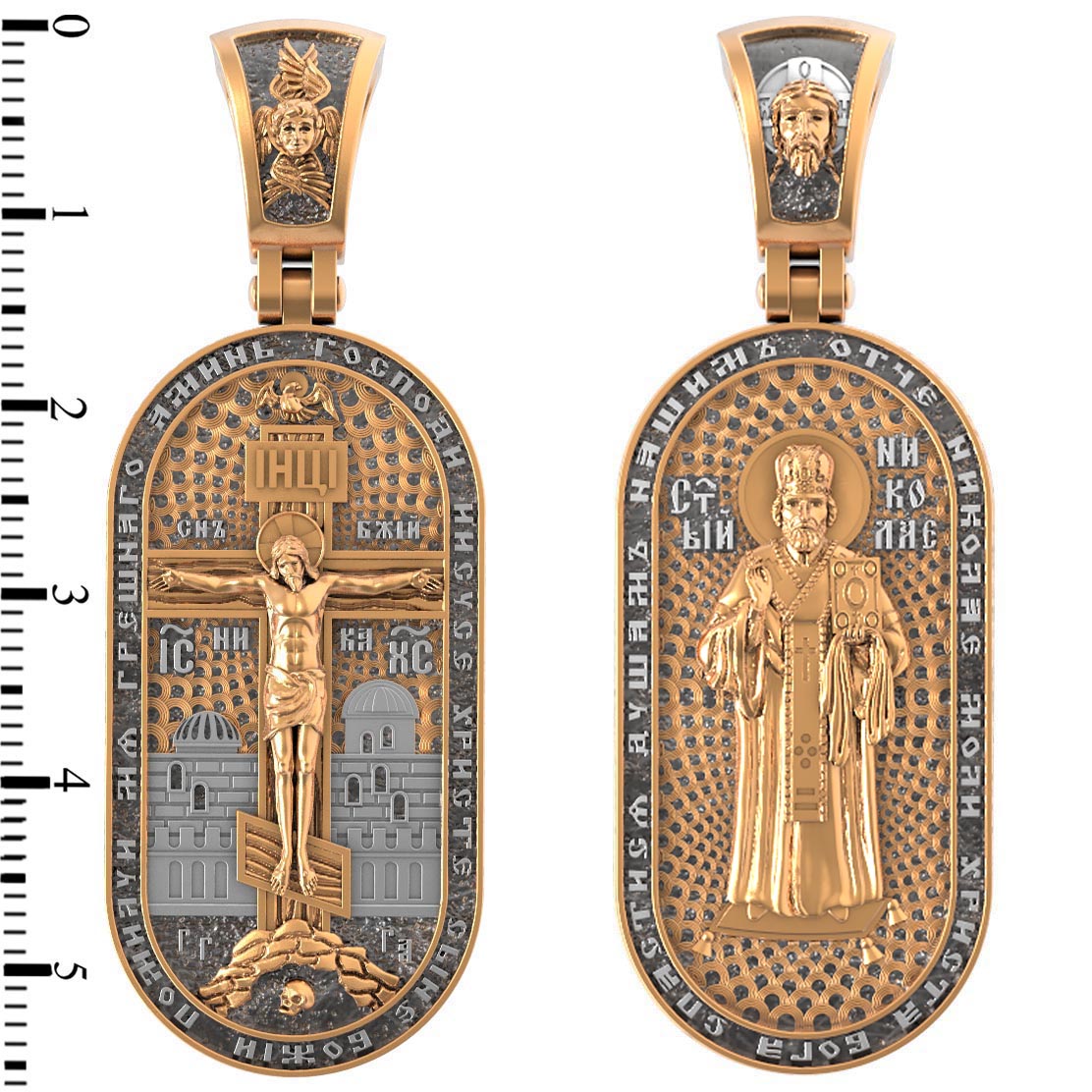 На оборотной стороне изображен Святой Николай Чудотворец, которого еще называют Николай Угодник — помощник в делах, покровитель учащихся, утешитель обиженных и нуждающихся, целитель самых страшных и тяжелых недугов, предстатель и молитвенник за людей перед Богом. Также Святитель Николай Чудотворец известен своими молитвами за путешественников, когда непрестанный ветер и бушующие волны утихают и корабль заходит в спокойную гавань. По контуру написана молитва: «Отче, Николай, моли Христа Бога спастися душам нашим». На кулонном кольце помещено изображение Спаса Нерукотворного.