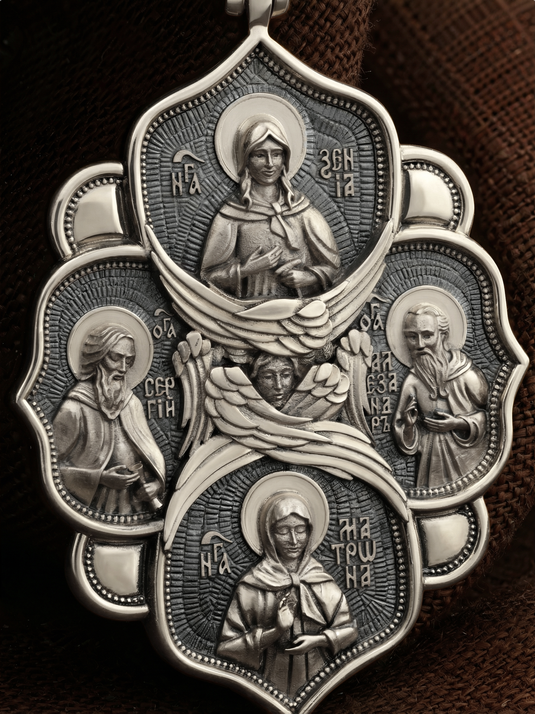 На обороте образка изображены четверо возлюбленных Богом угодников. В центр иконы помещен шестикрылый Серафим, огненный ангел, ближе всех предстоящий Божественному Престолу. Слева от Серафима изображен преподобный Сергий Радонежский— великий чудотворец Русской земли, почитаемый как целитель, помощник в бедственных обстоятельствах, покровитель воинов и учащихся. Во главе образка изображение Спаса Нерукотворного — образ Спасителя, который Он запечатлел на плате и передал для исцеления больному проказой царю Эдессы. Ему придается победное и защитное значение.