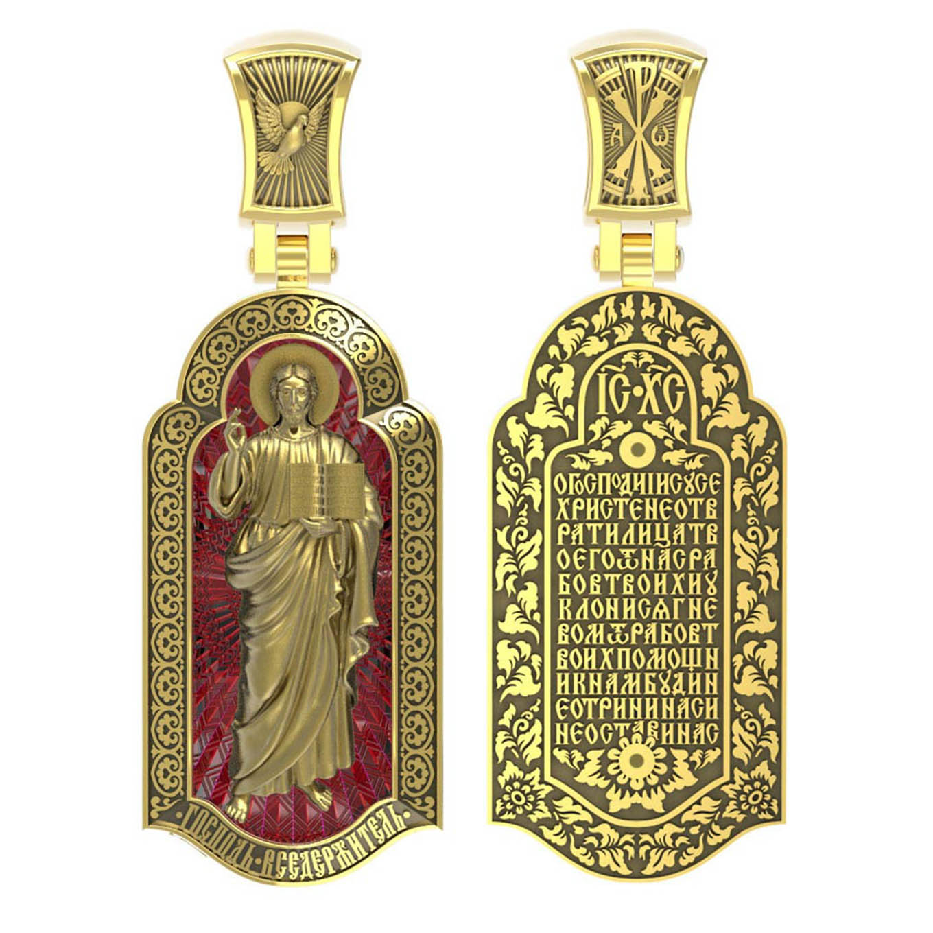 На лицевой стороне креста изображен Иисус Христос в образе Вседержителя, по-гречески «Пантократор». Это древнейший образ Спасителя, на котором Он представлен как властелин и правитель мира. Христос держит в руках Книгу, которая символизирует Книгу Бытия, то есть весь сотворенный Богом мир. В этой Книге судьбы всех людей, живущих на земле. Часто эту Книгу образно называют Книгой Жизни. Первое дошедшее до нас подобное изображение датируется VI веком и хранится в монастыре Святой Екатерины на горе Синай. Такие образы Христа с глубокой древности писались и в Палестине. Но Святая земля так часто подвергалась разграблению завоевателями, что древних икон там не осталось. Большинствоикон в храме Воскресения Христова были созданыв XIX веке.