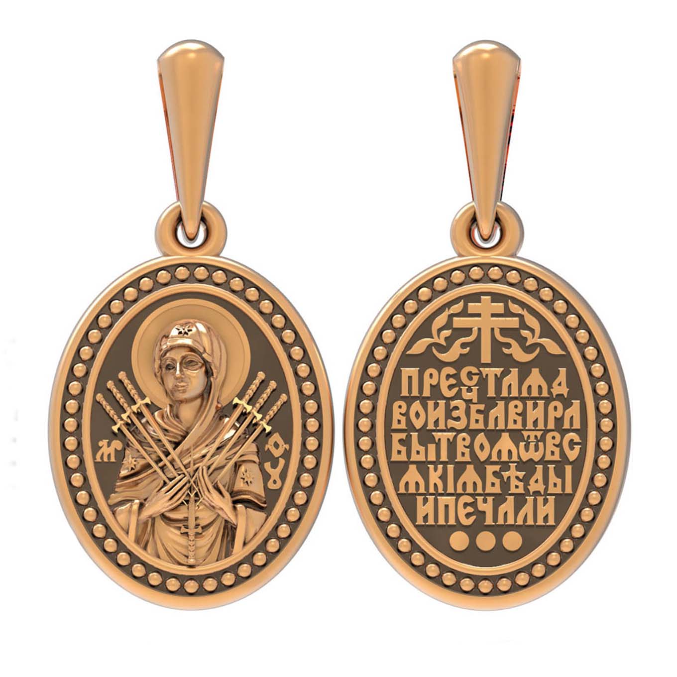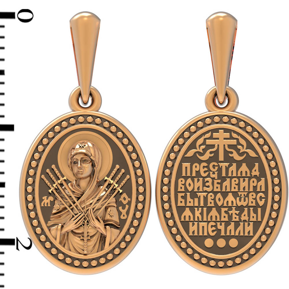На лицевой стороне образка изображена икона Пресвятой Богородицы «Семистрельная» — одна из самых чудотворных икон на Руси. На протяжении многих веков христиане взывали к Царице Небесной через эту икону, если в стране начинались войны или мятежи.